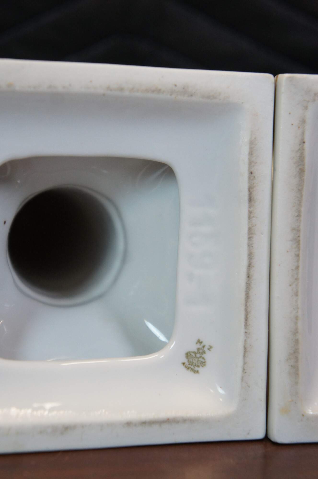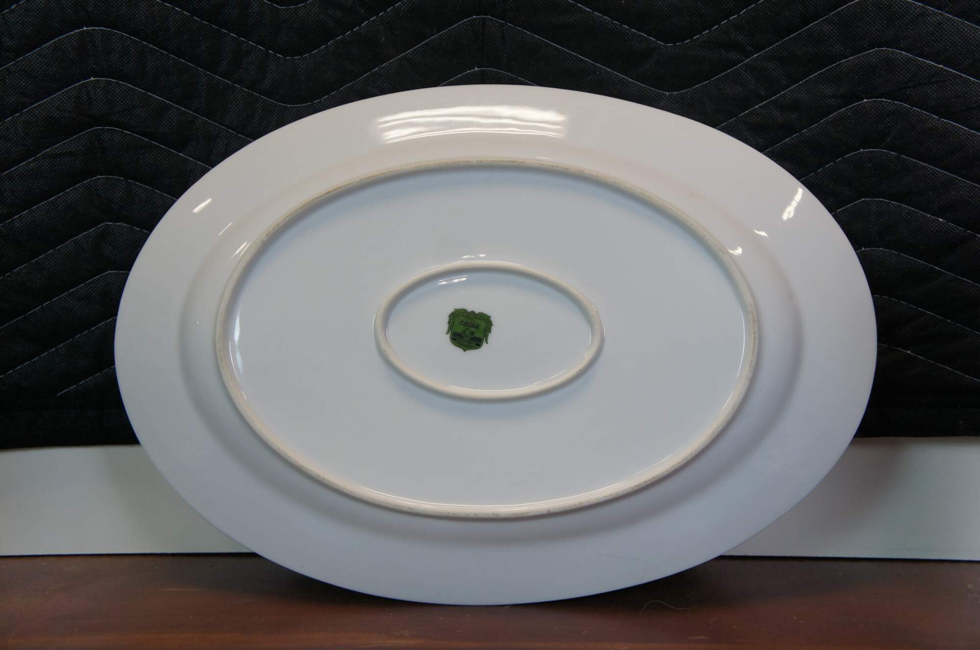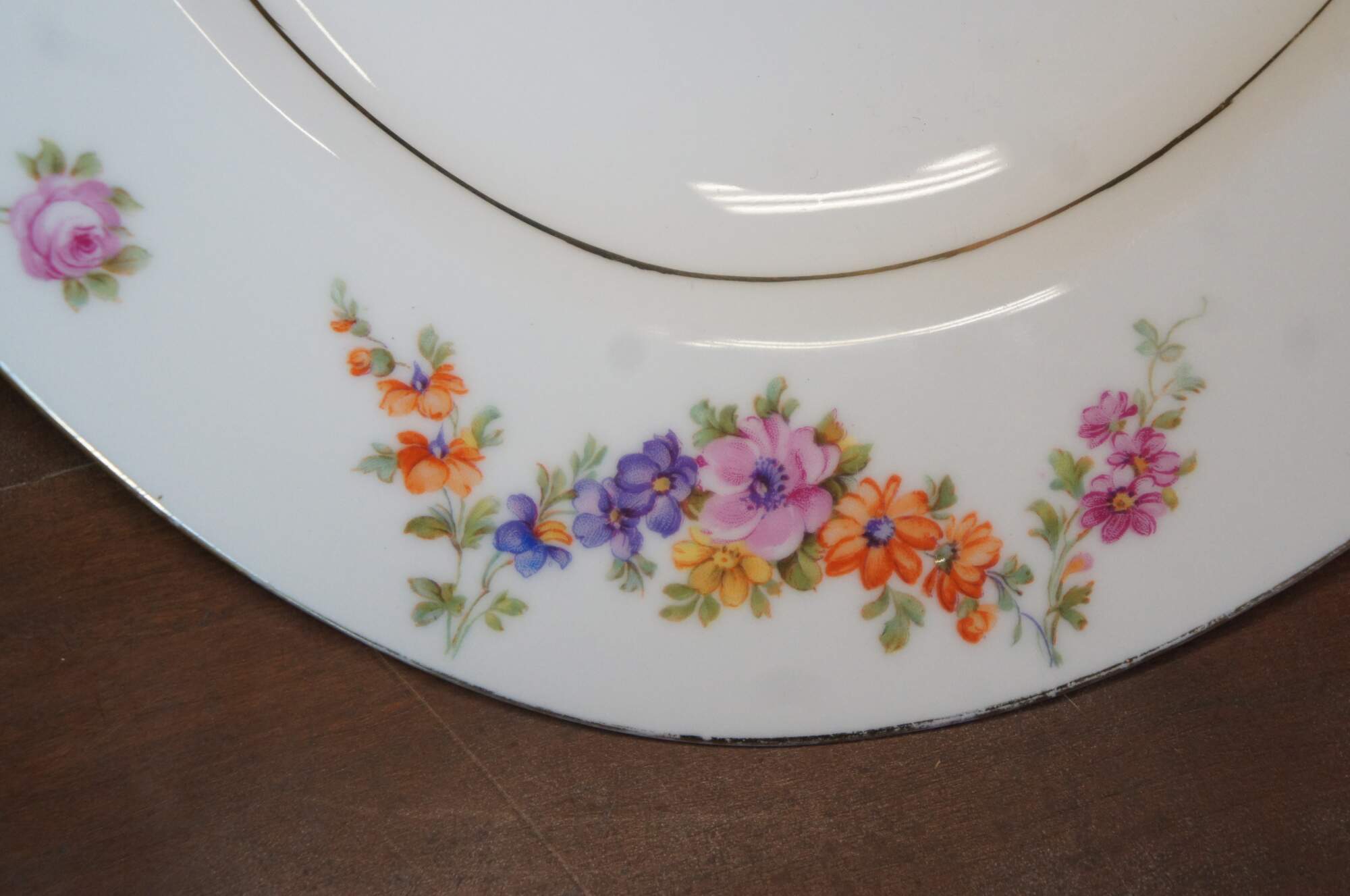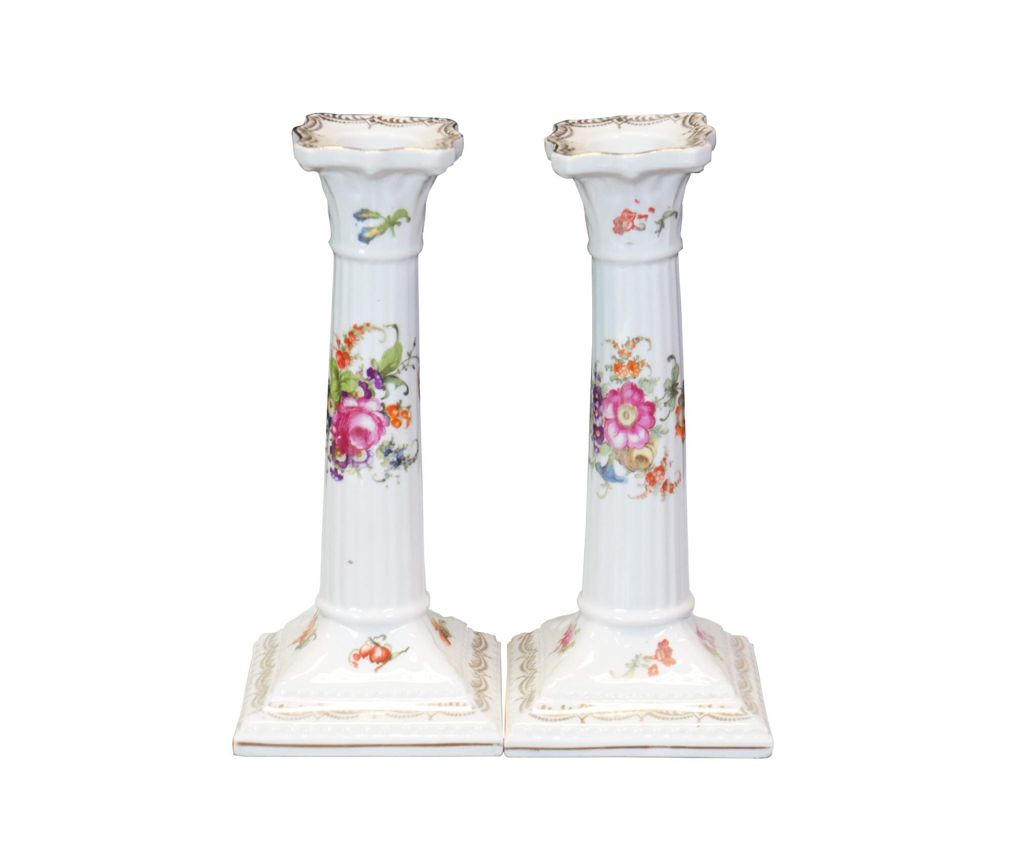 Mid to late 20th century Dresden style porcelain tableware including an oval serving platter by EPIAG Germany and a pair of square base, column shaped candlesticks by MZ Austria, both decorated with a multicolor floral motif and gilt details.