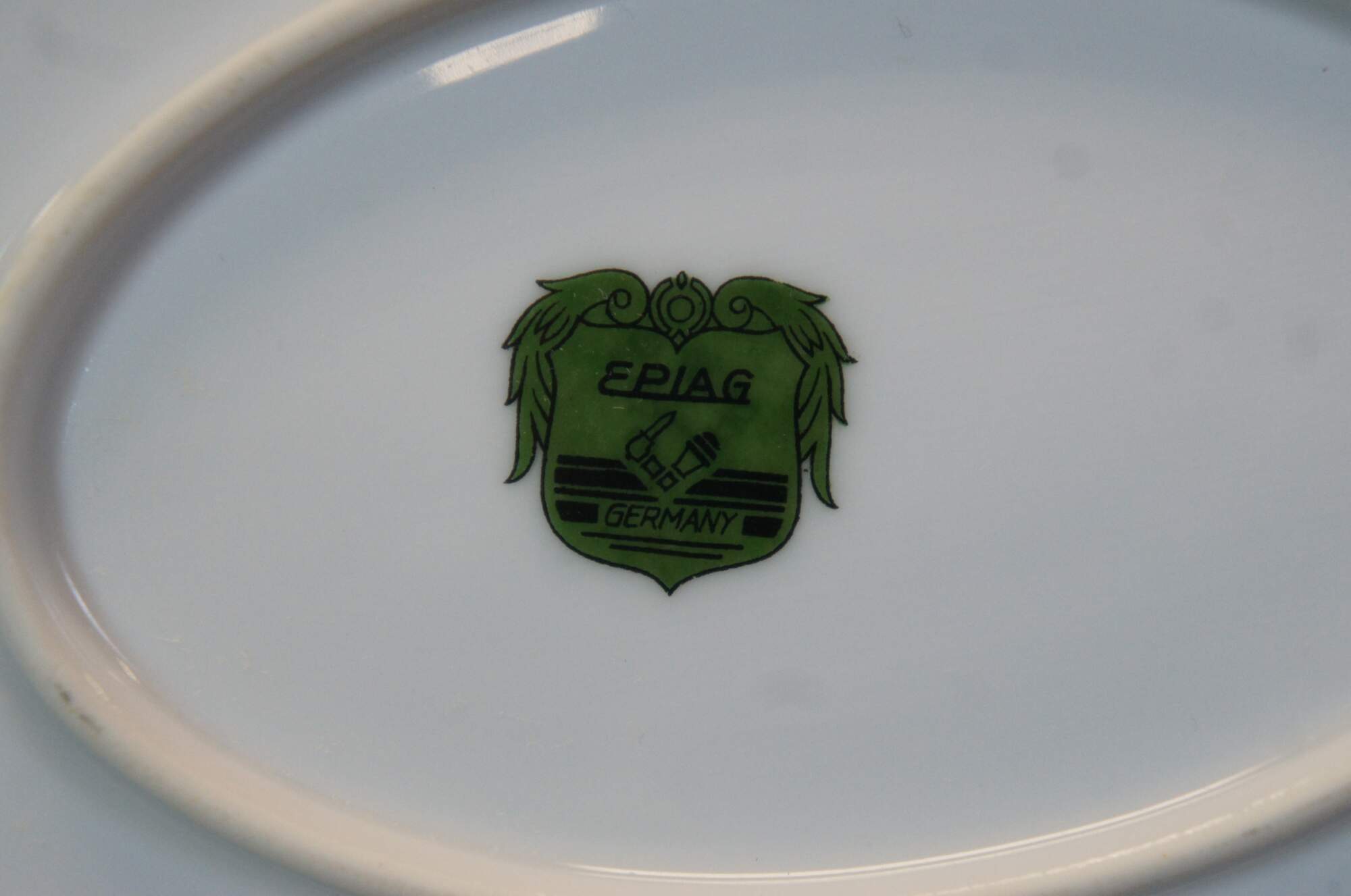 "The arm and stiletto mark was used by Springer & Co. of Elbogen, Bohemia (now Loket, Czech Republic), one of the potteries that was part of EPIAG. The pottery was founded in 1815 by Rudolf Eugen Haidinger and Eugen Haidinger and operated under various names and owners. It became Springer & Co. in 1885 and joined OEPIAG, an association of potteries, in 1918. In 1920 the name of the association was changed to EPIAG (First Bohemian Porcelain Industry). The pottery was nationalized in 1945 and became part of Starorolsky Porcelain." (Source: Kovels)
