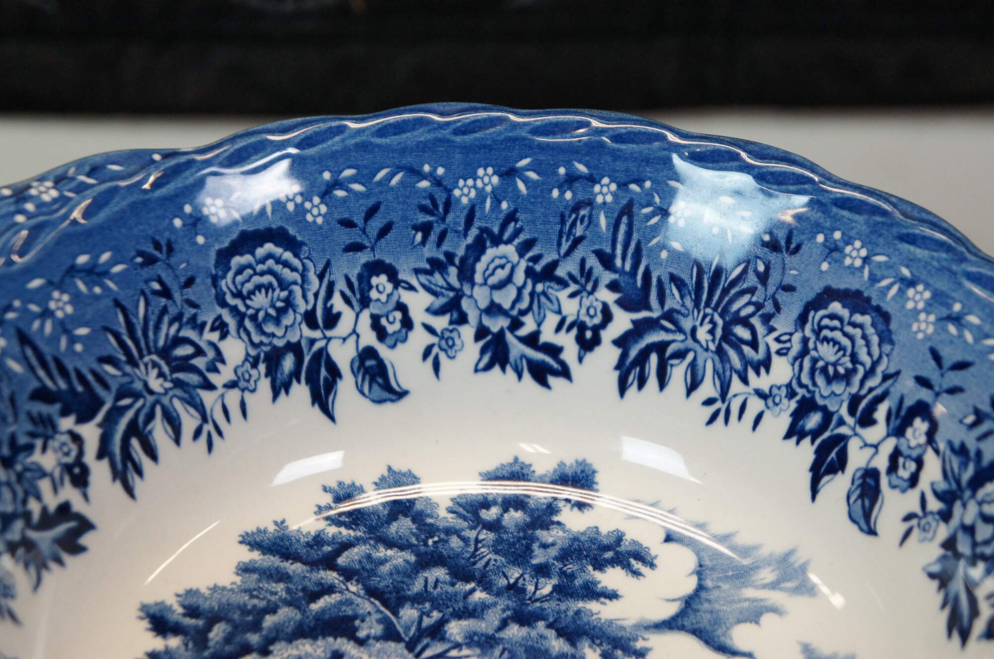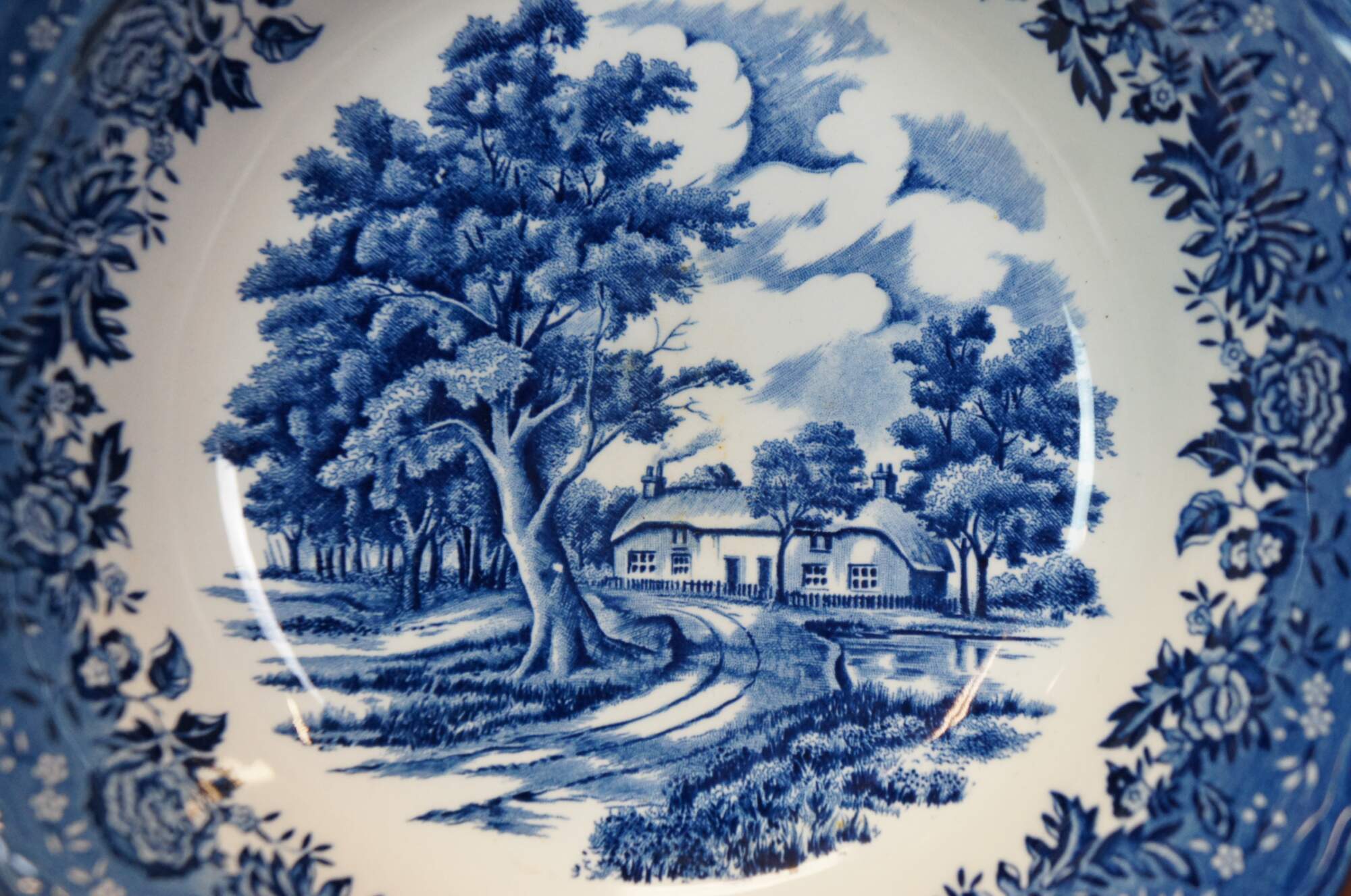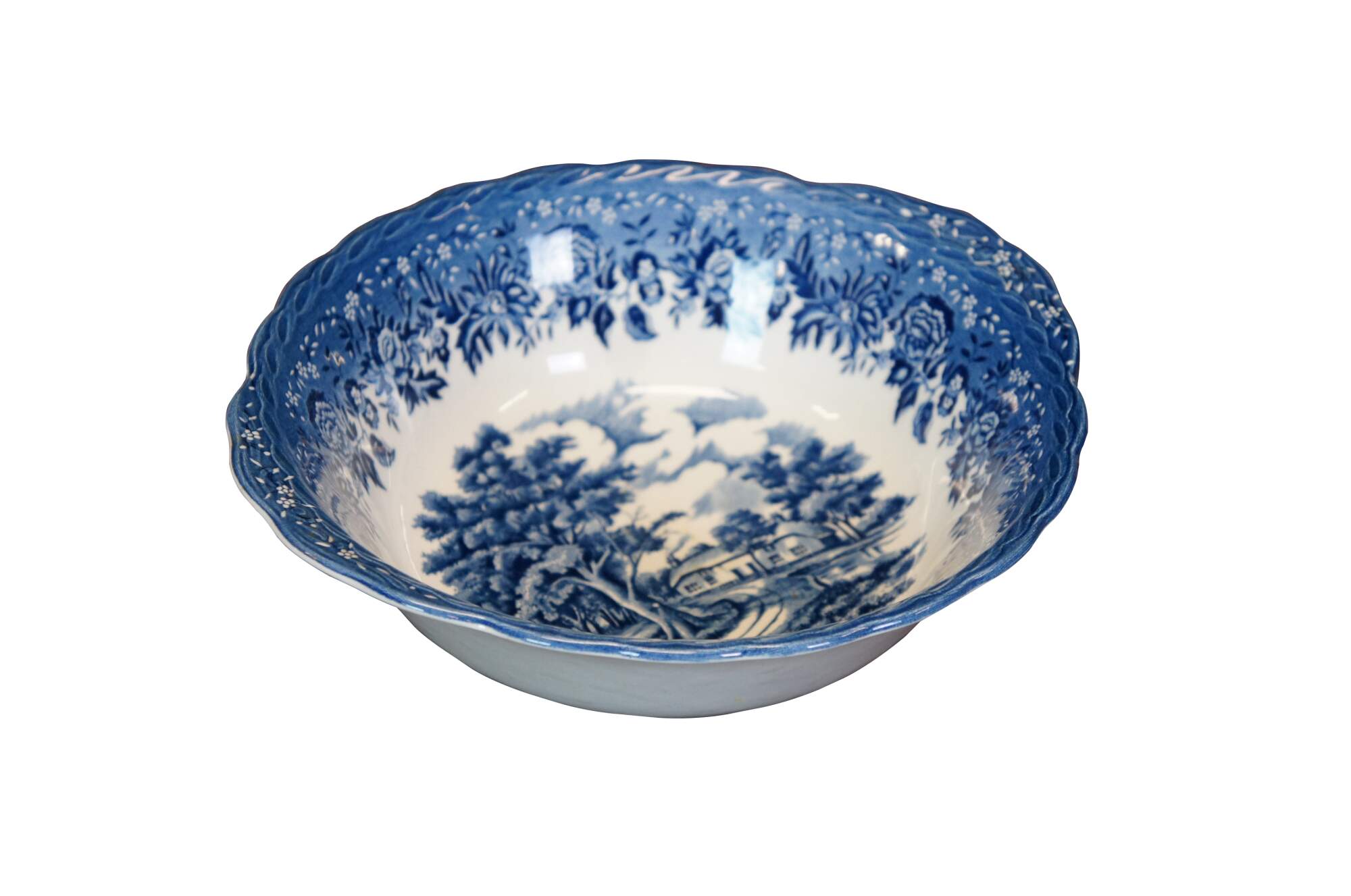 Circa 1970's Victorian Revival serving dish by W.H. Grindley. Round form with molded handles, decorated with a blue and white transferware Country Side pattern, depicting a picturesque country cottage framed with a floral border.