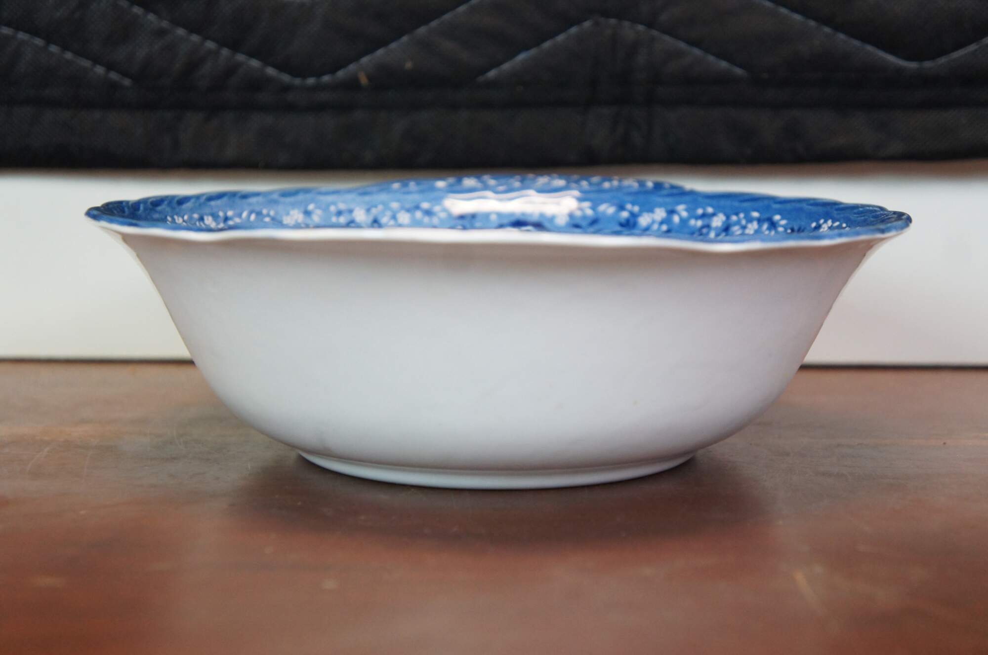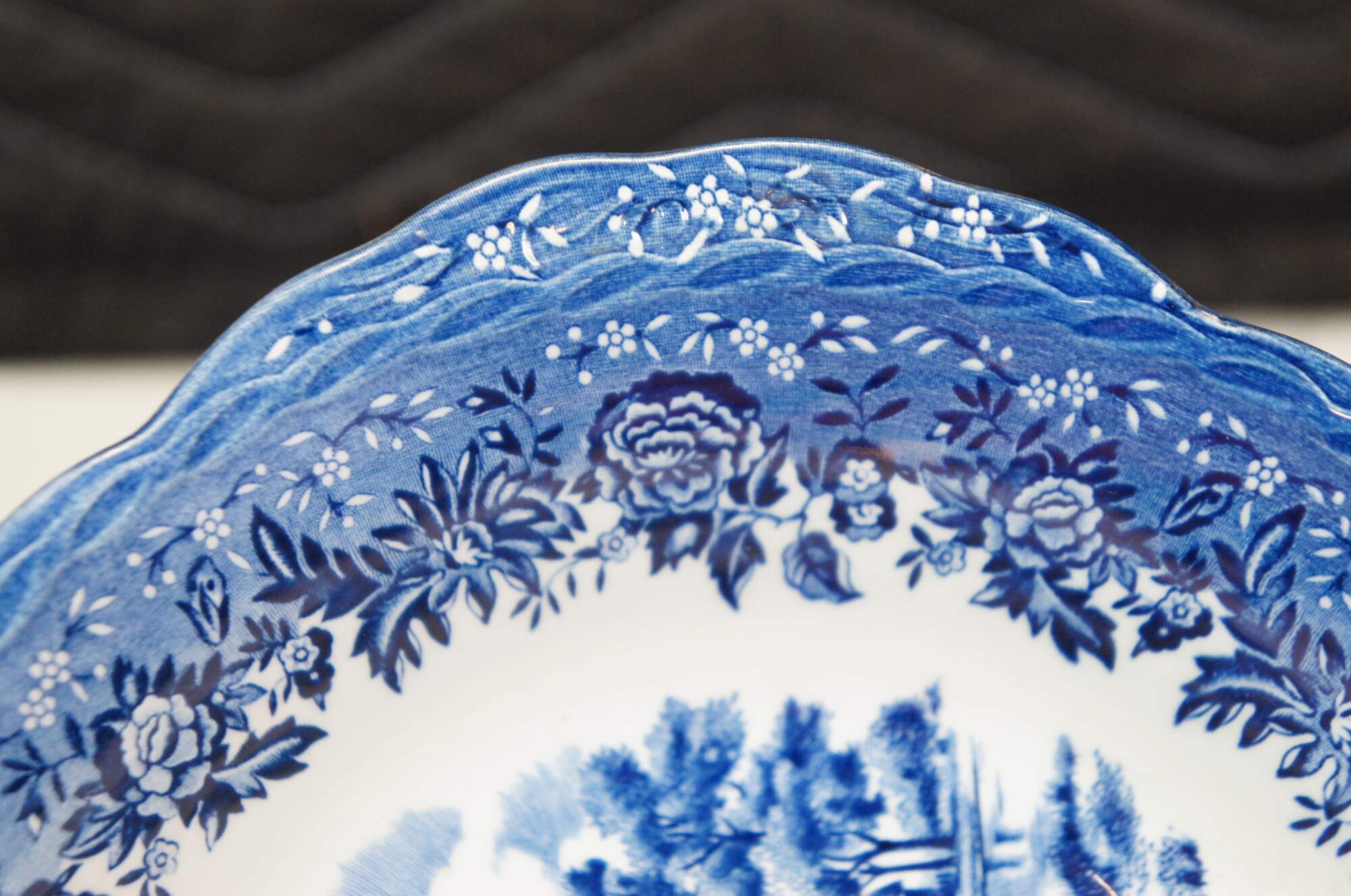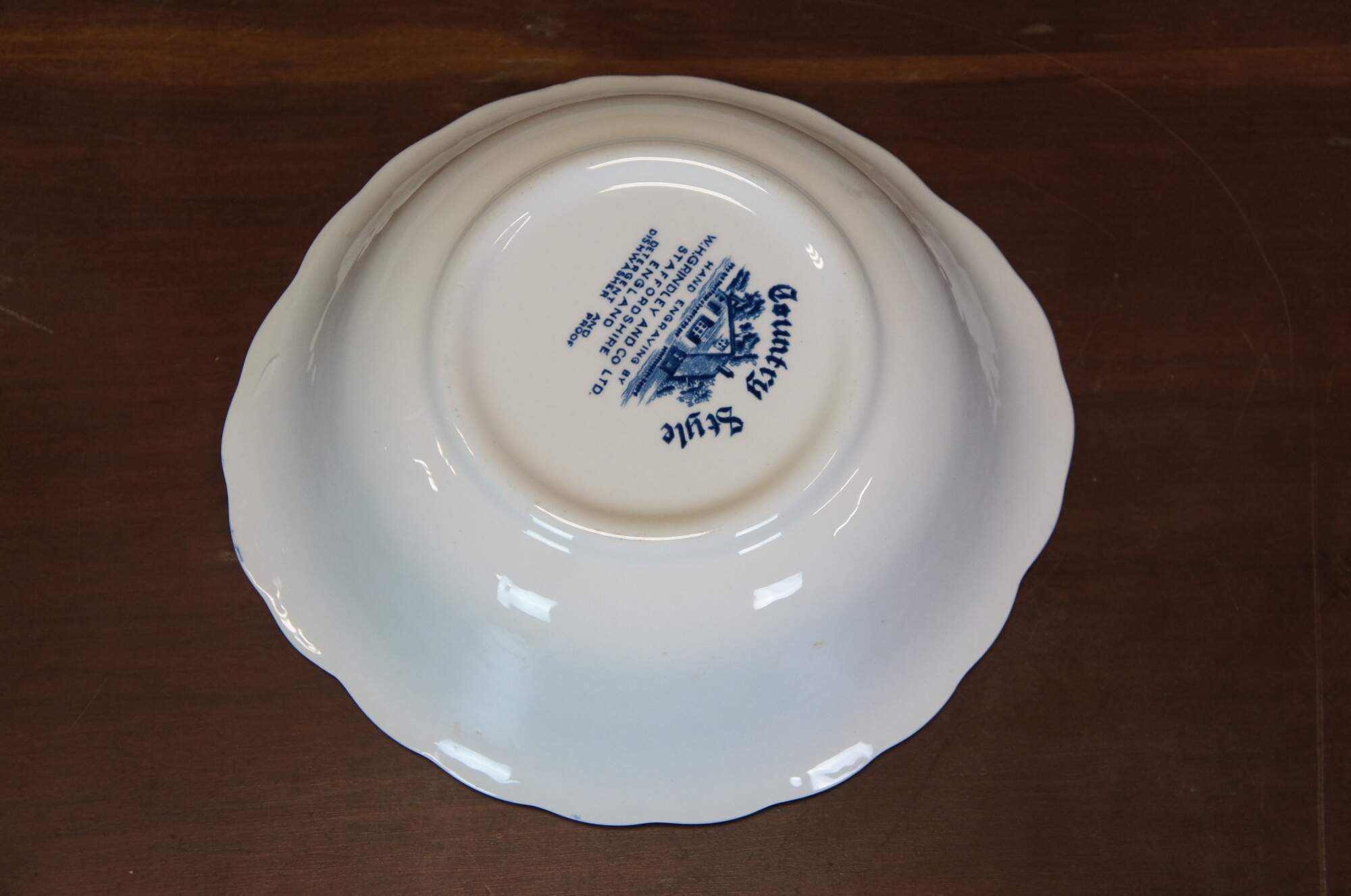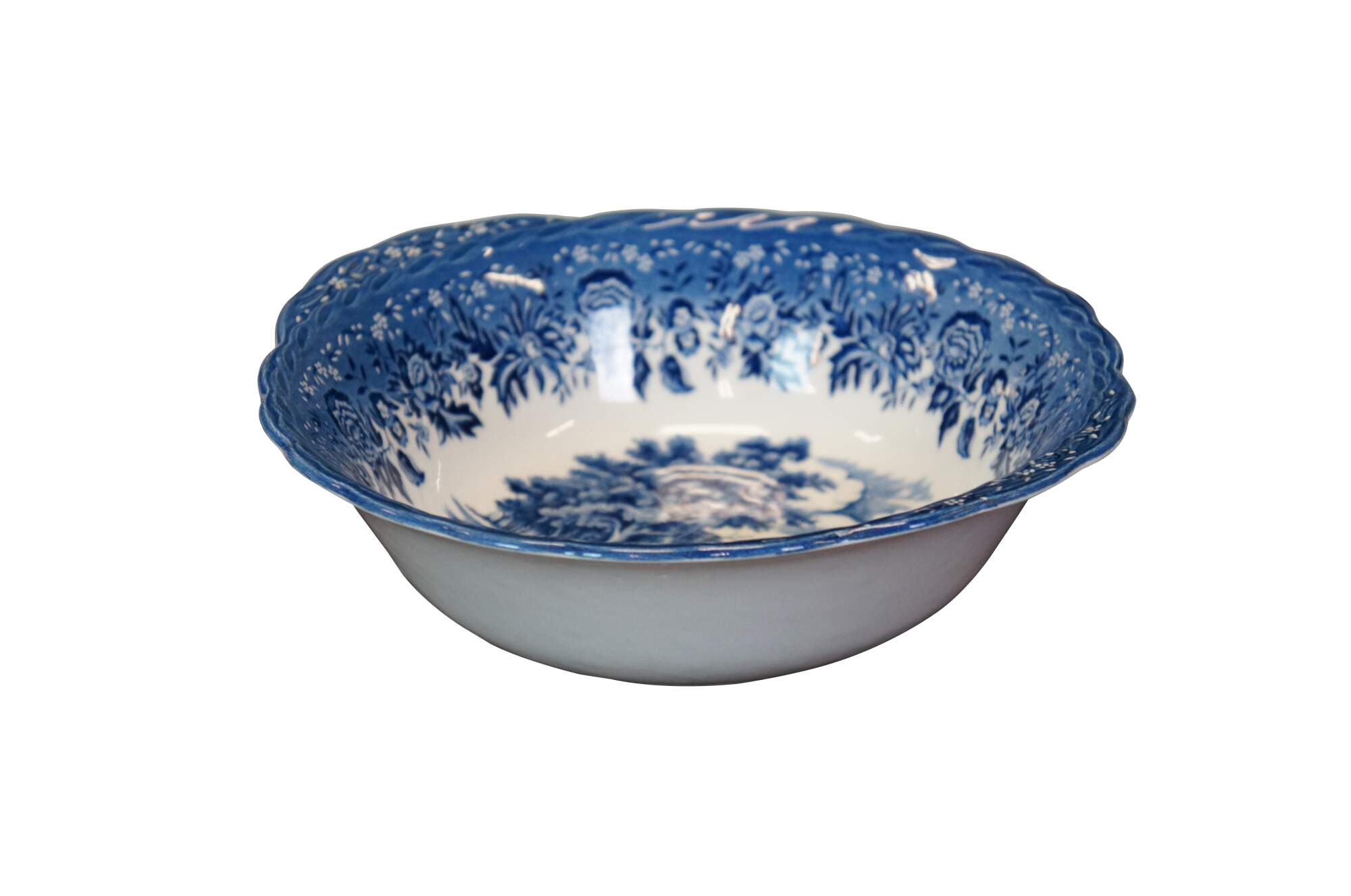 Circa 1970's Victorian Revival serving dish by W.H. Grindley. Round form with molded handles, decorated with a blue and white transferware Country Side pattern, depicting a picturesque country cottage framed with a floral border.