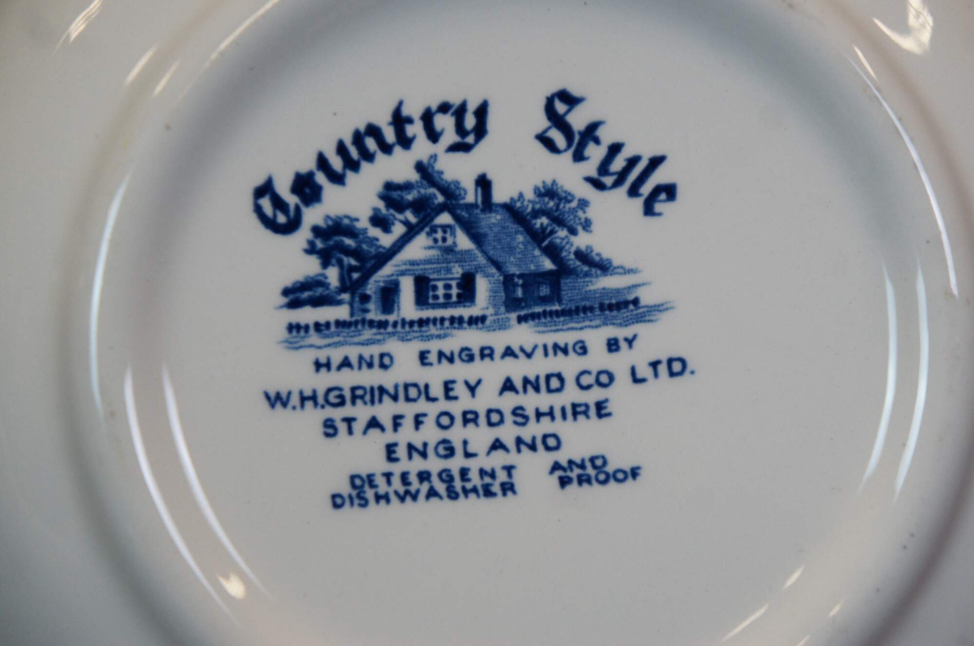 "W H Grindley was an English pottery company that made earthenware and ironstone tableware, including flow blue. The company was founded in 1880 by William Harry Grindley, JP (b. 1859) of Tunstall, Stoke-on-Trent. The company was founded at the Newfield Pottery by Grindley, Mr Turner and Alfred Meakin (connected to J. & G. Meakin company). In March 1883 (or 1884?) Alfred Meakin left the partnership. The company moved to the Woodland Pottery in 1891. In 1908 W. H. Grindley set up a sister company - The Grindley Hotel Ware Co. William Harry Grindley died in 1926. Grindley remained open during the Second World War under the Wartime Concentration Scheme - they were permitted to produce undecorated domestic ware. They also produced canteen ware for the British armed forces.In 1960 Alfred Clough Ltd purchased W. H. Grindley, who continued to trade under their own name as part of the 'Alfred Clough Group.' In 1978 the name of the Clough Group was changed to Grindley of Stoke (Ceramics) Ltd. The company bought Ceramix in 1980, and was itself bought by Federated Potteries in 1982 before being bought back by W H Grindley in 1988. The company went into receivership in 1991 and was taken over by Woodlands Pottery. Pattern books and records from 1880 to 1930 are in the Stoke-on-Trent City Archives." (Source: Wikipedia / The Potteries)