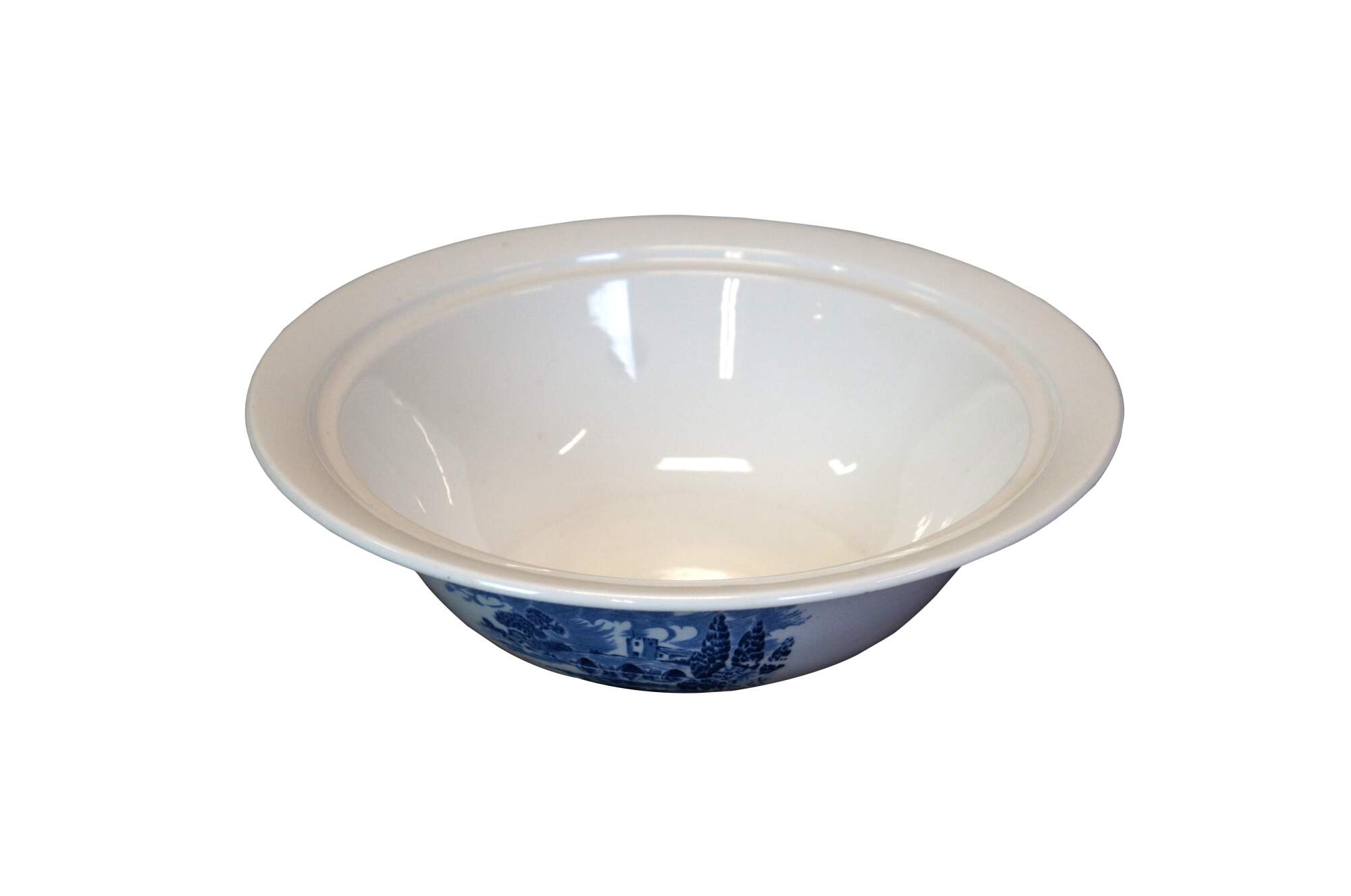 Mid to late 20th century porcelain sering bowl by Enoch Wedgwood (Tunstall) Ltd in the Countryside pattern, featuring a thrice repeated landscape of a small manor house over a culvert framed with cypress trees. Unicorn stamp.