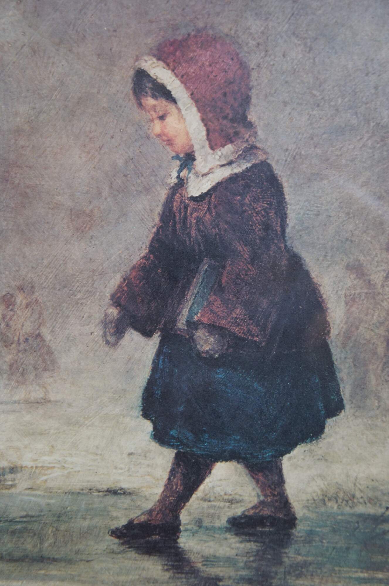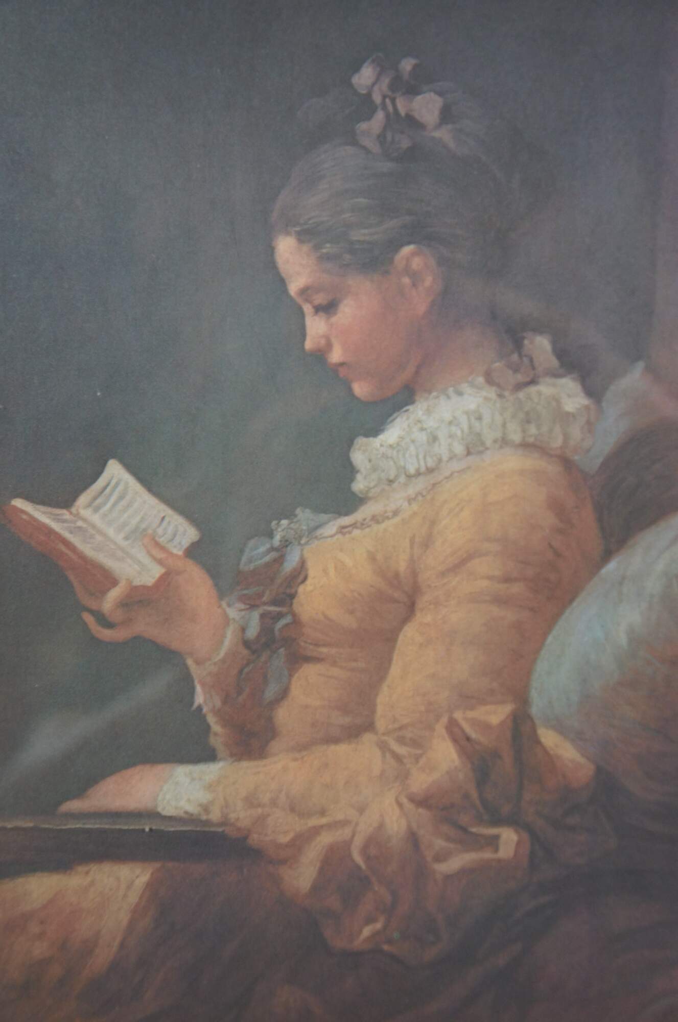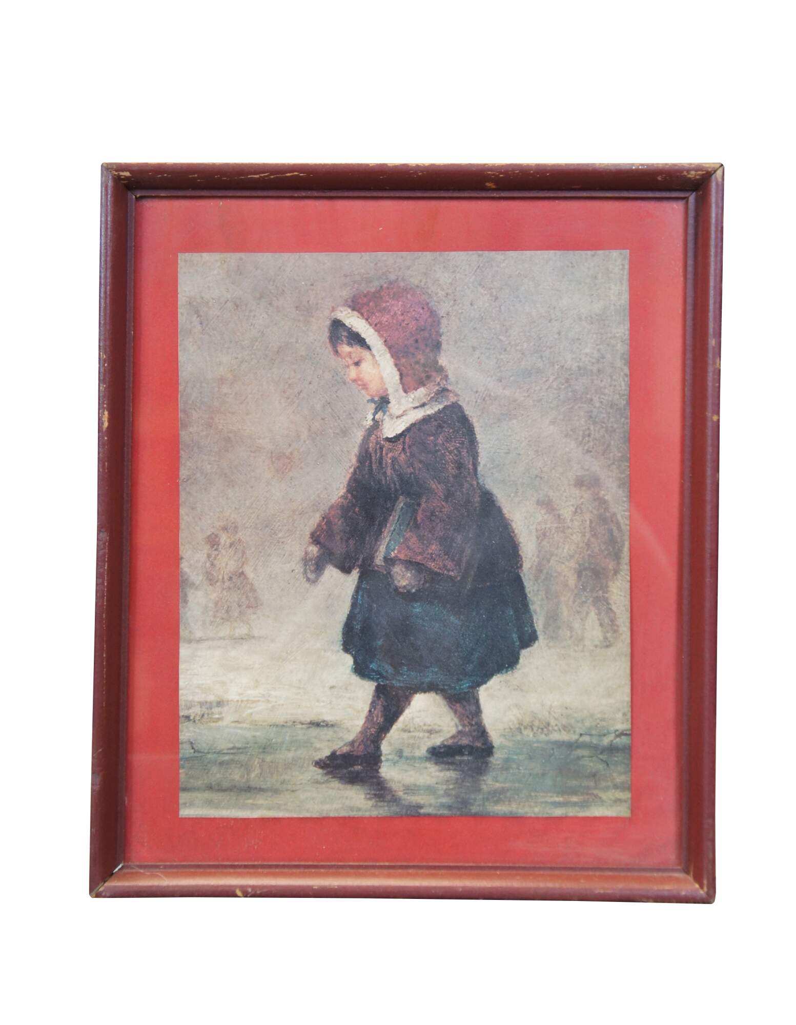 Pair of mid to late 20th century prints on paper - "A Young Girl Reading" by Jean-Honore Fragonard and a Victorian schoolgirl treading the ice of a winter landscape. Red painted beveled wood frame; red mat.