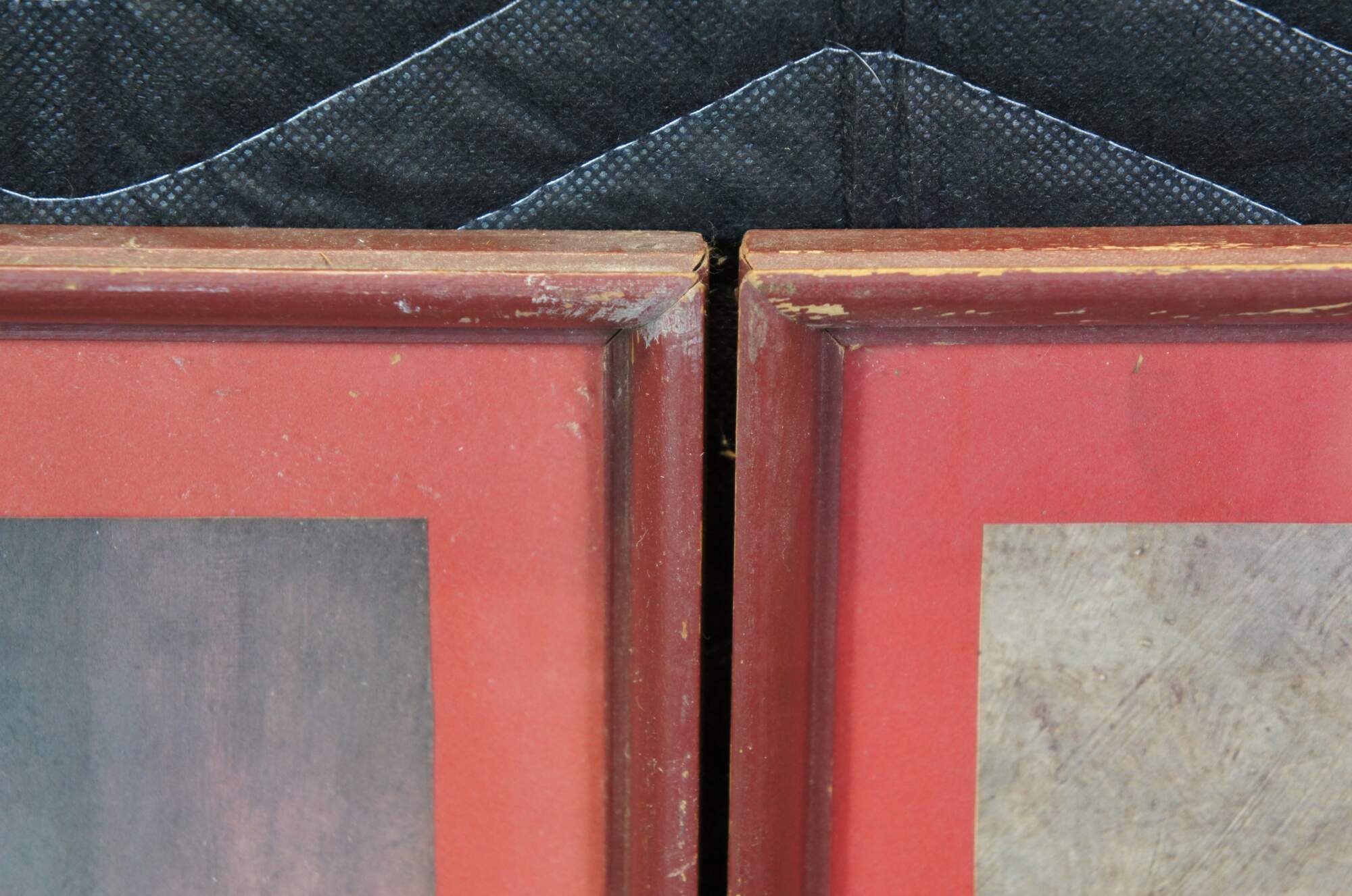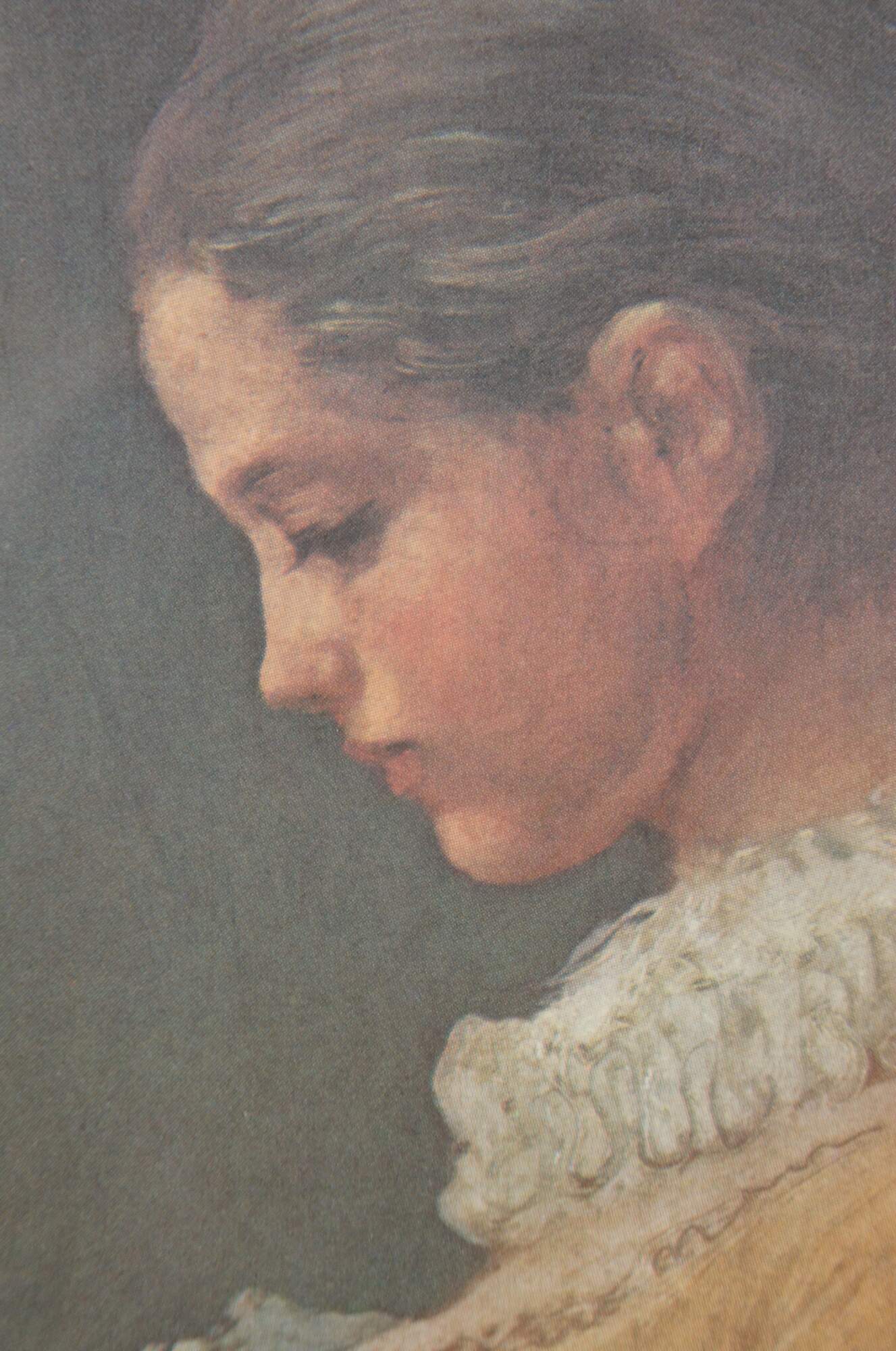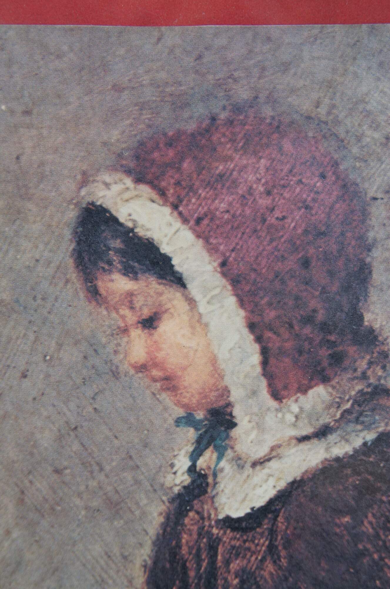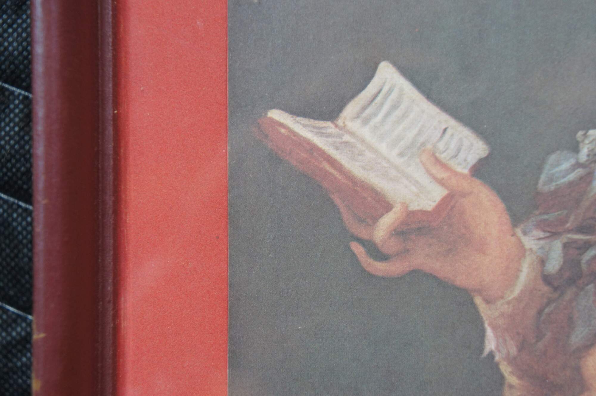 Pair of mid to late 20th century prints on paper - "A Young Girl Reading" by Jean-Honore Fragonard and a Victorian schoolgirl treading the ice of a winter landscape. Red painted beveled wood frame; red mat.