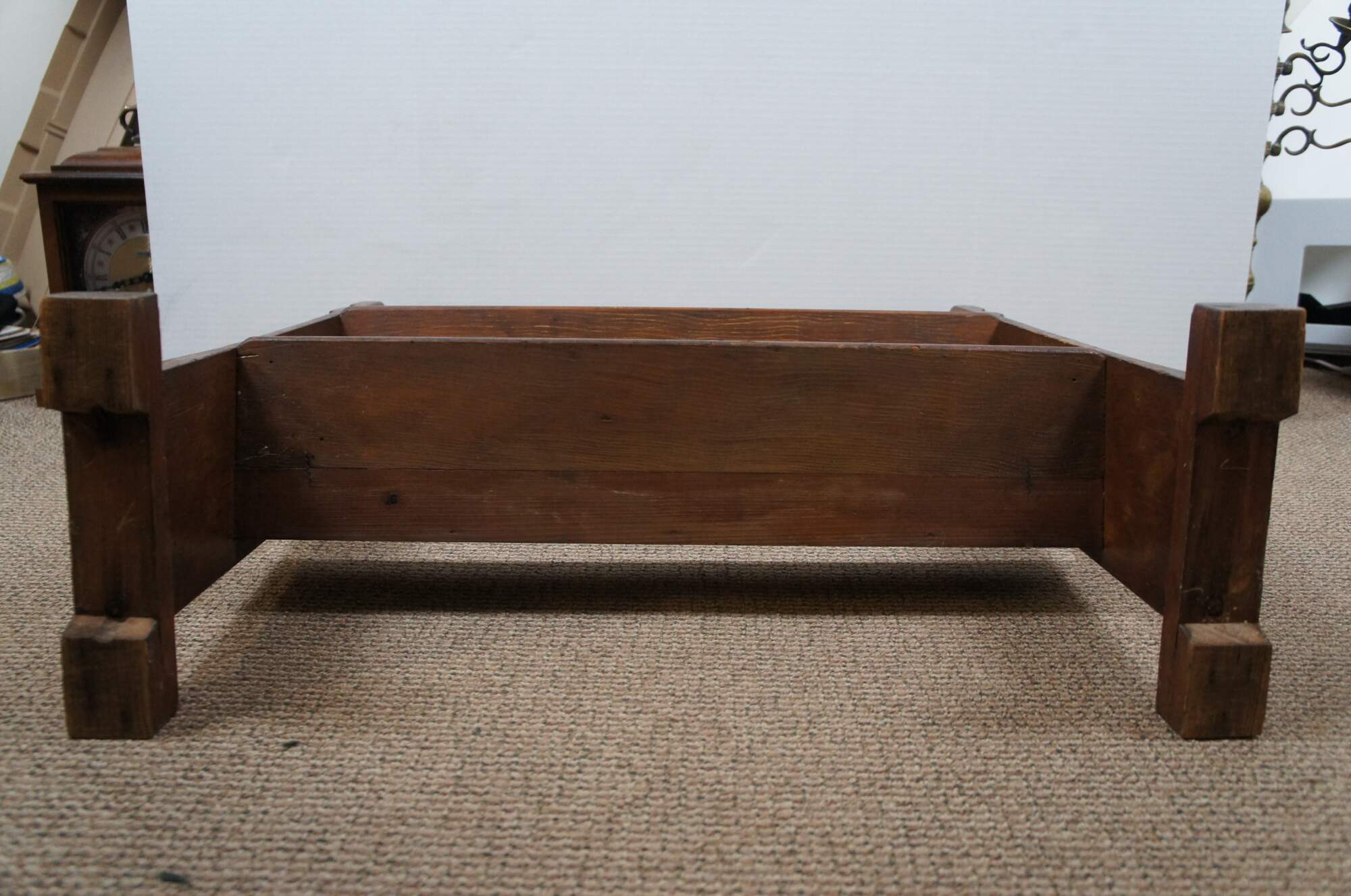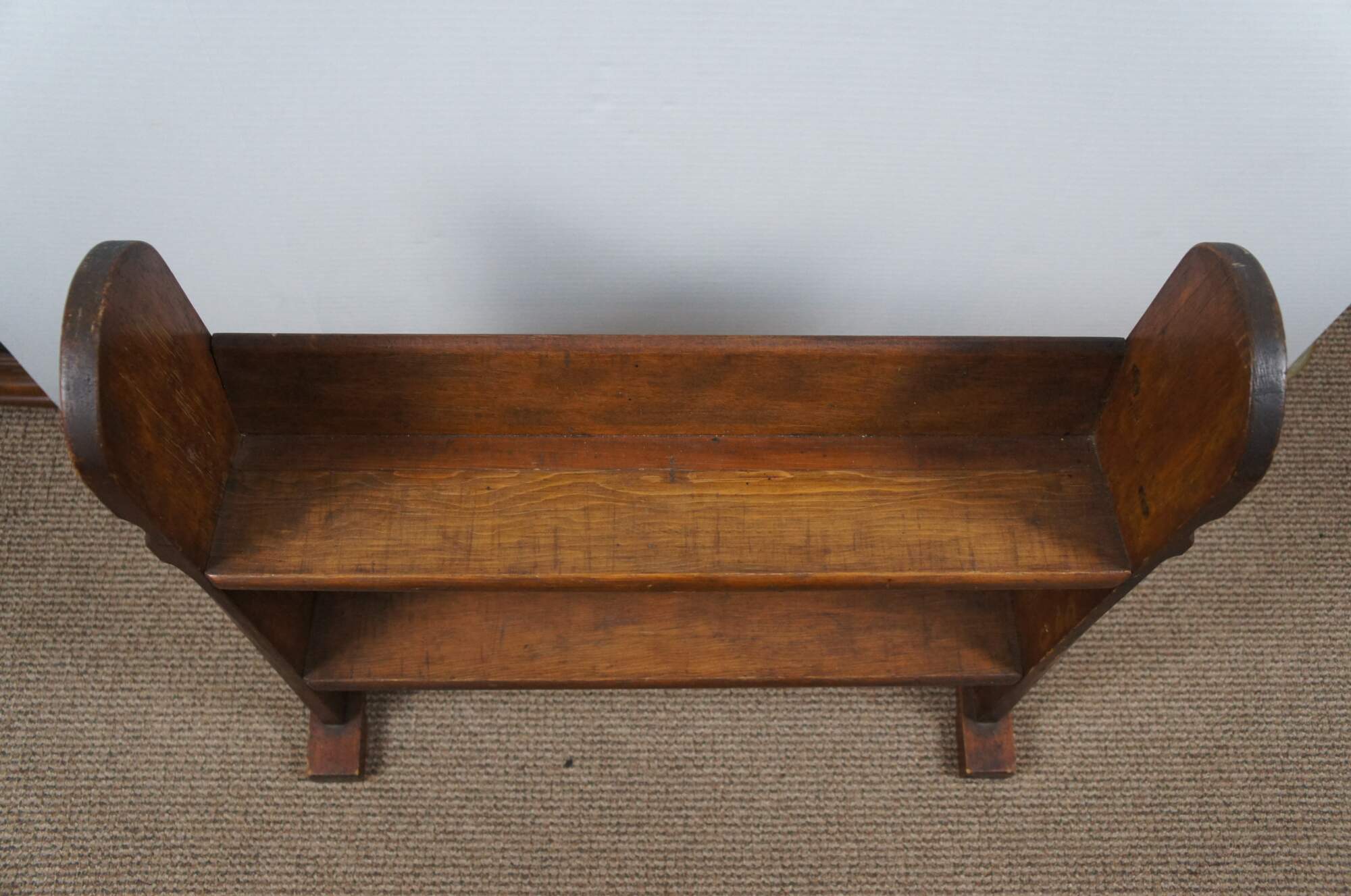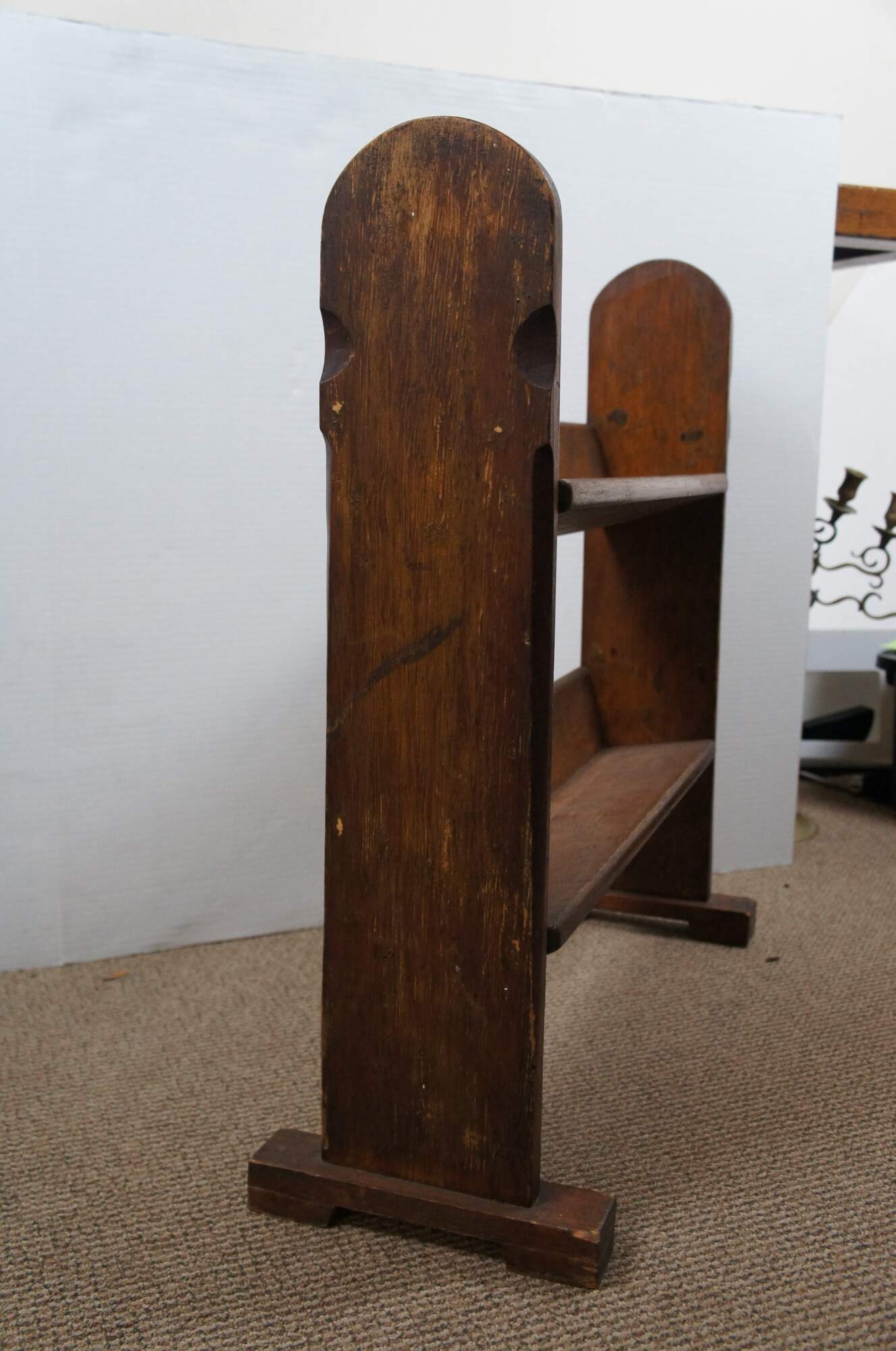 Antique Victorian oak arts & crafts book trough / stand / bookshelf. Features two angled tiers / shelves on a trestle base with rounded top sides.