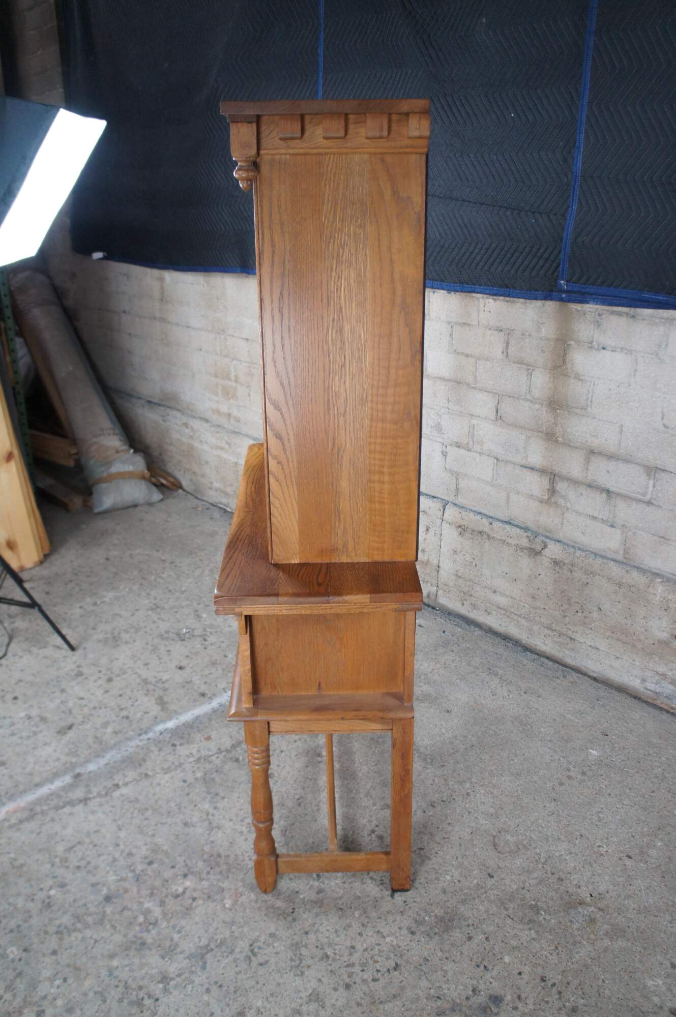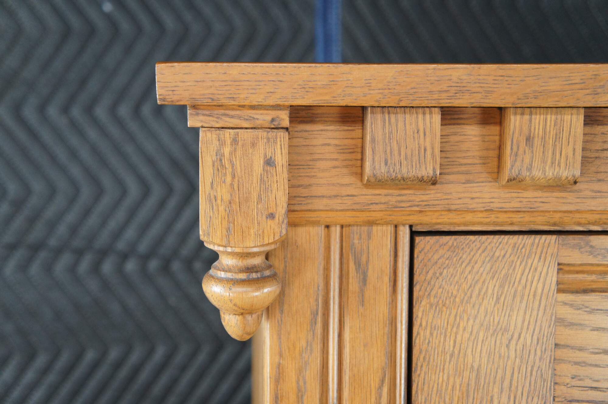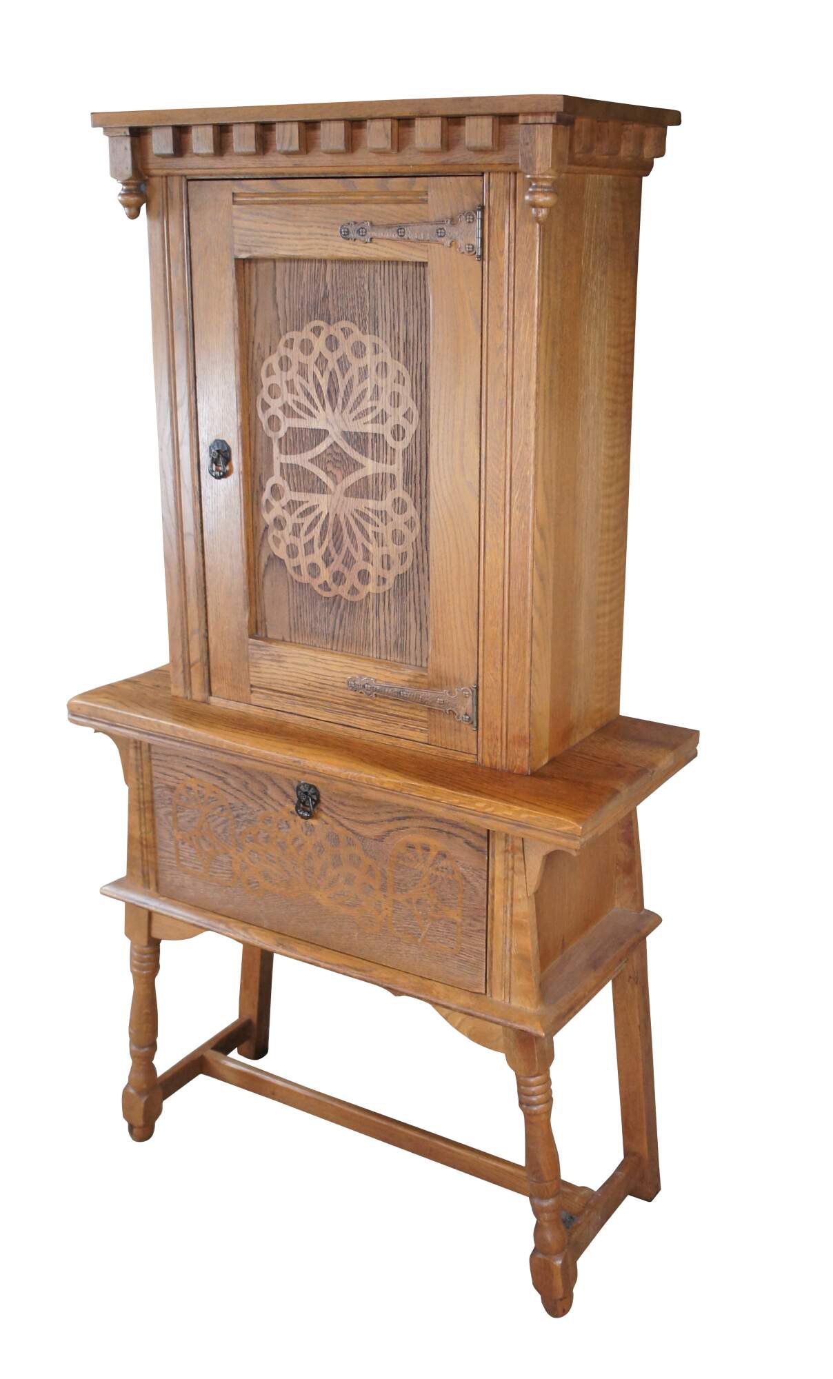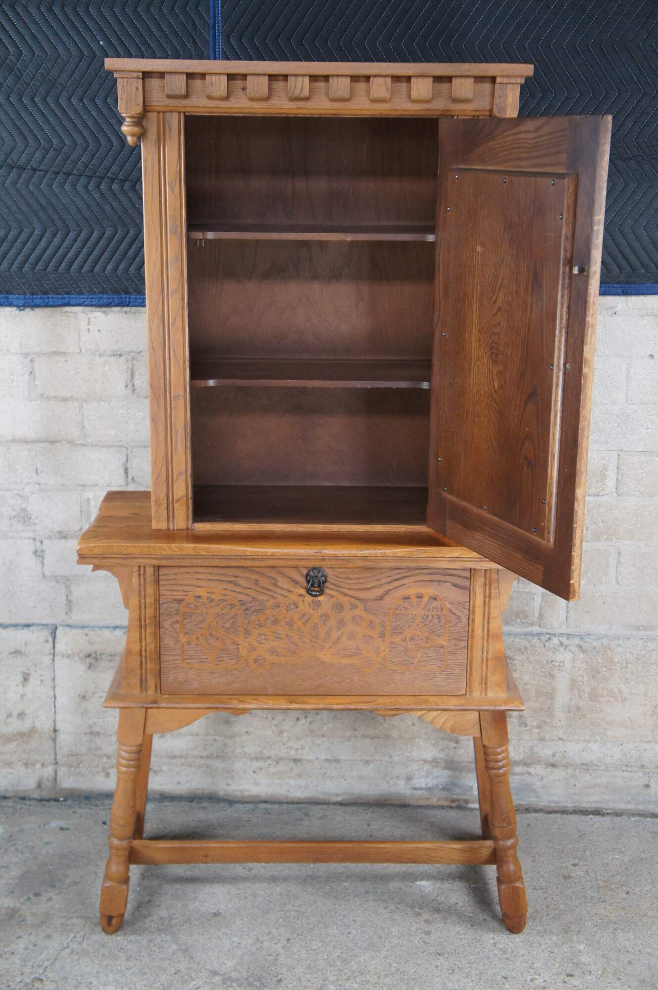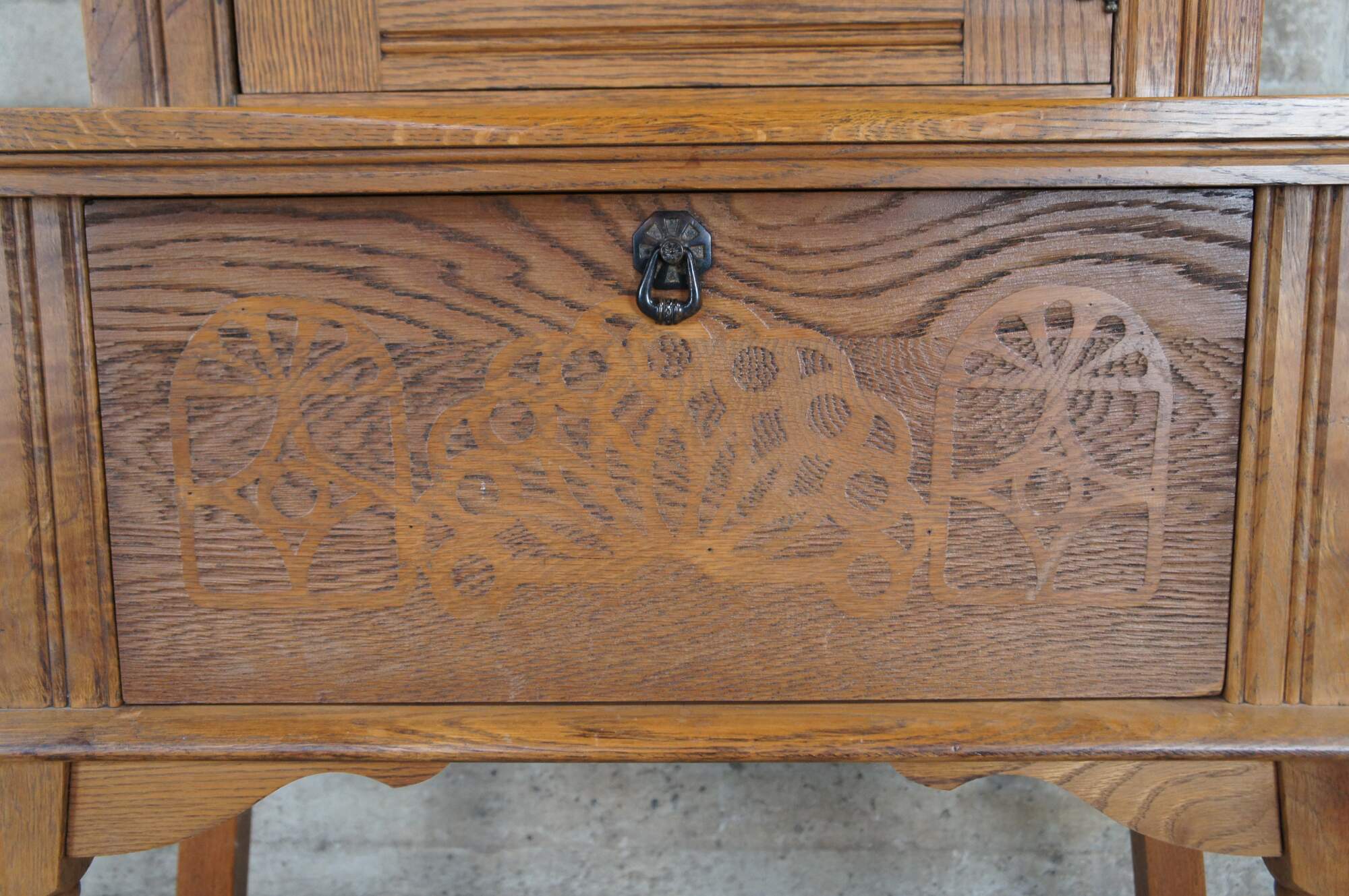 Antique Kuchins Furniture arts & crafts china cabinet / cupboard / dry bar / hutch. Made of oak featuring carved paneled door with long hammered copper hinges that opens to shelves with plate grooves, one large drawer with removable sliding silverware divider, Gothic inspired sawtooth crown with downturned acorn style finials, fluted accents and turned legs connected by H stretcher.