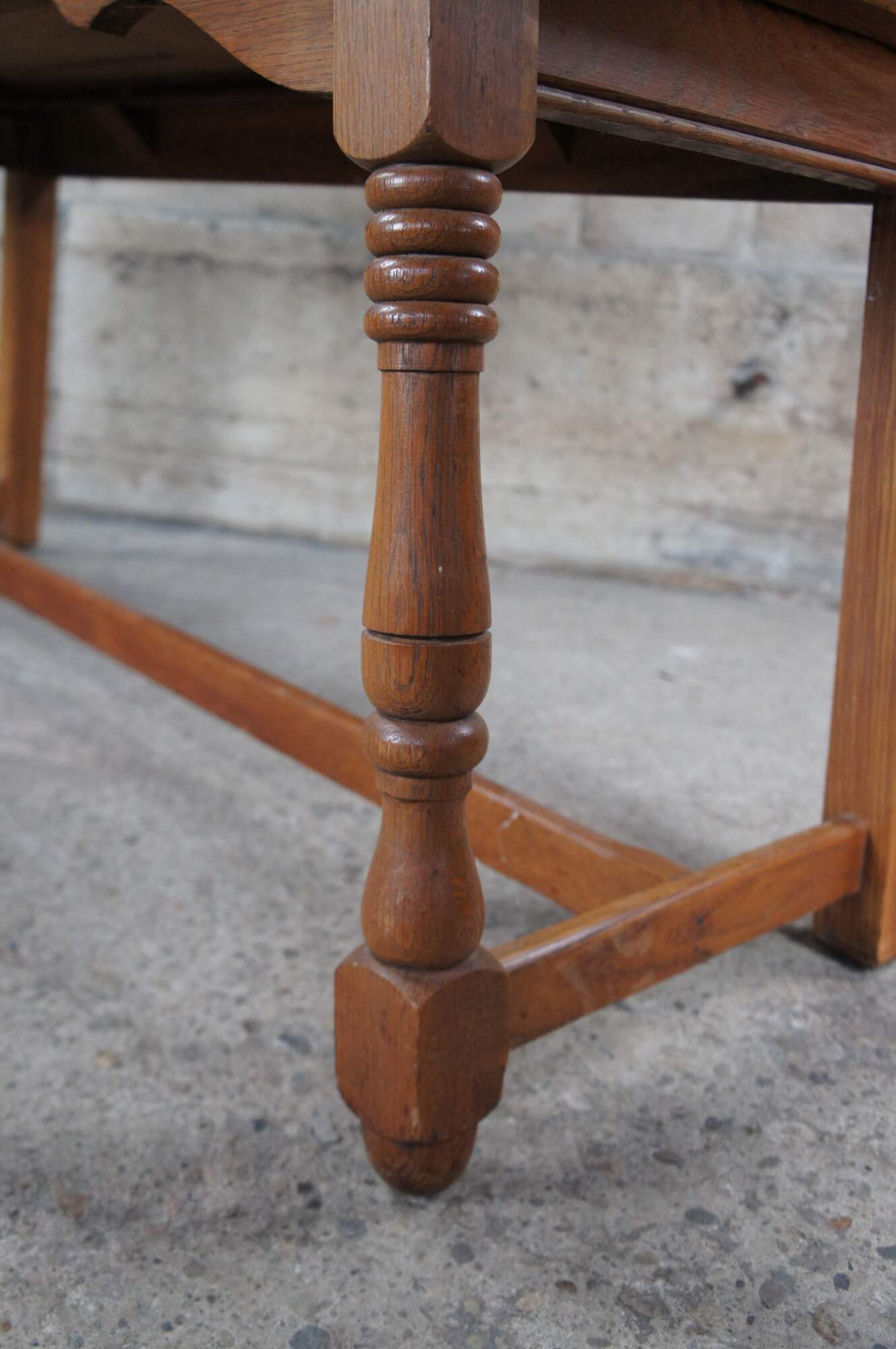 Antique Kuchins Furniture arts & crafts server / console / dry bar / credenza or buffet. Made of oak featuring carved paneled doors with long hammered copper hinges, two drawers, fluted accents and turned legs connected by H stretcher.