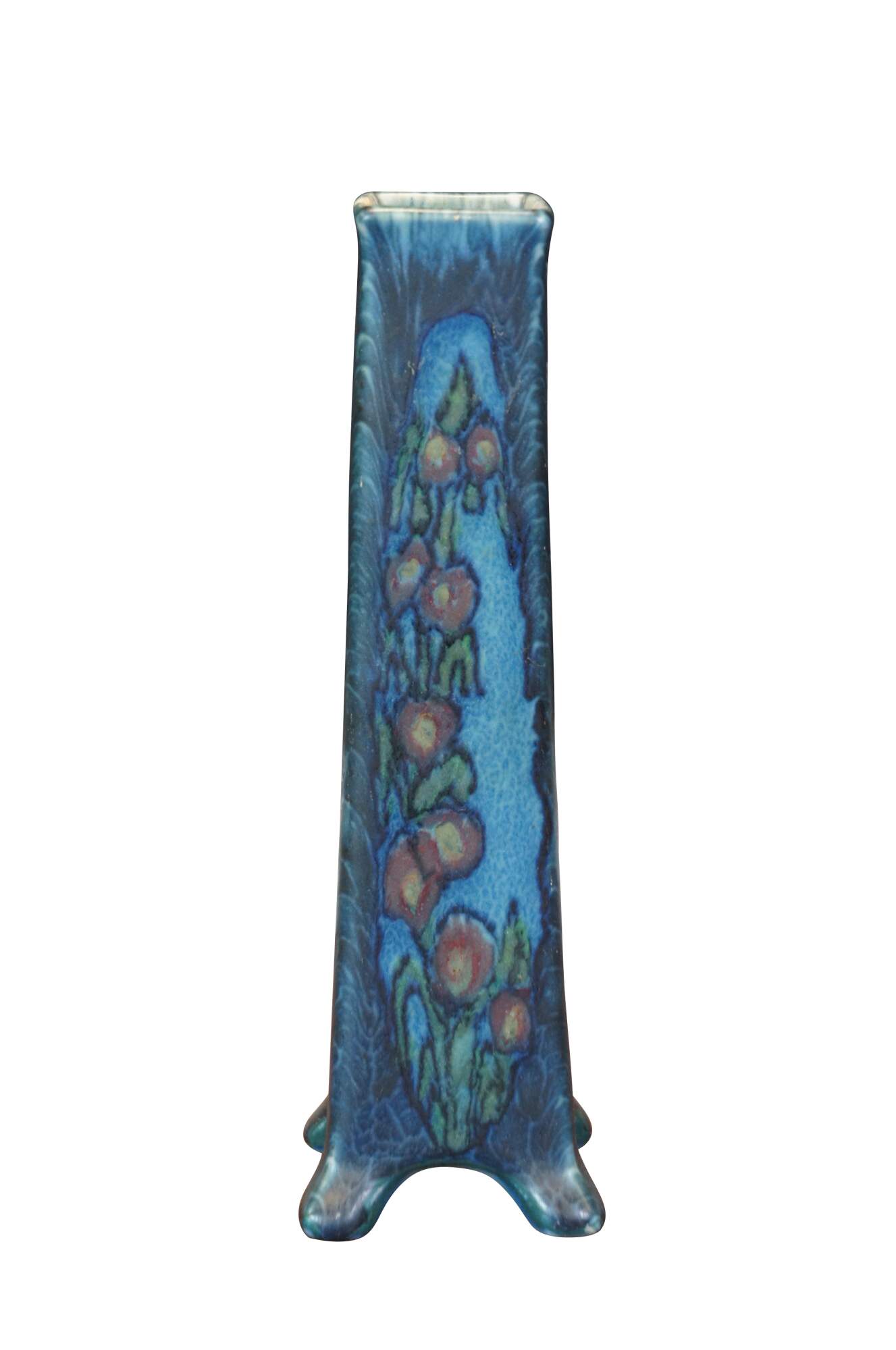 Antique 1923 Rookwood Pottery flower vase designed by Vera Tischler. shape number 2015 - slightly tapered, footed rectangular form with art nouveau decoration, consisting of a stalk of red and yellow flowers on a swirled two-tone blue background under a matte "vellum" glaze. Incised and initialed on base.