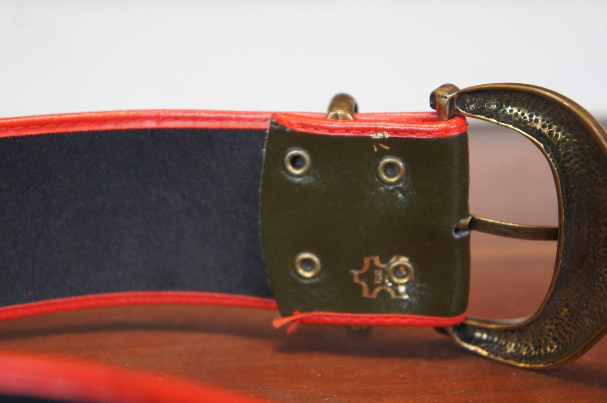 Circa 1980's Bavarian / German style olive green faux leather belt with red trim, two brass folk art style hearts and eidelweiss accented buckle.
