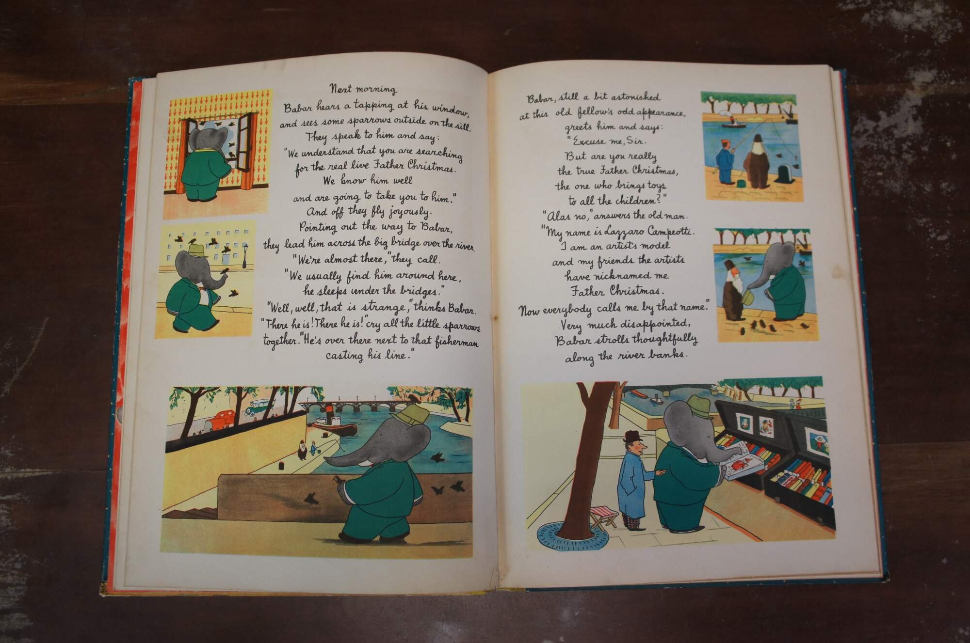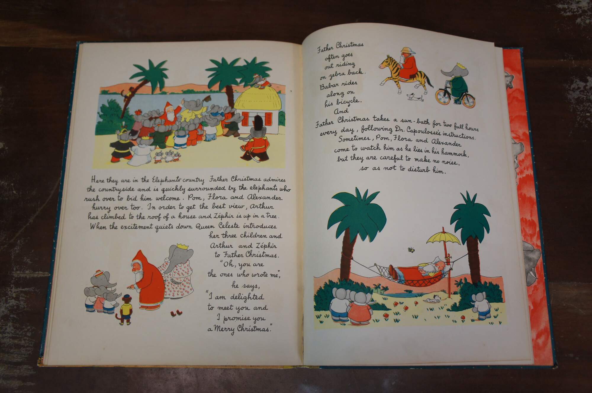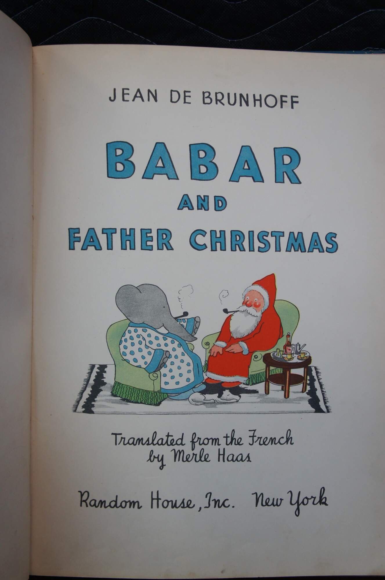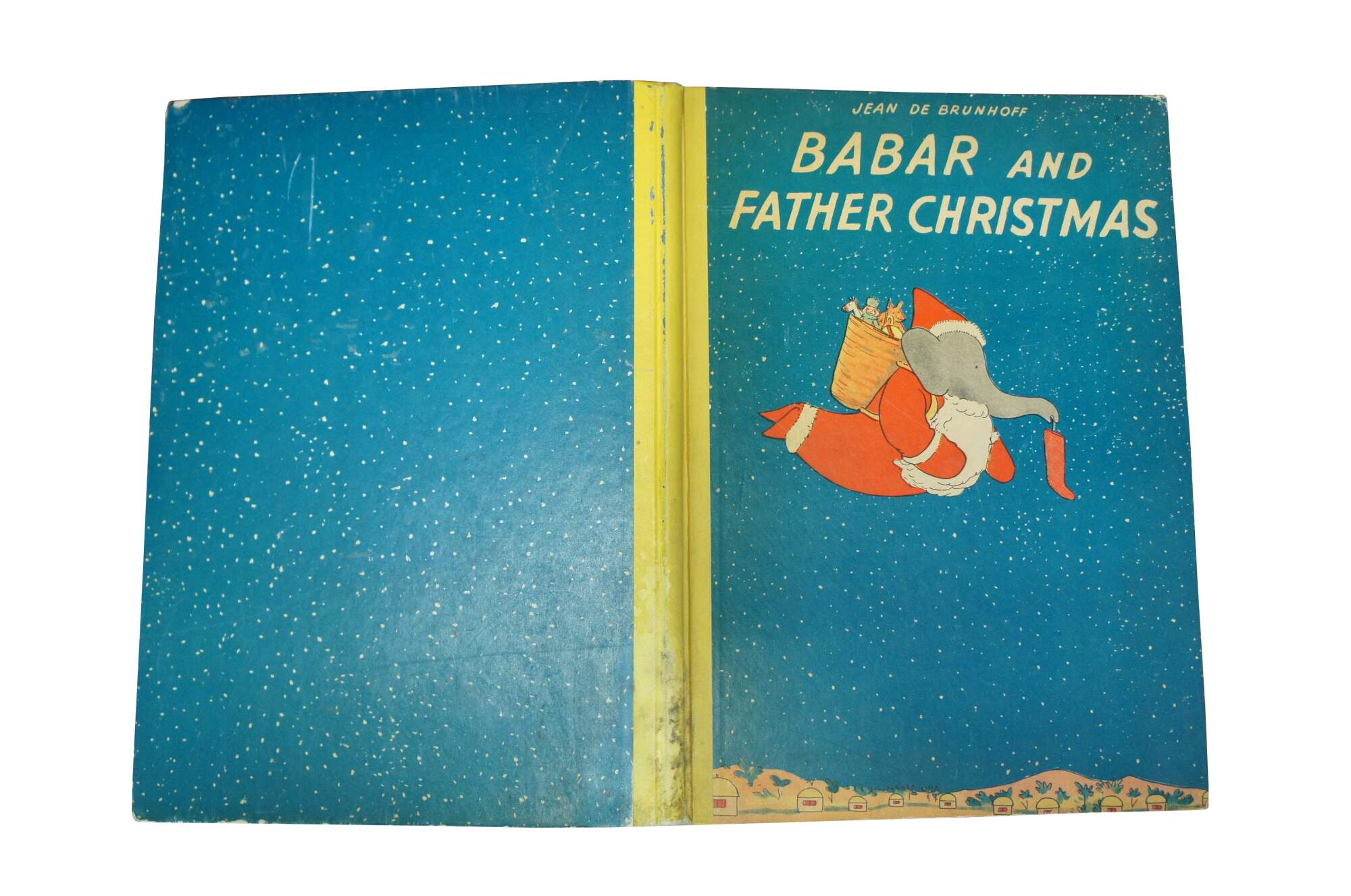 Babar and Father Christmas" by Jean de Brunhoff - Translated from the French by Merle Haas - Copyright / Published by Random House Inc, New York 1940 - Lithographed in the United States of America by the Duenewald Printing Corporation. Paper bound hard cover / hard back, yellow cloth spine. No jacket.