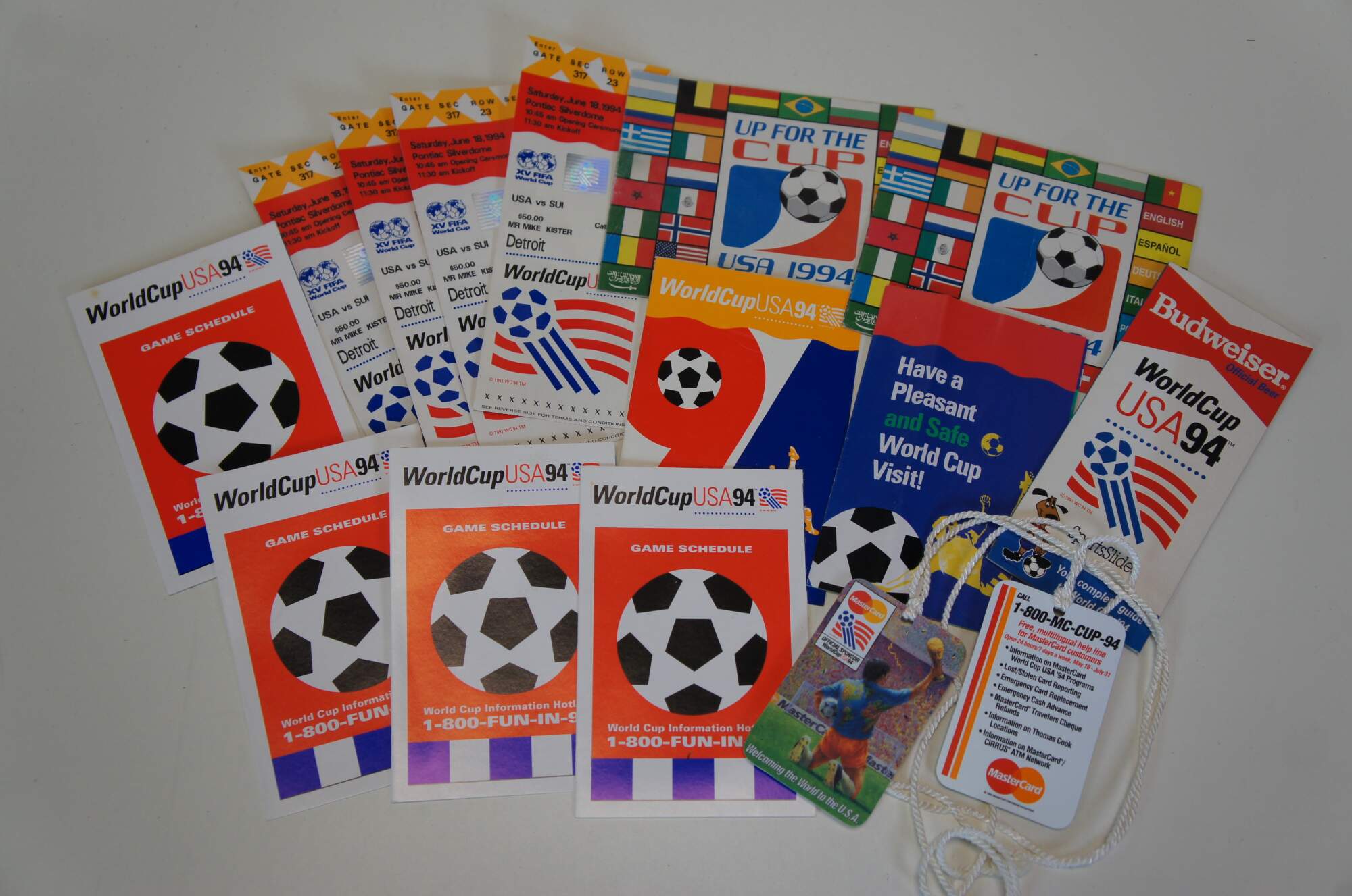 Lot of 56 pieces of FIFA World Cup USA 1994 soccer memorabilia and collectibles. Includes: large 28" standing Striker the dog mascot plush, Boston / Germany windbreaker jacket (size Large), Germany baseball cap with 2 enamel pins, Germany scarf, 14 Alemania / Germany glass tumblers, Budweiser Commemorative Stein, mascot keychain, commemorative Coca Cola can (unopened), Deutschland button, 2 newspapers with articles about the event, 30 pieces of ephemera (including tickets, game schedules, informative booklets and advertisements).