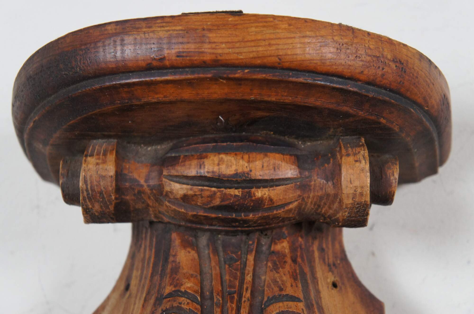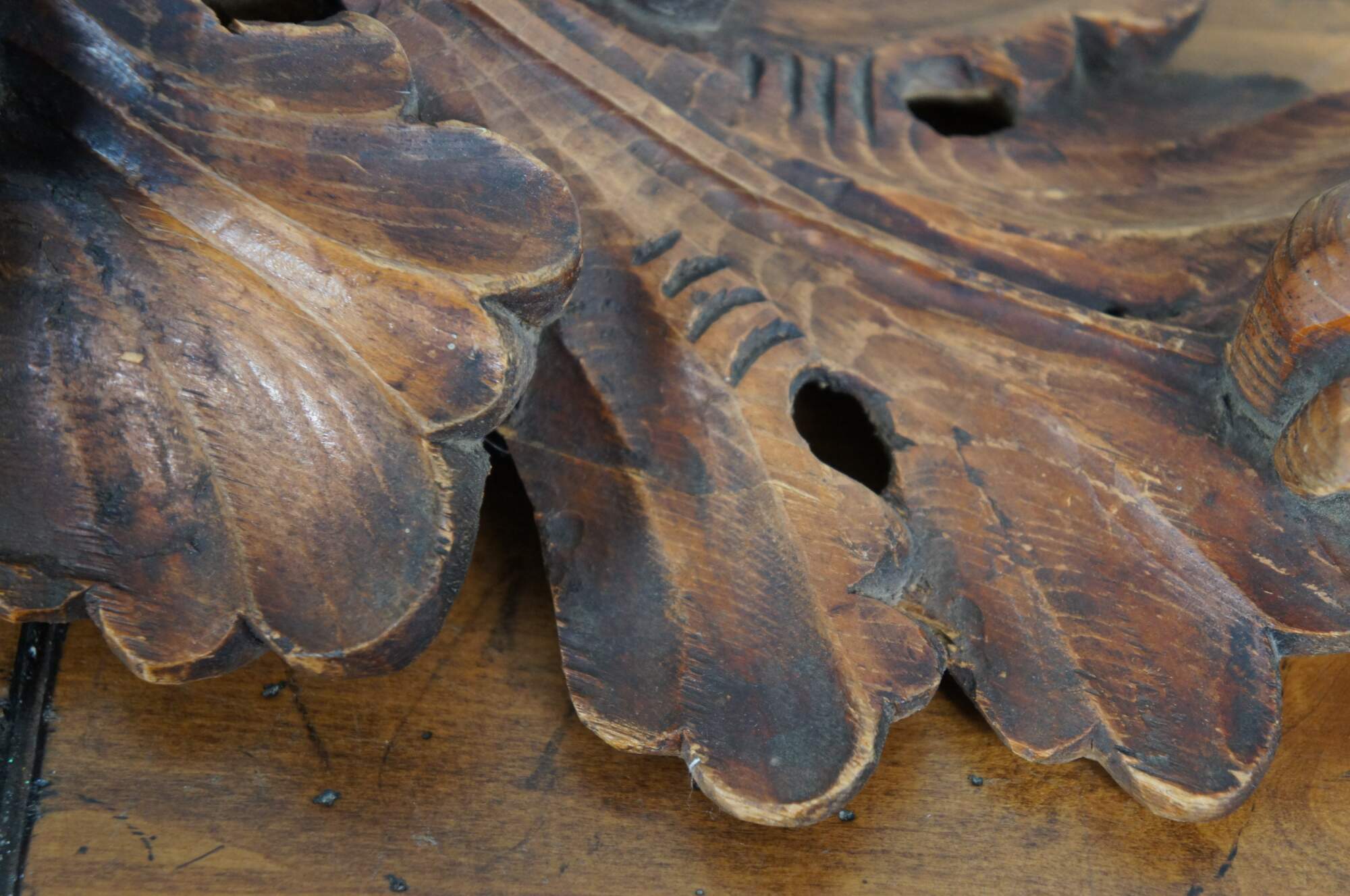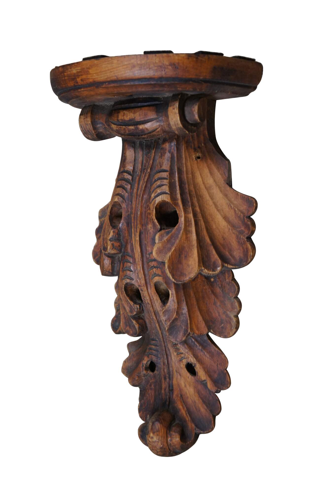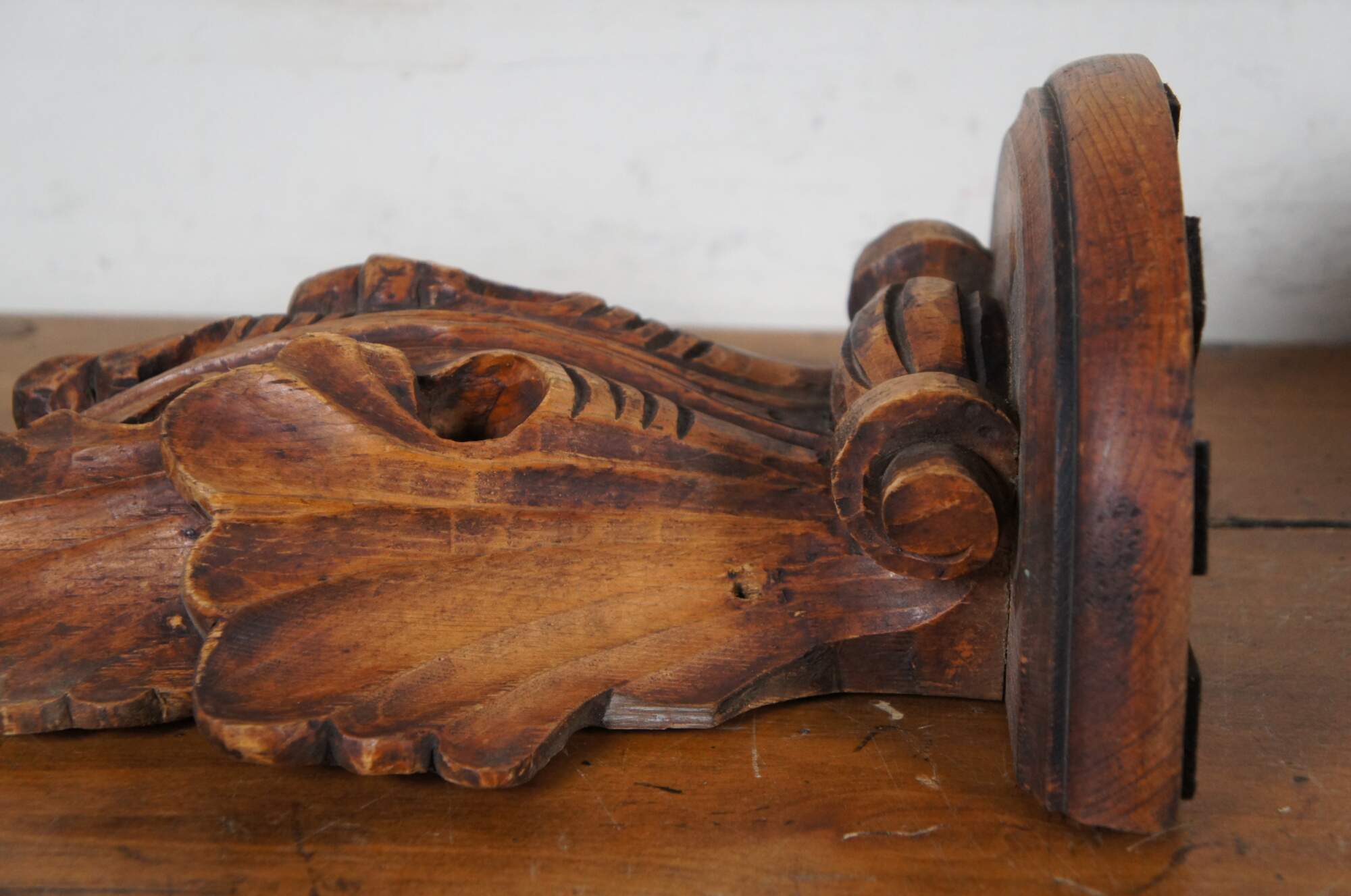 Pair of antique hand carved pine corbels / brackets / shelves. Demilune surfaces with baroque scrolled acanthus leaves. Both surfaces have adhesive felt pads across them.