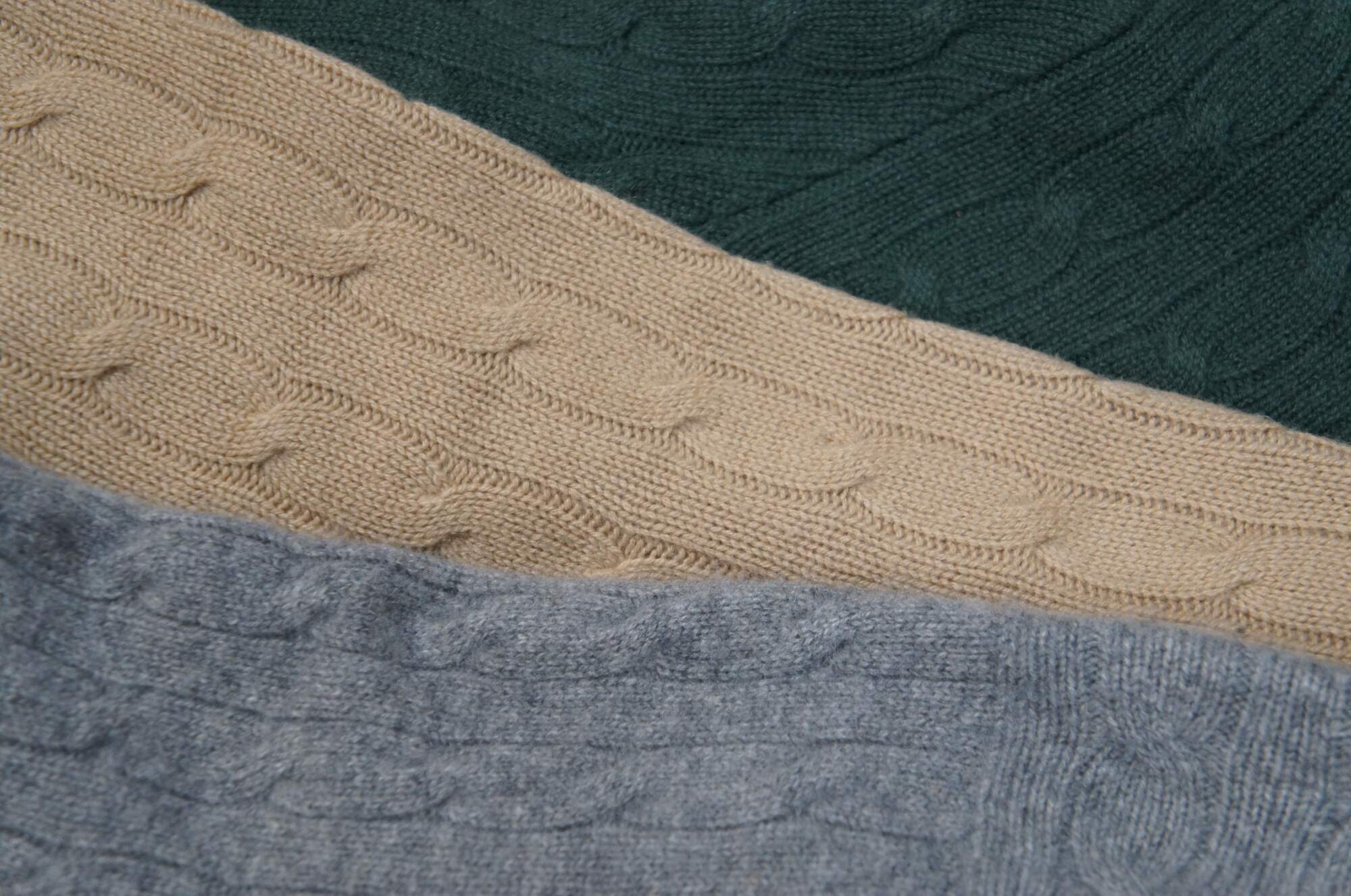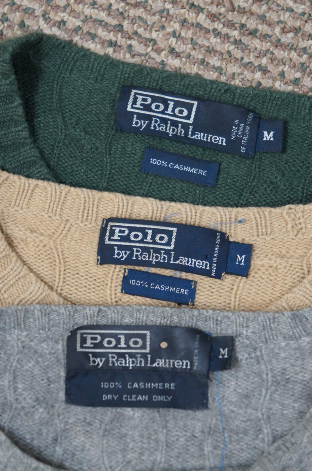 Set of three men's Polo Ralph Lauren pull over, crew neck, cable knit, long sleeve sweaters in soft gray, tan, and hunter green.