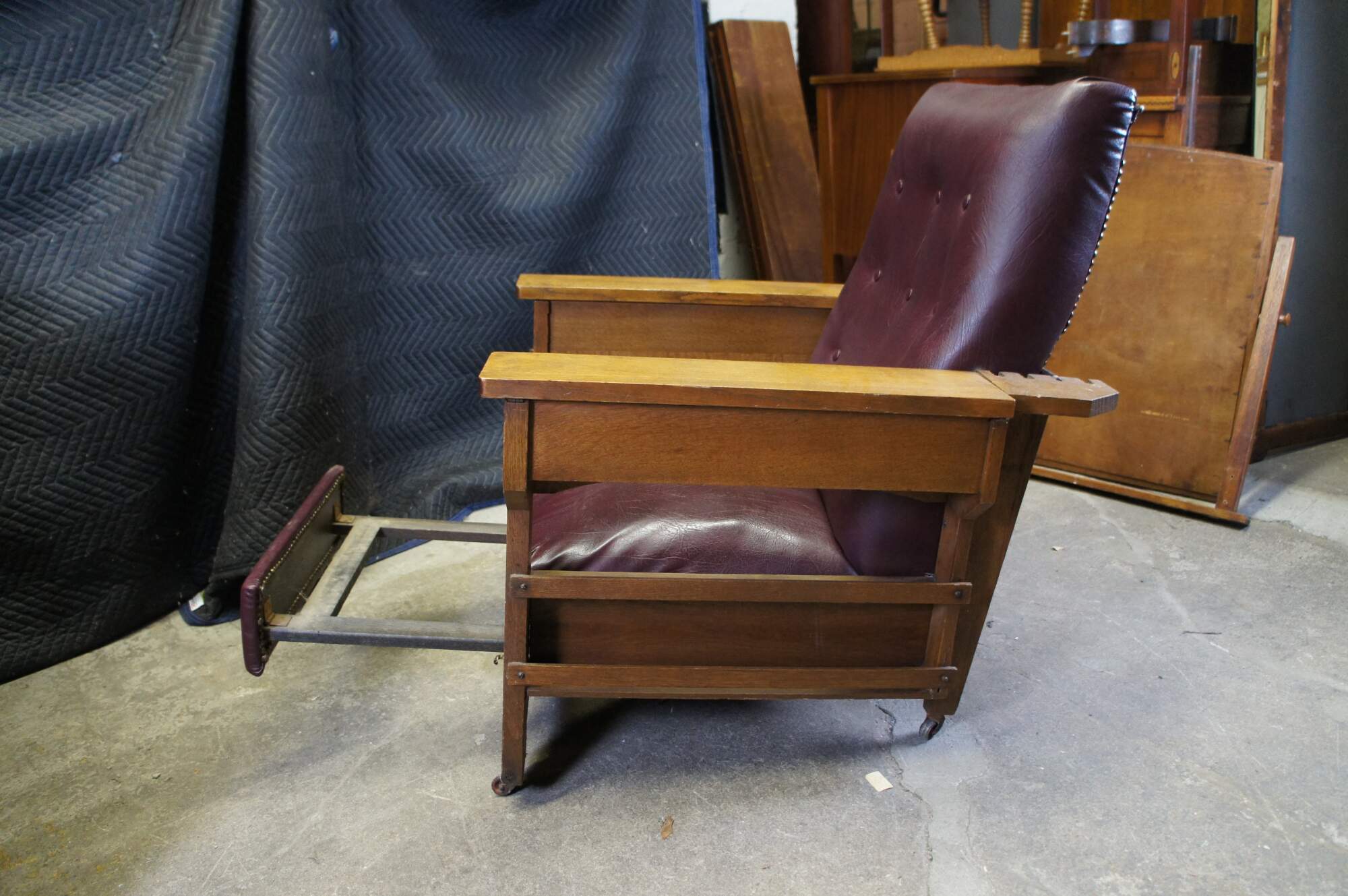 Antique Edwardian Mission / Arts & Crafts Morris Slumber chair by Streit Mfg Co, circa 1908. Made of quartersawn oak featuring slide out footstool and wide flat armrests that open to reveal hidden storage compartments. Each side of the chair has a slatted book / magazine rack and is supported by casters. Upholstered in burgundy tufted vinyl.