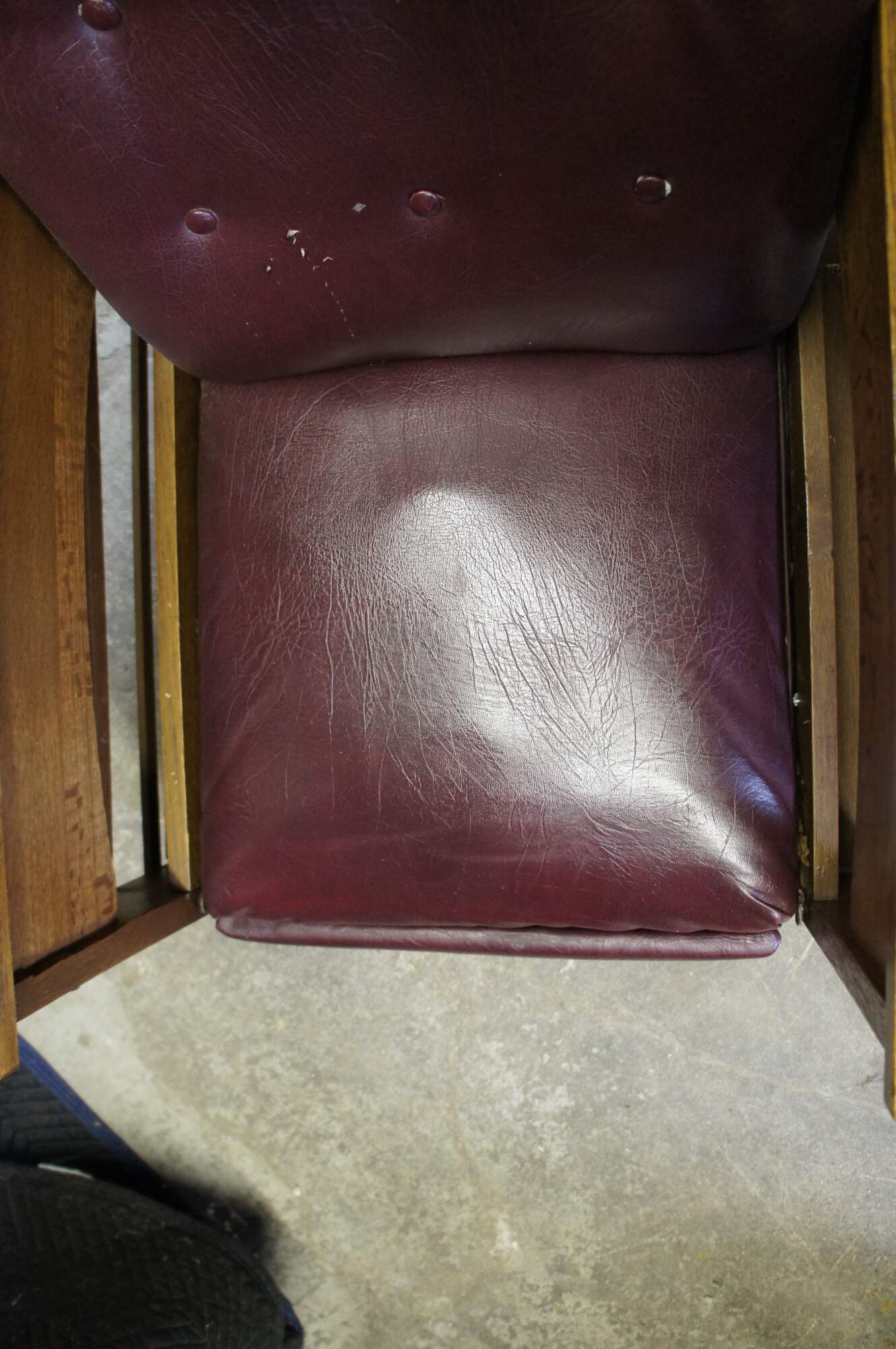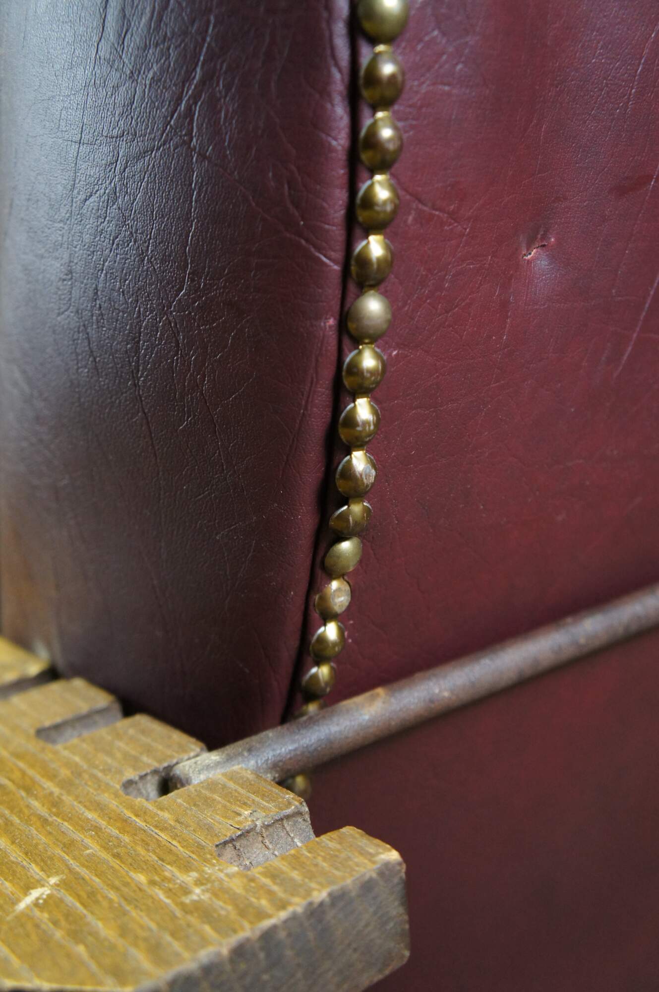 Good antique condition, wear and distressing commensurate with age and use, scuffing / tears / impacts to vinyl, missing nailheads, no longer reclines.