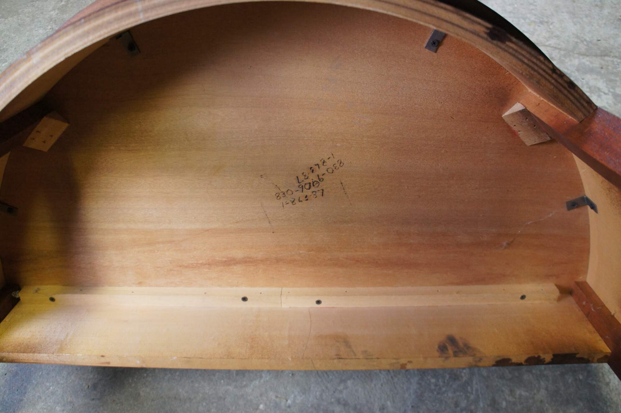Vintage demilune console table or sideboard. Made of mahogany featuring Sheraton / Federal styling with half round form, matchbook top, fan inlay and tapered legs.