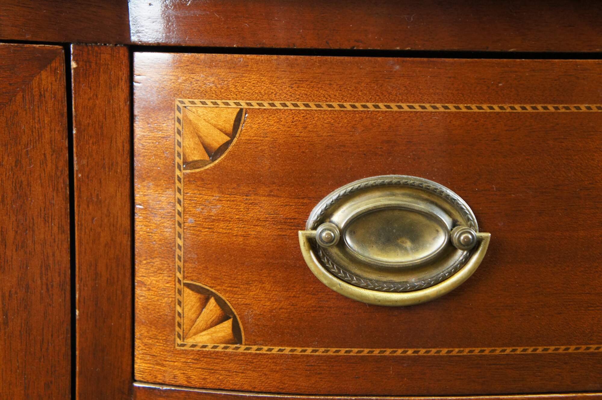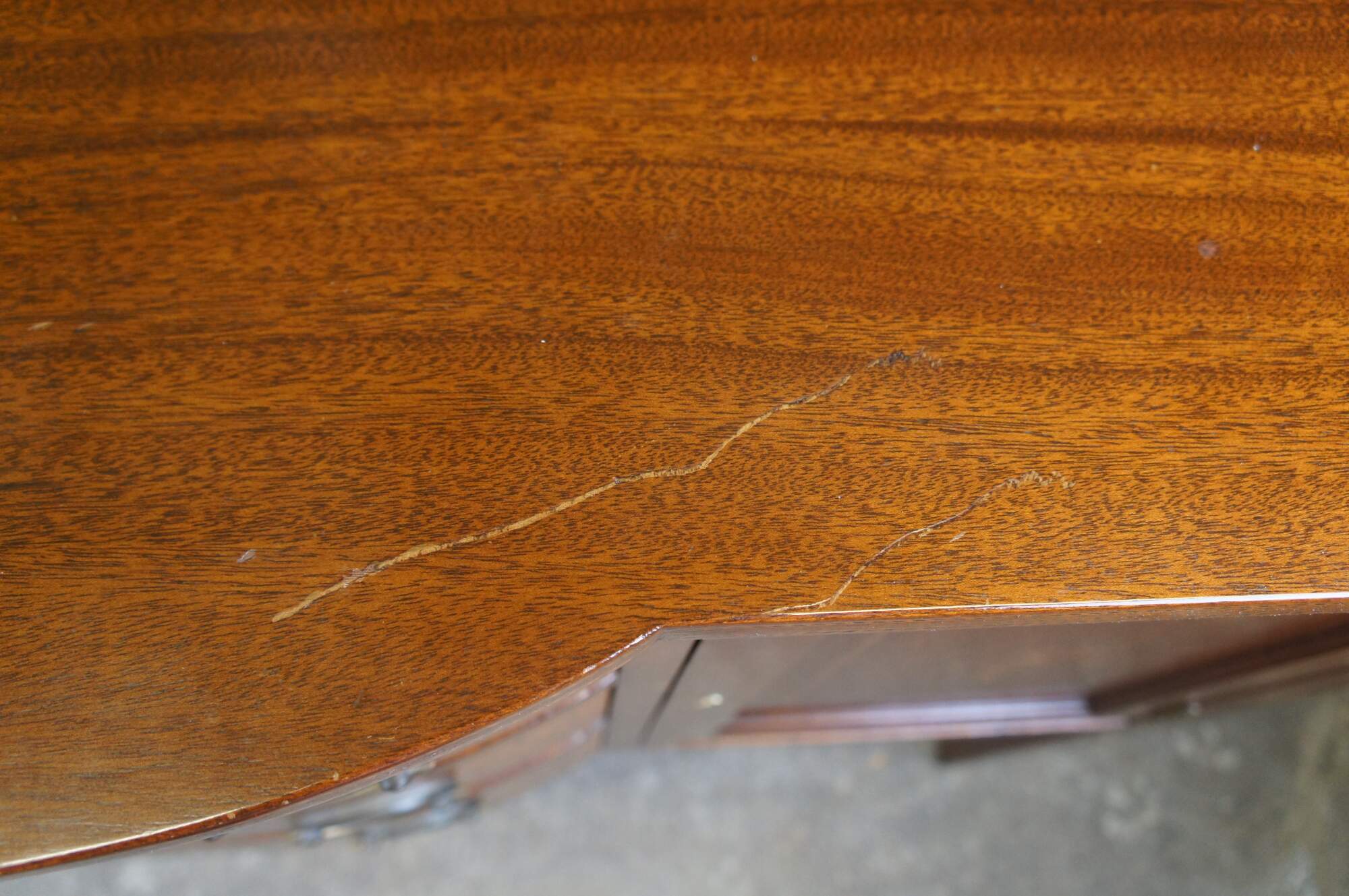 Good antique condition, wear and distressing commensurate with age and use, mark to top near bowfront, fading and marking to case.