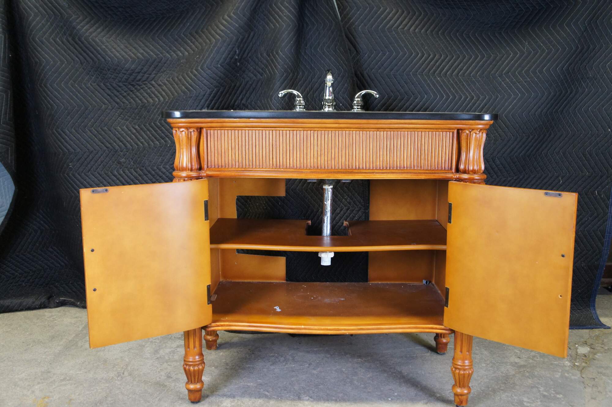 Vintage vanity sink / cabinet featuring a tapered and fluted design with double doors, two shelves, serpentine black granite top, and nickle plated hardware.