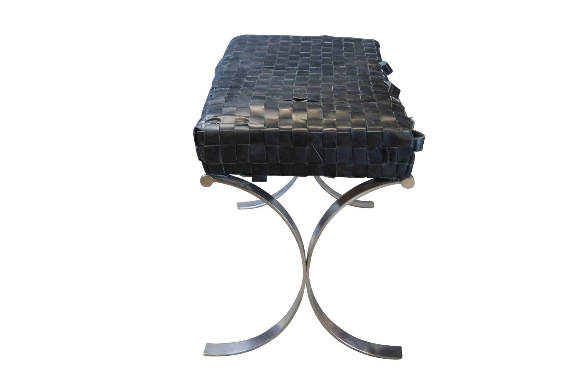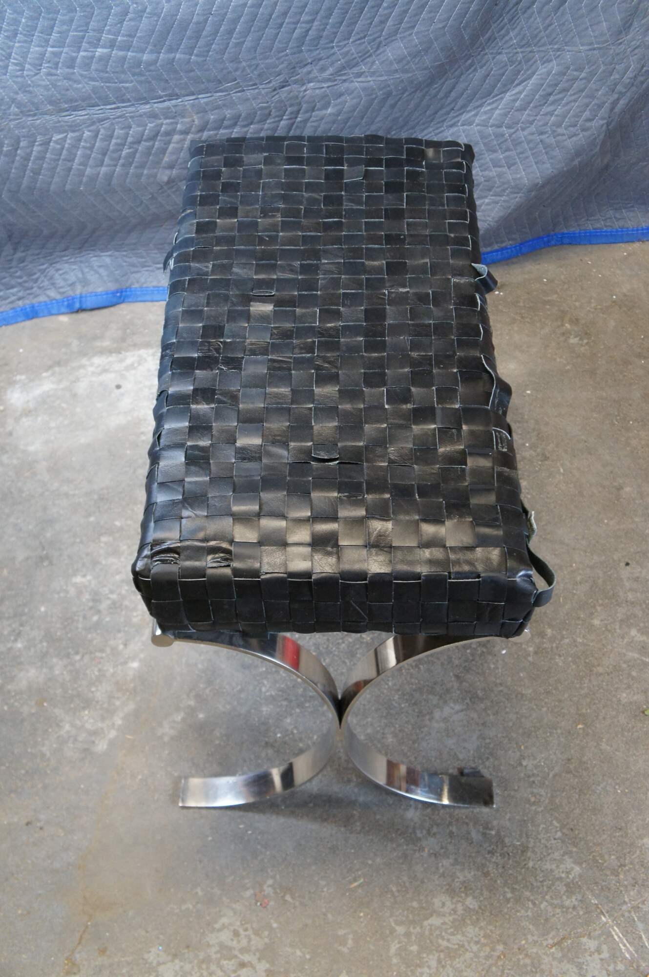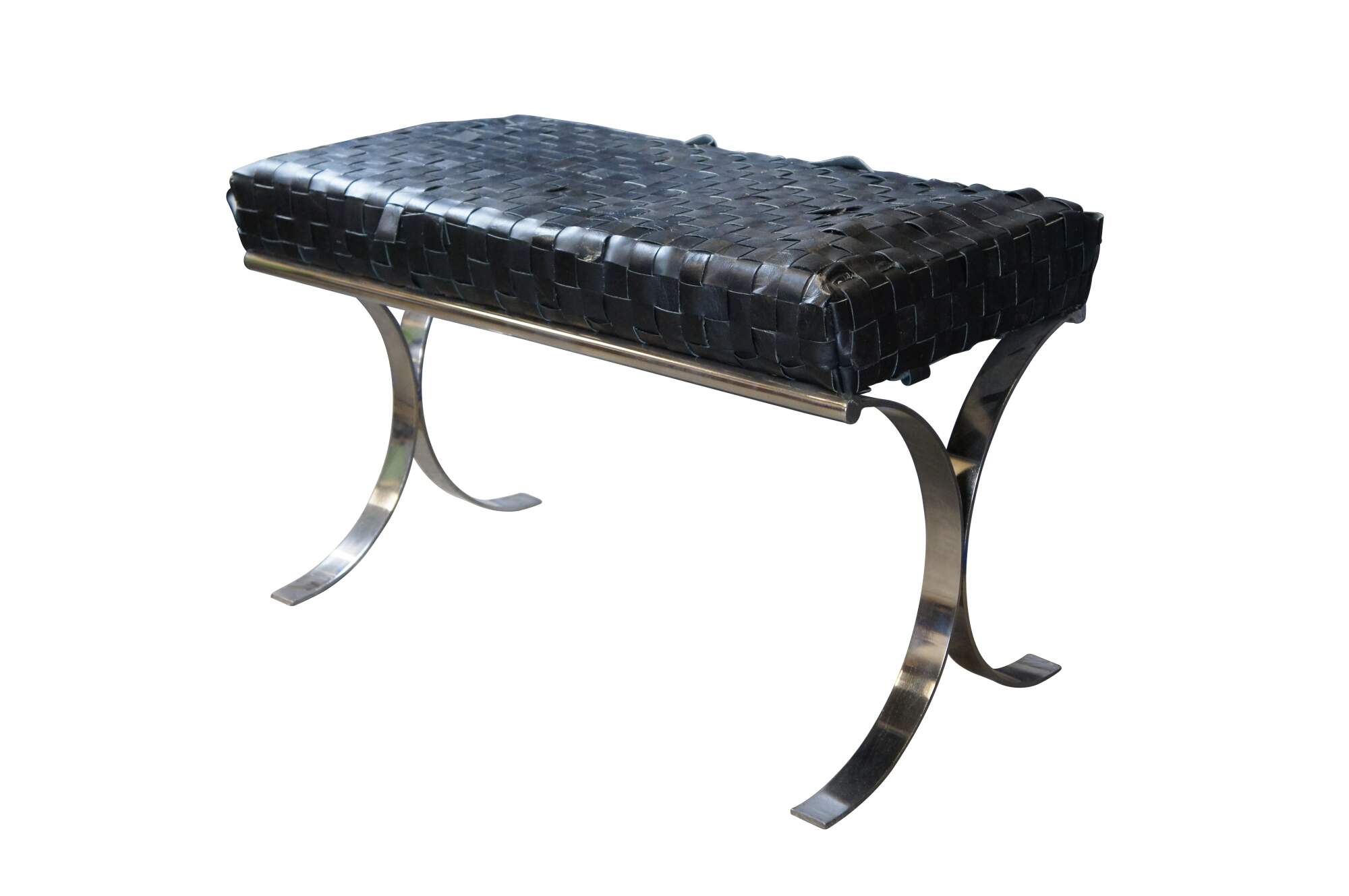 Vintage Barcelona bench / ottoman foot stool or rest featuring rectangular form with a modern tubular and flared chrome frame and woven black leather upholstery.