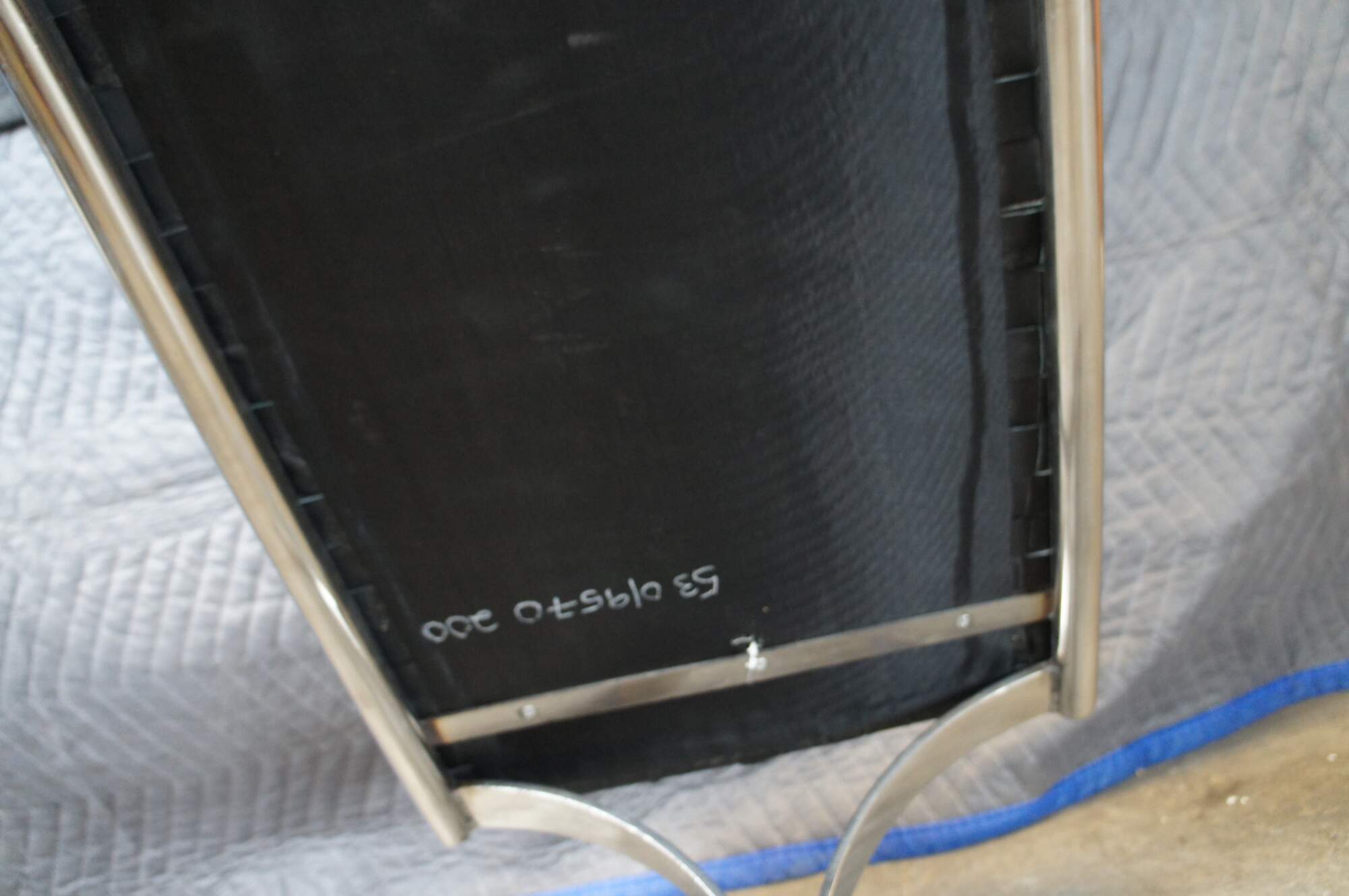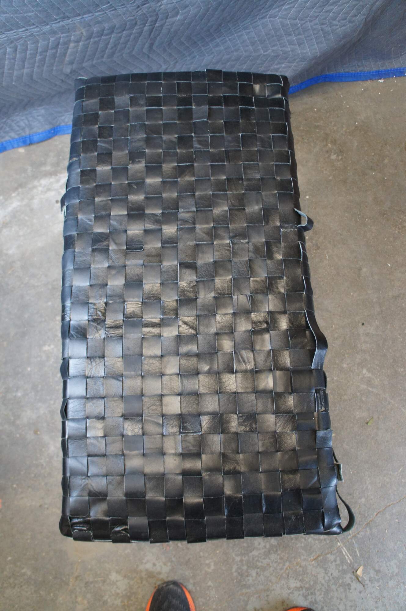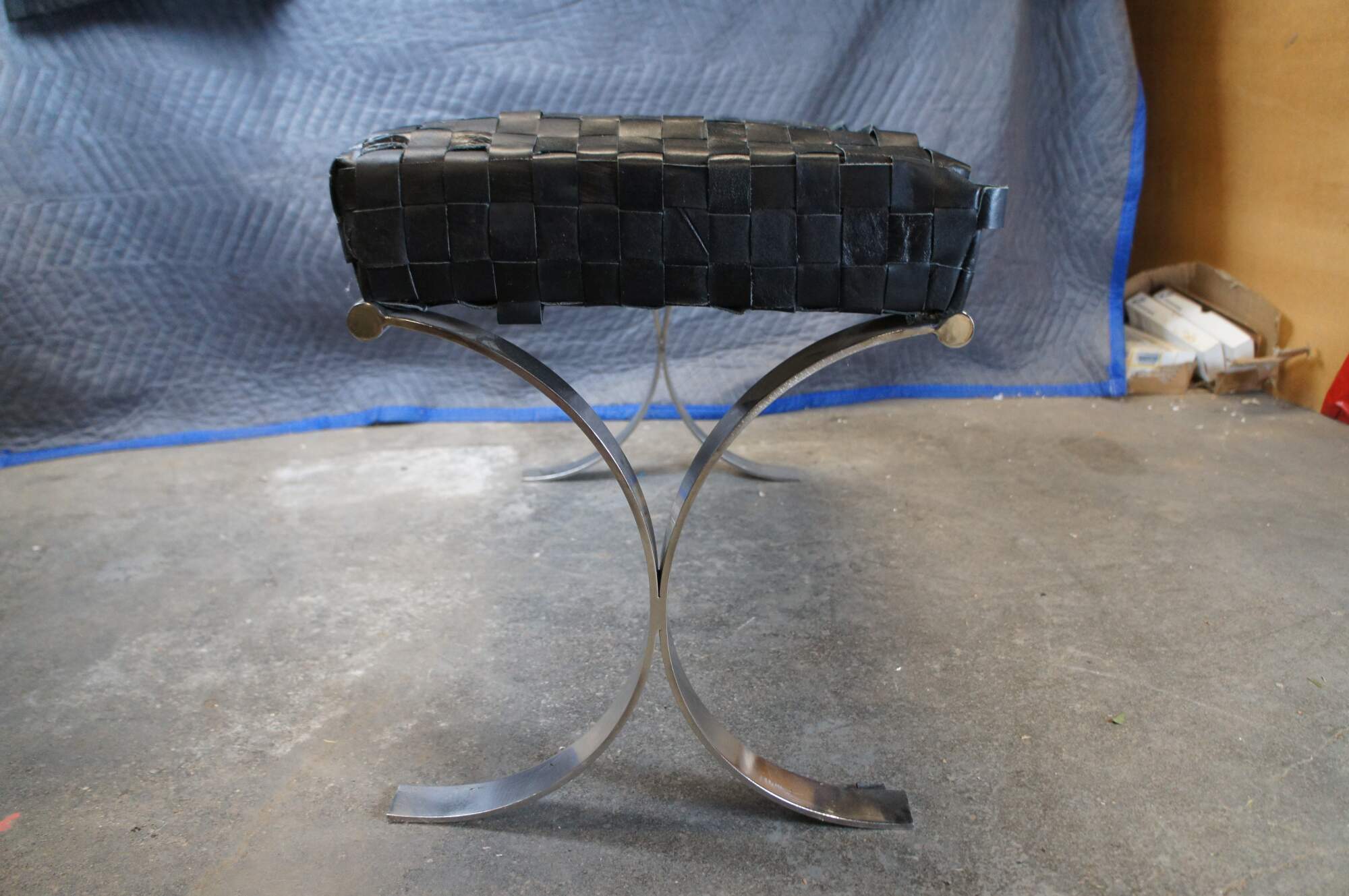 Vintage Barcelona bench / ottoman foot stool or rest featuring rectangular form with a modern tubular and flared chrome frame and woven black leather upholstery.
