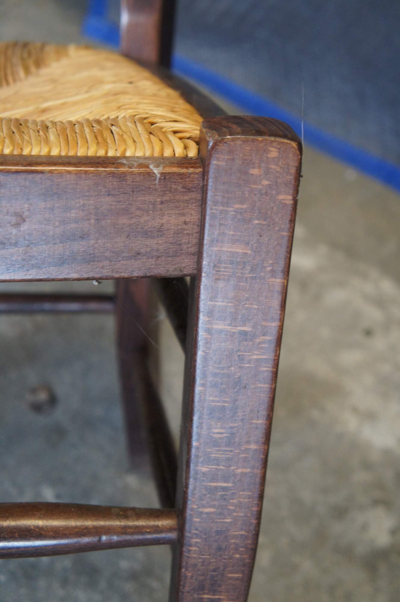 Pair of two vintage Pottery Barn Napoleon Harvest / Country / Farmhouse dining chairs. Made of oak featuring Tuscan styling with rush seat and oval splat back. Made in Italy.