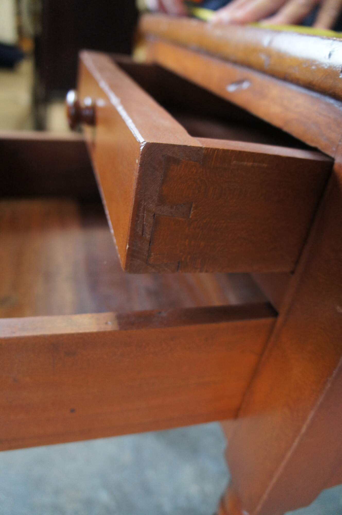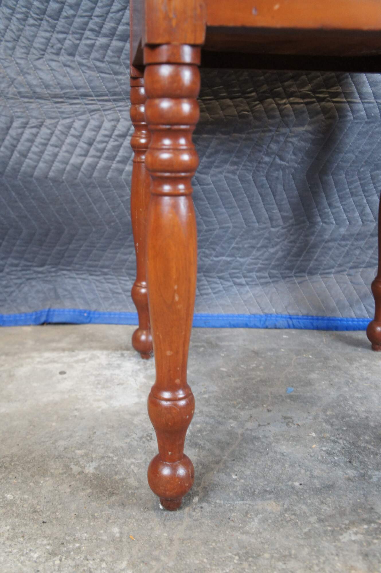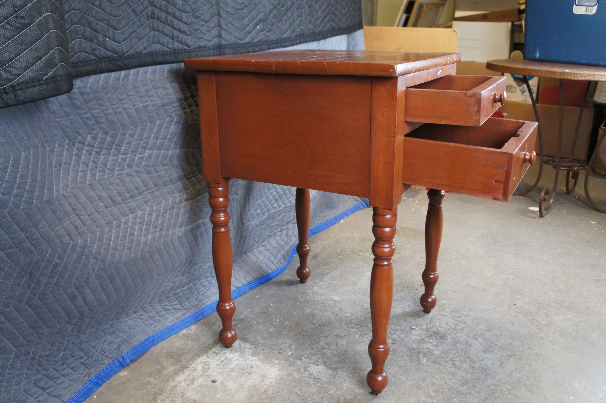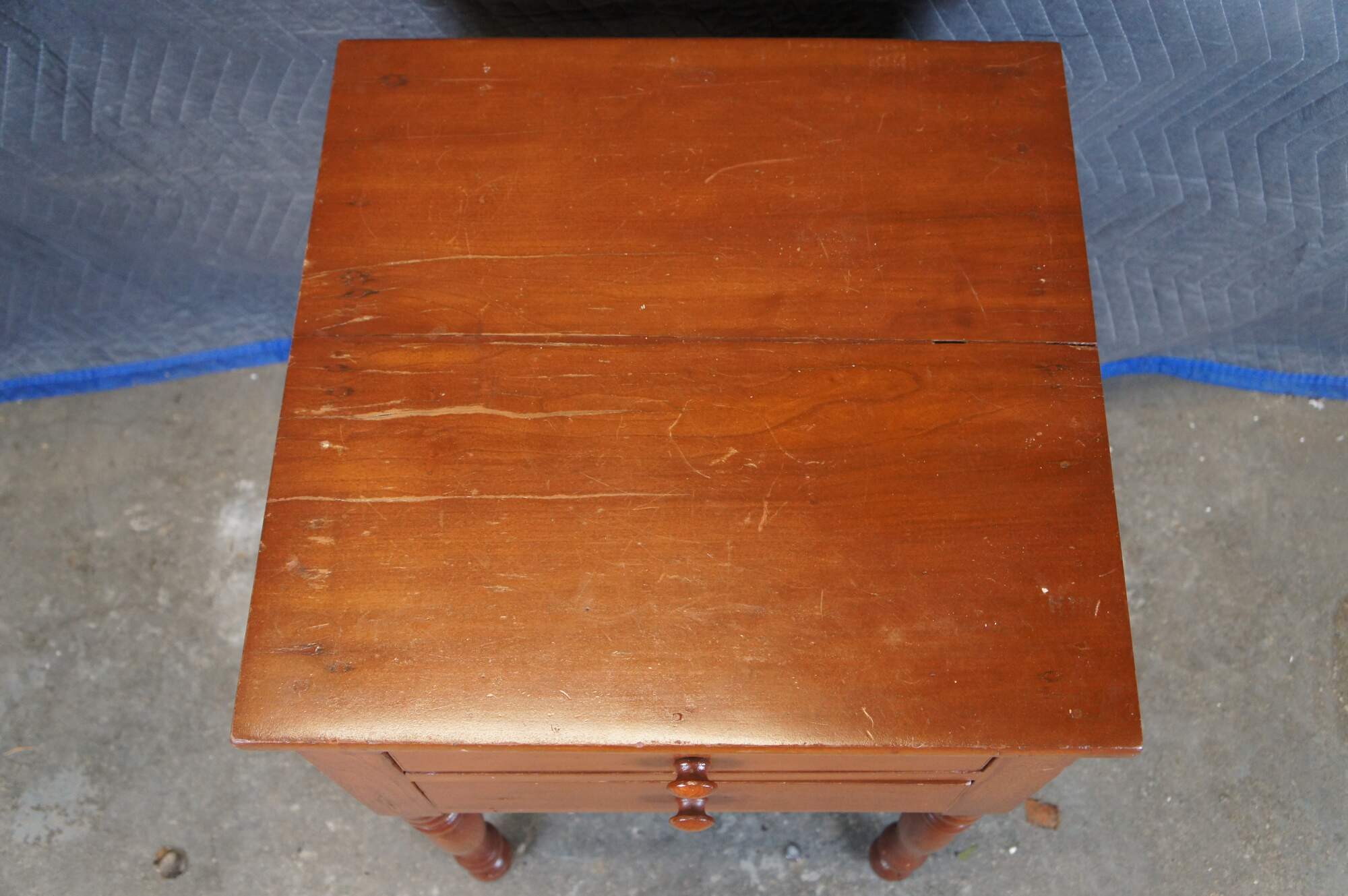Antique Early American 19th century side table. Made of cherry featuring rectangular form with two dovetailed drawers over long turned legs.