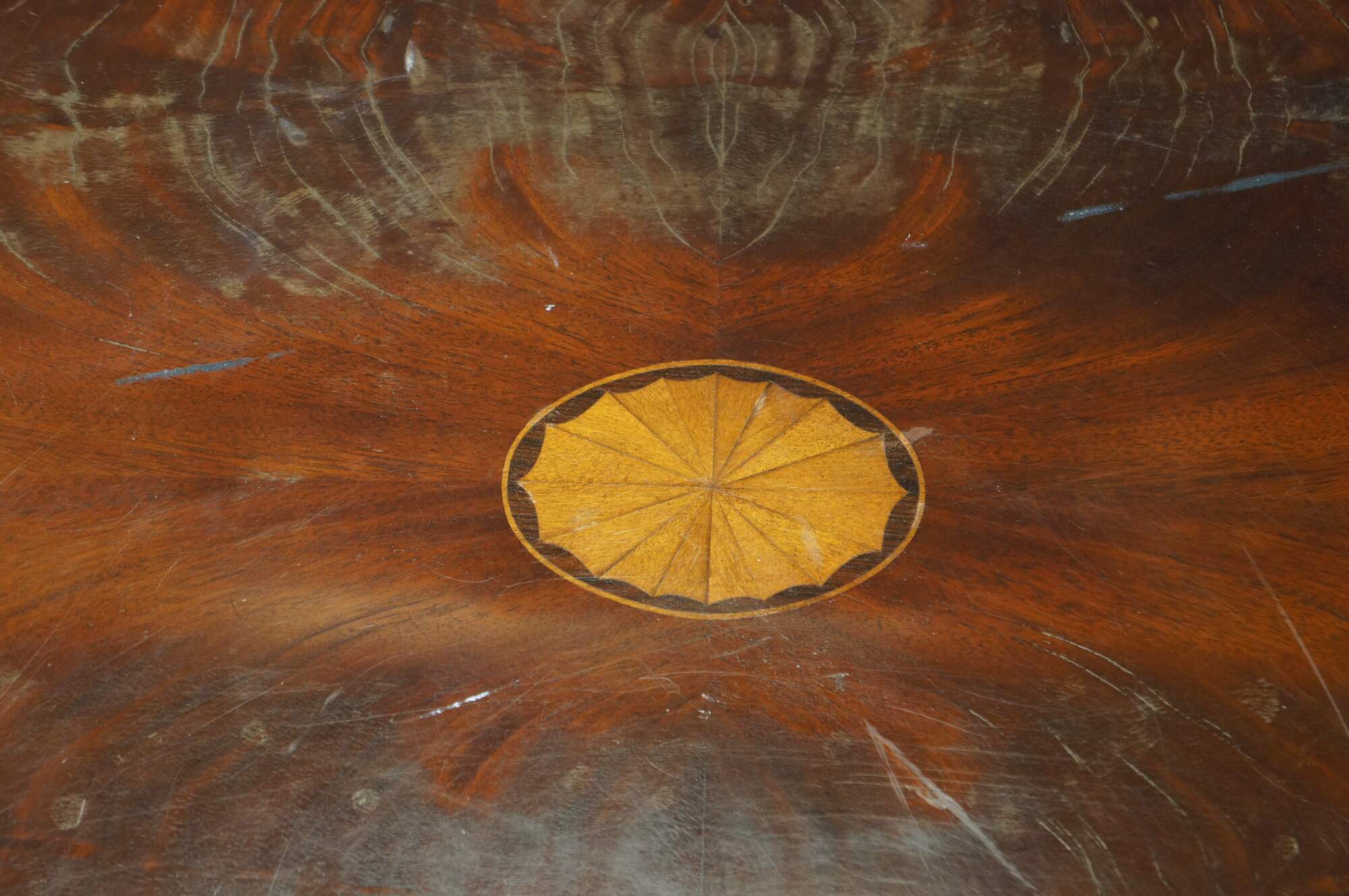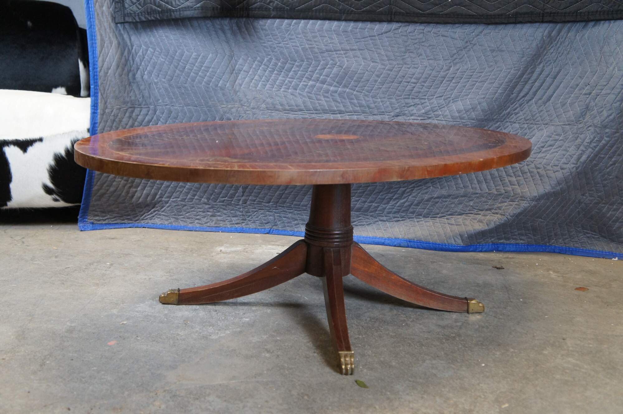 Vintage Hekman Furniture oval coffee or cocktail table featuring English Georgian styling with crotch mahogany top and inlaid satinwood over pedestal base with four moluded splay legs capped with brass claw feet. Circa 1987.
