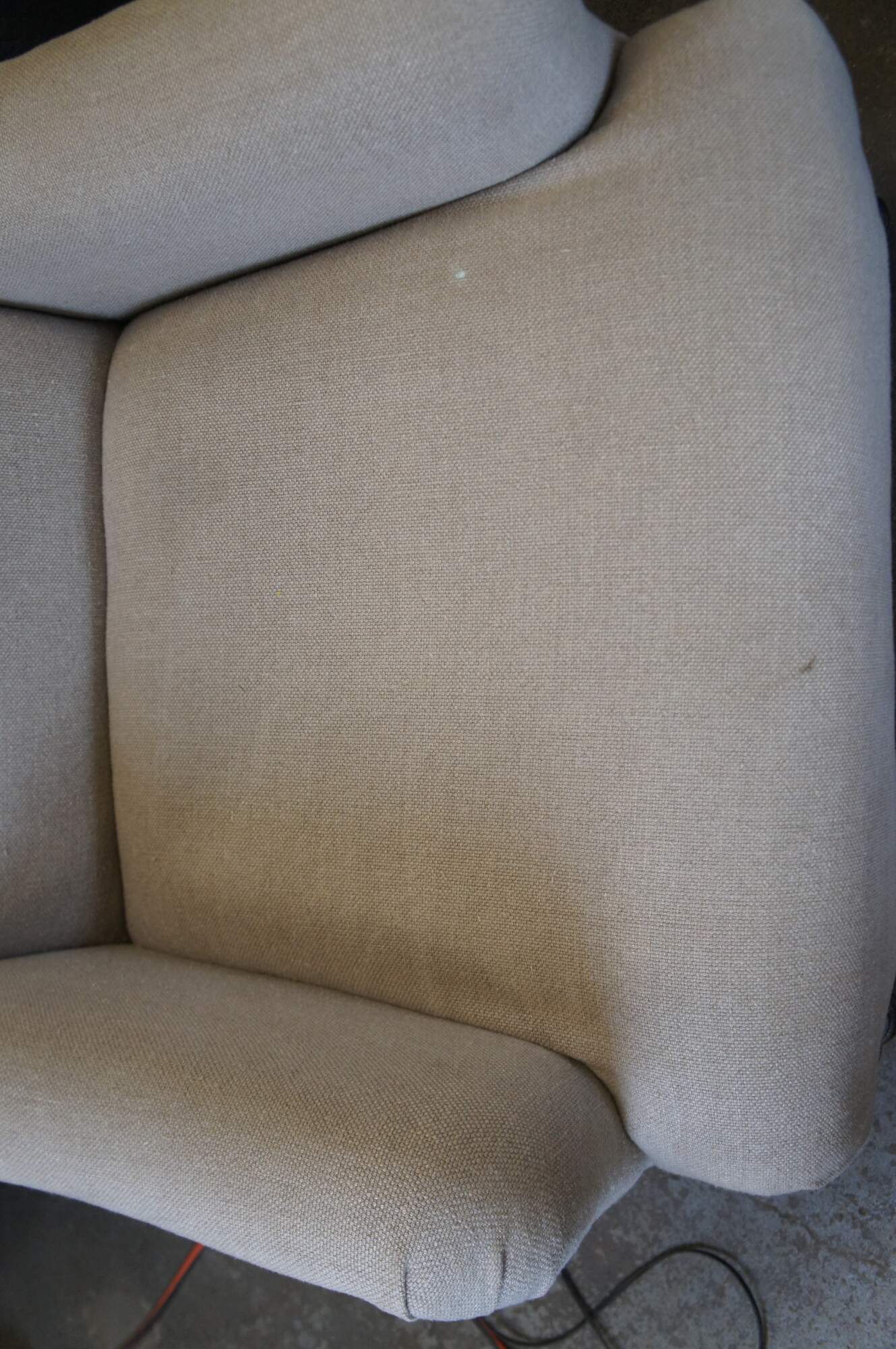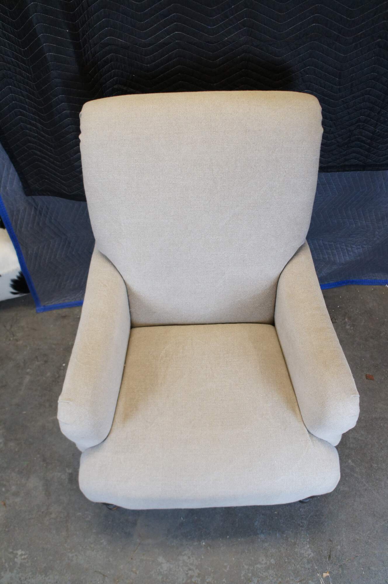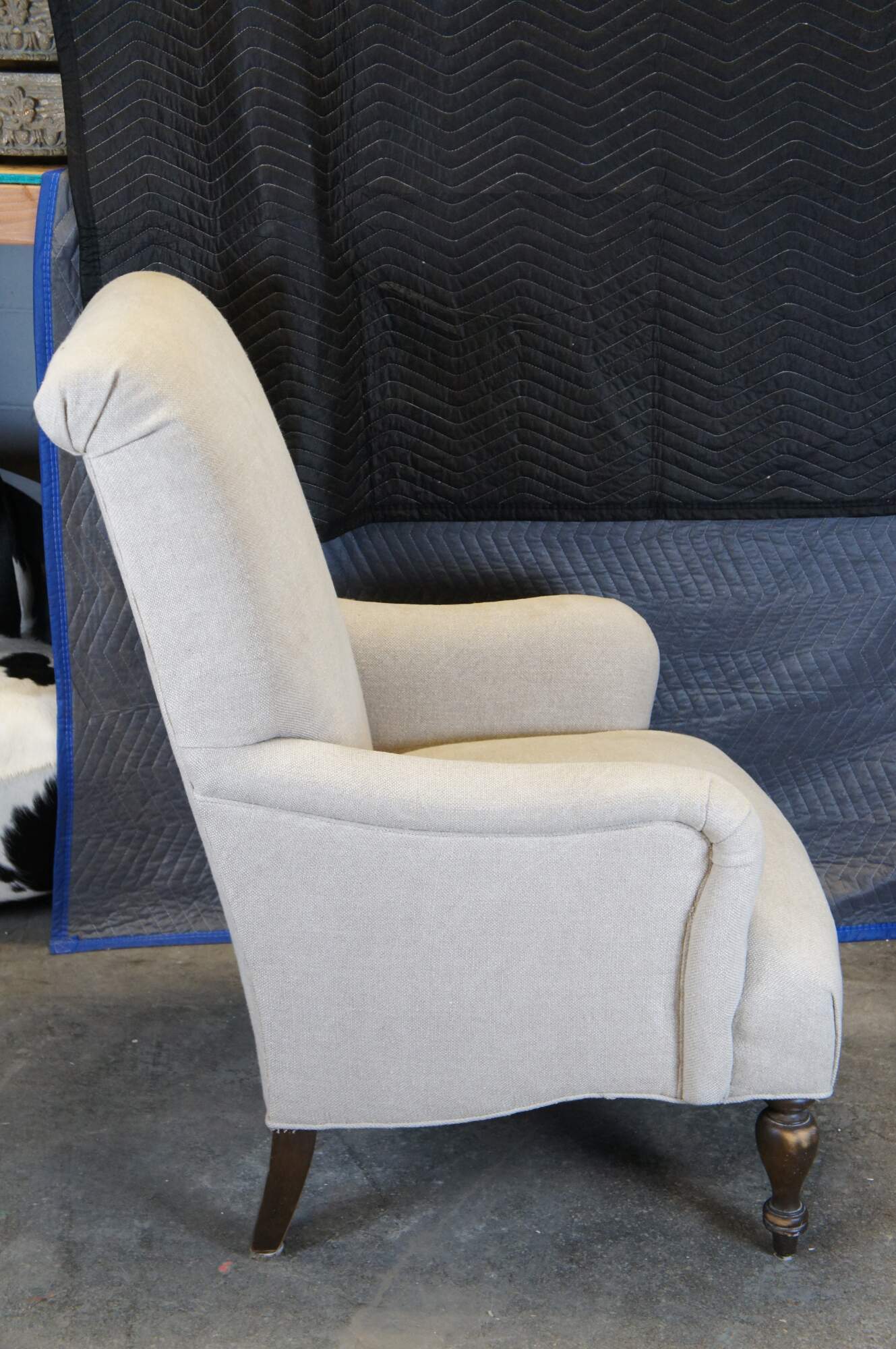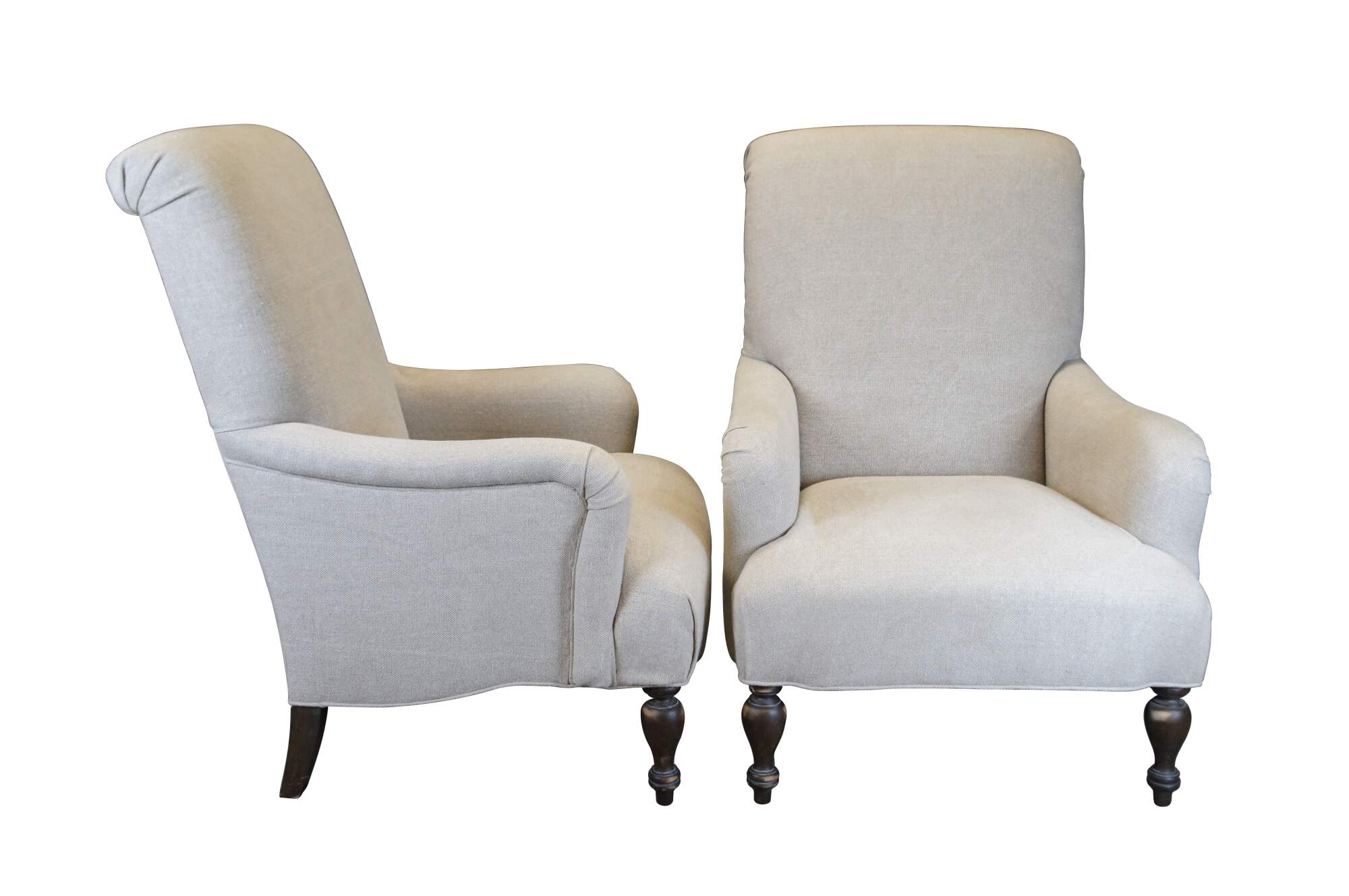 Pair of two vintage Paul Robert Quinn 7010 arm chairs featuring linen fabric with rolled back and padded arms over turned legs.