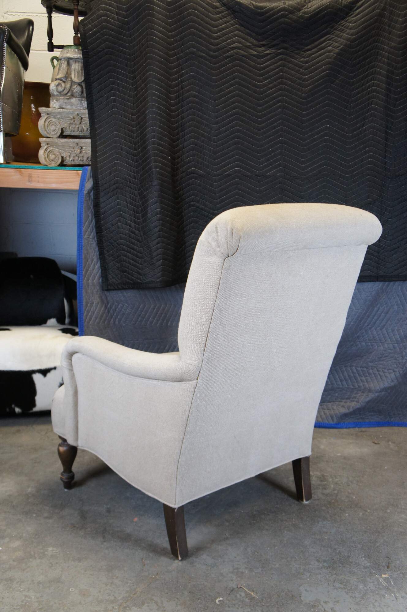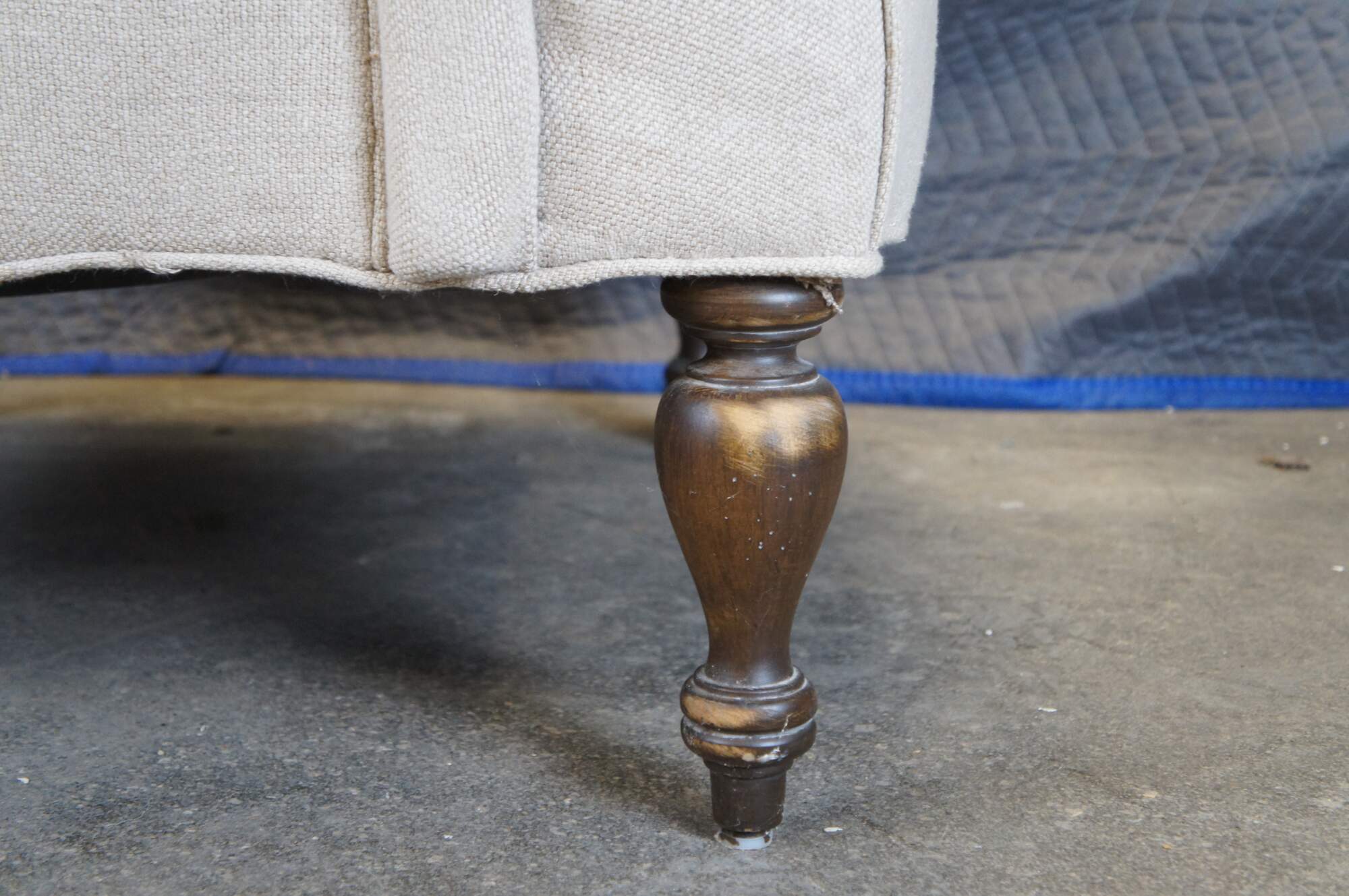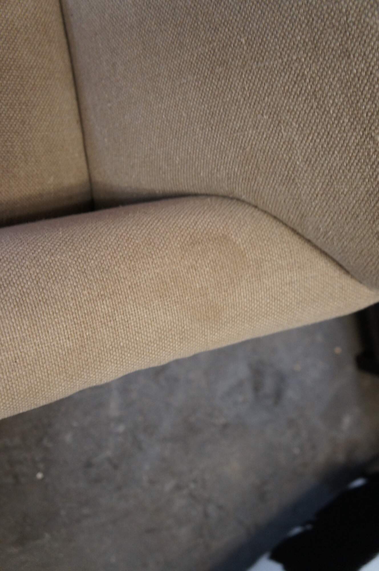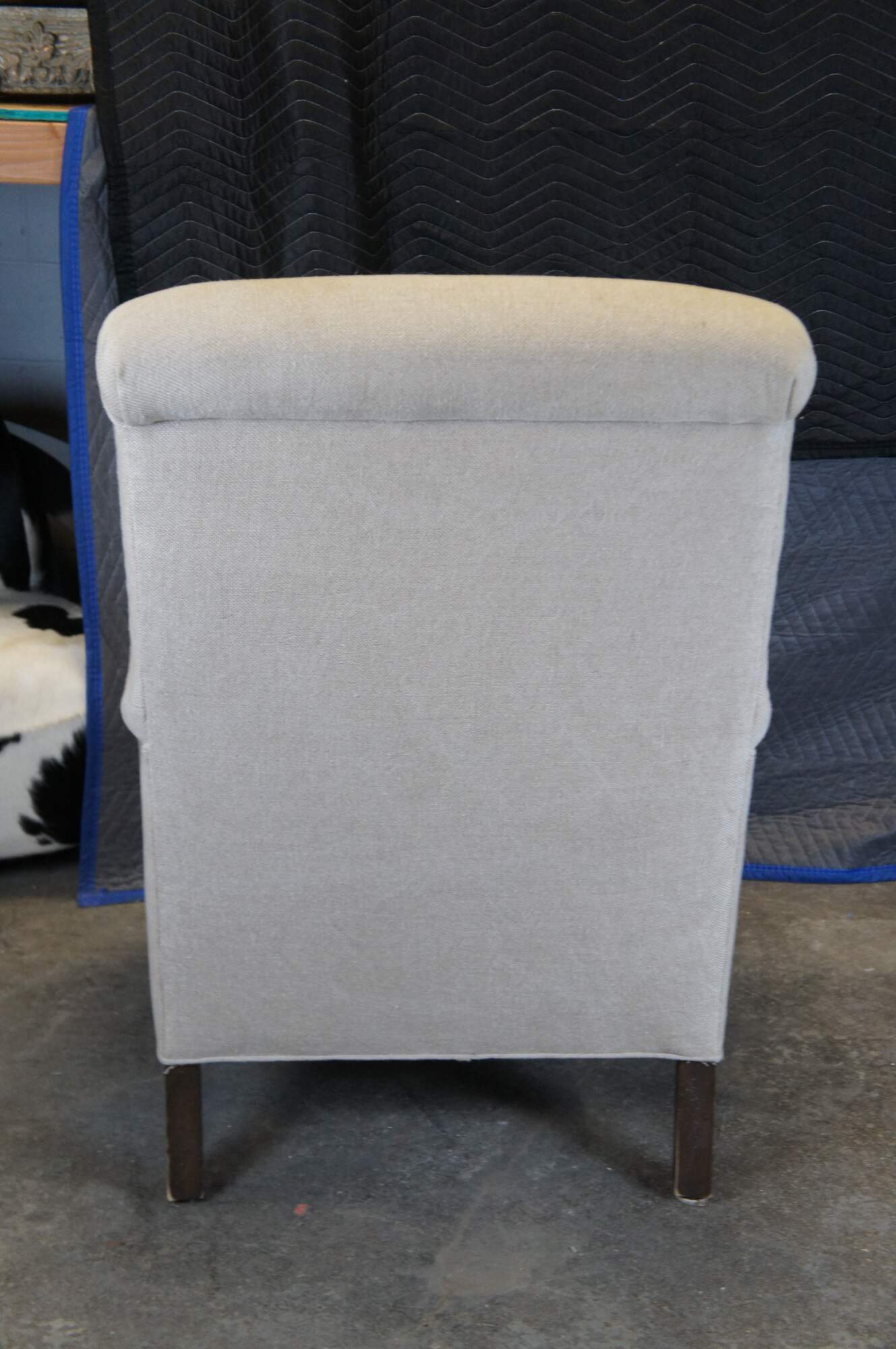 Pair of two vintage Paul Robert Quinn 7010 arm chairs featuring linen fabric with rolled back and padded arms over turned legs.