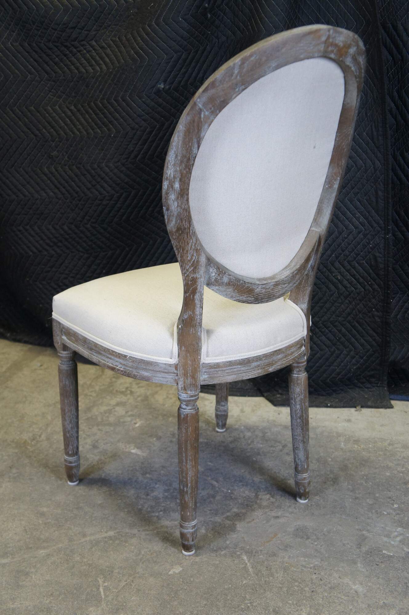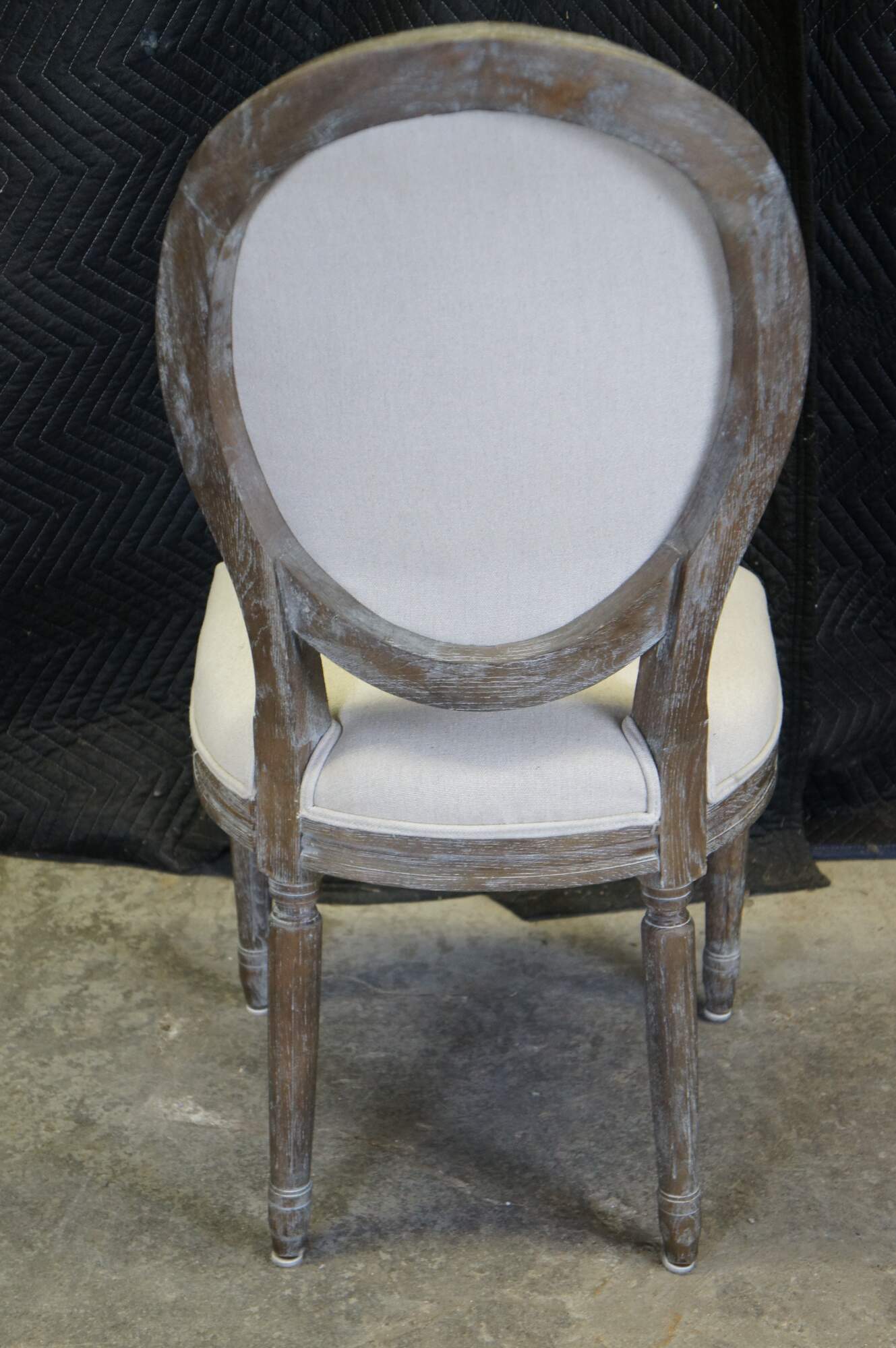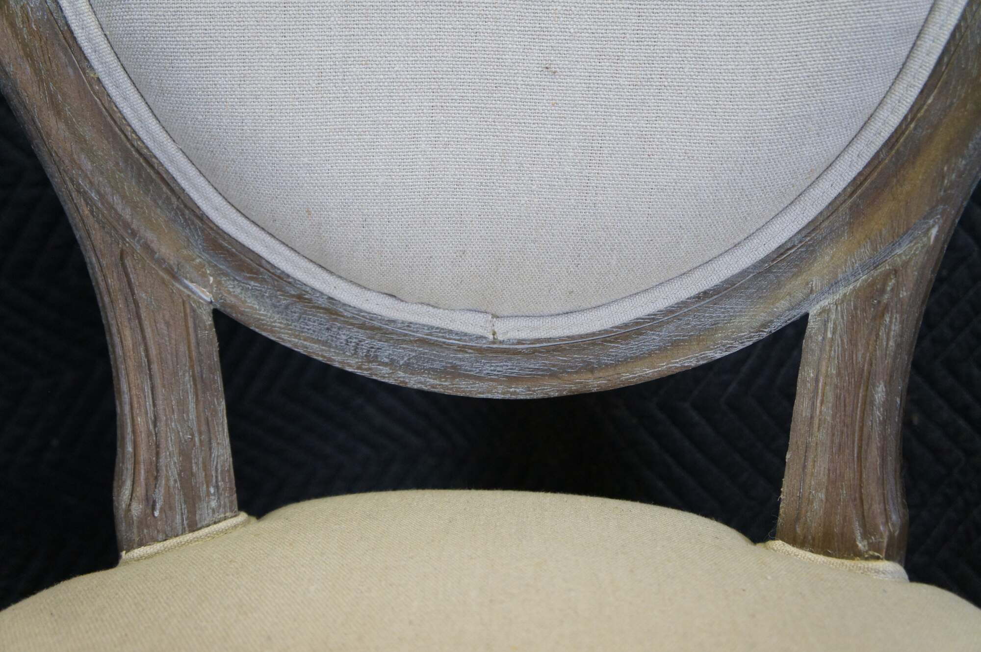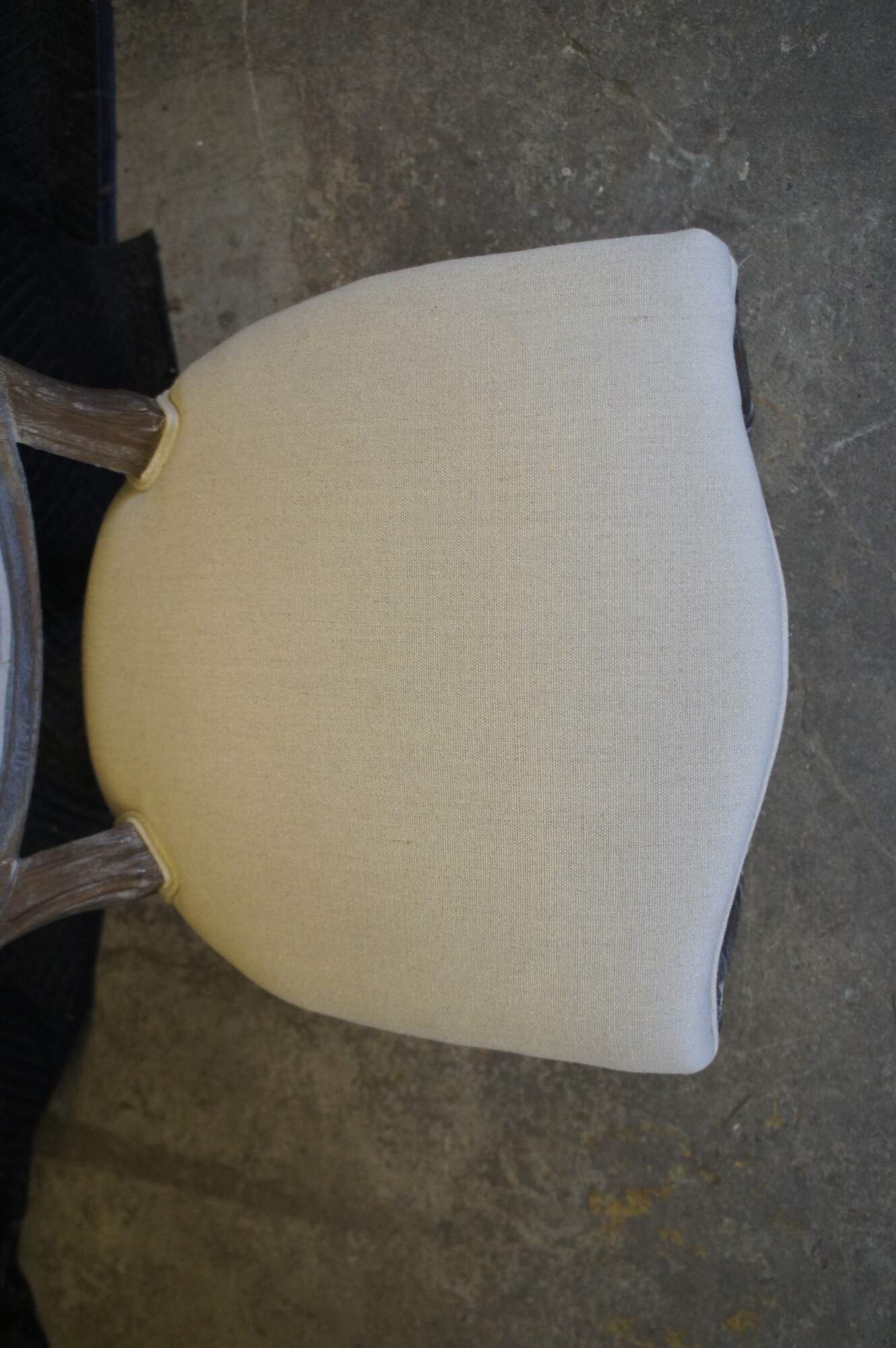 Set of six vintage Restoration Hardware oak dining chairs featuring French Country / Tuscan styling and finished in a natural limed white wash with Belgian linen upholstery.