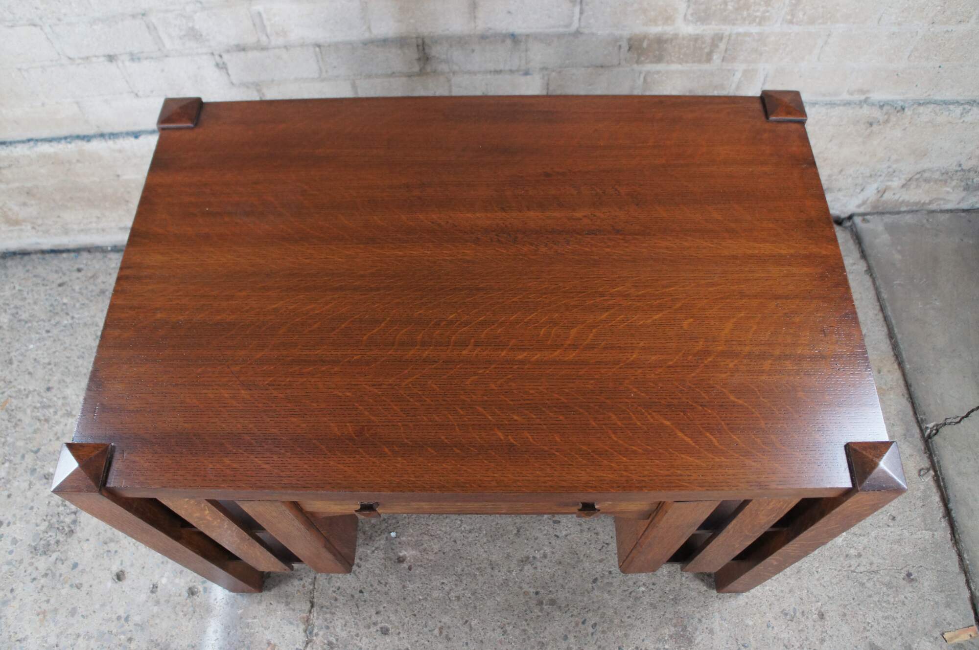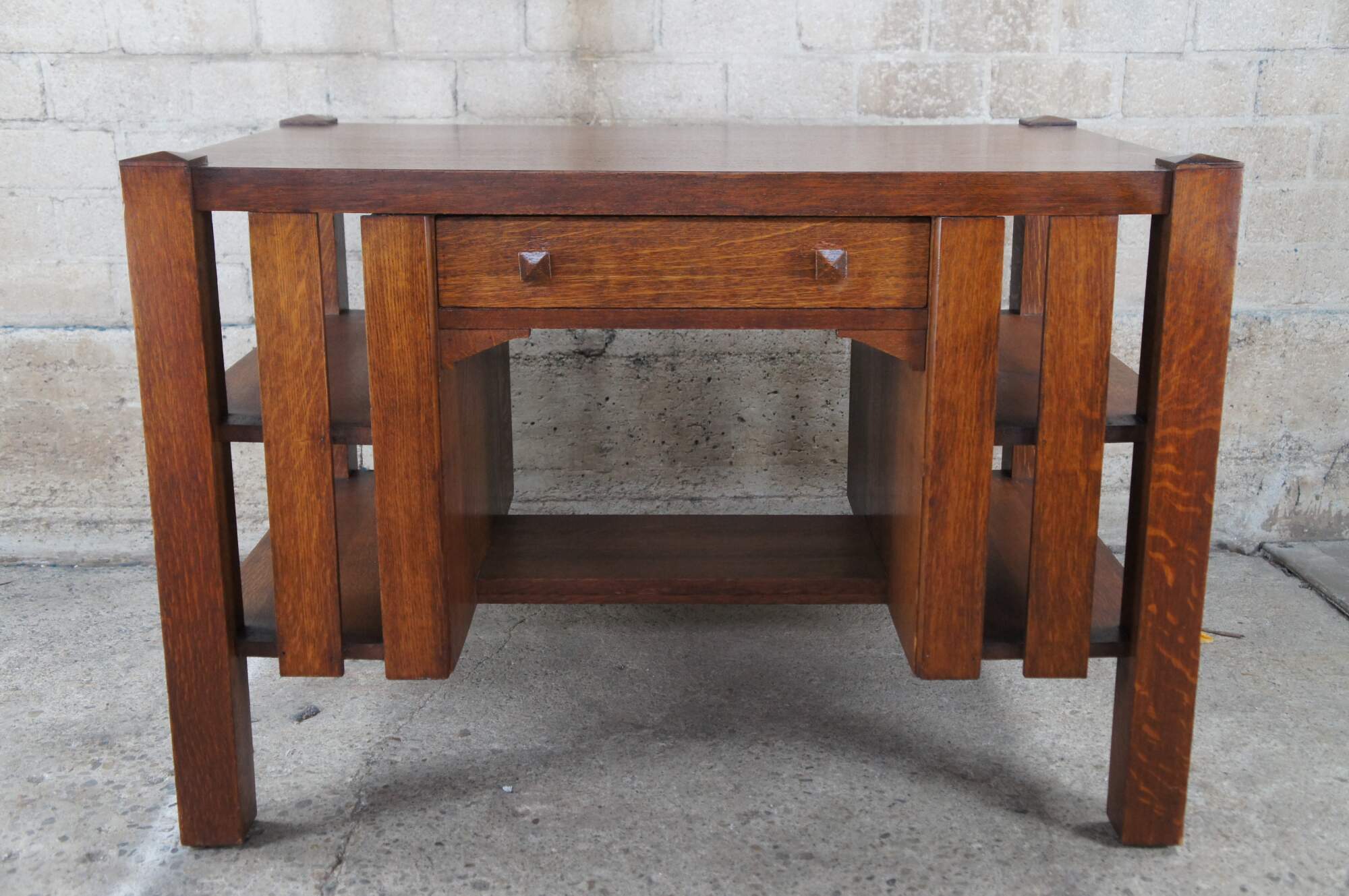 An early 20th Century Mission / Arts & Crafts / Craftsman library table. Features a rectangular form made from quartersawn oak with a dovetailed drawer flanked by bookshelves on the outside. The desk is finished on all sides allowing for use in the middle of any room or library.