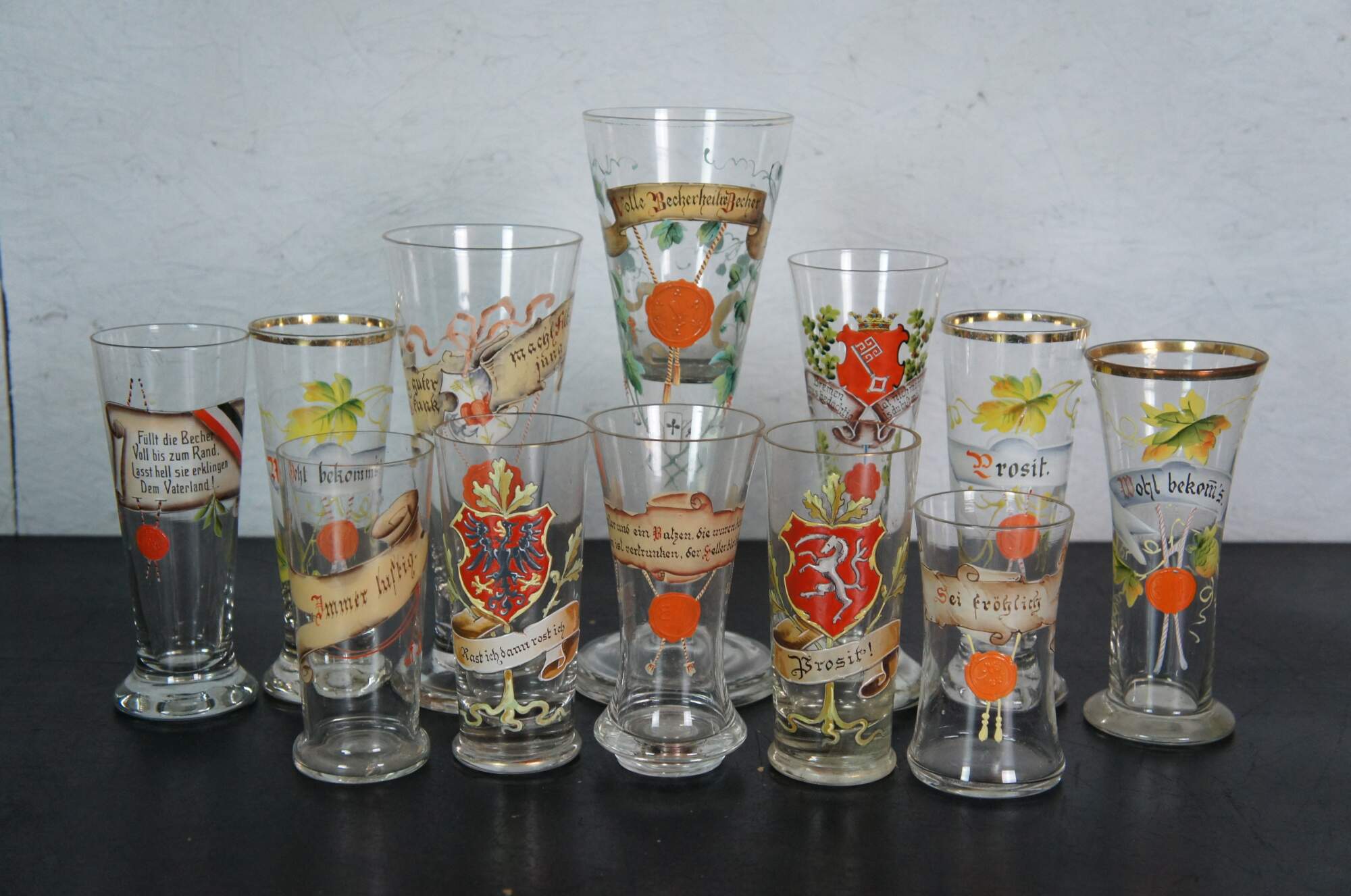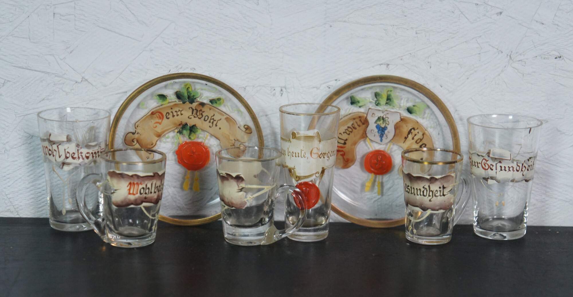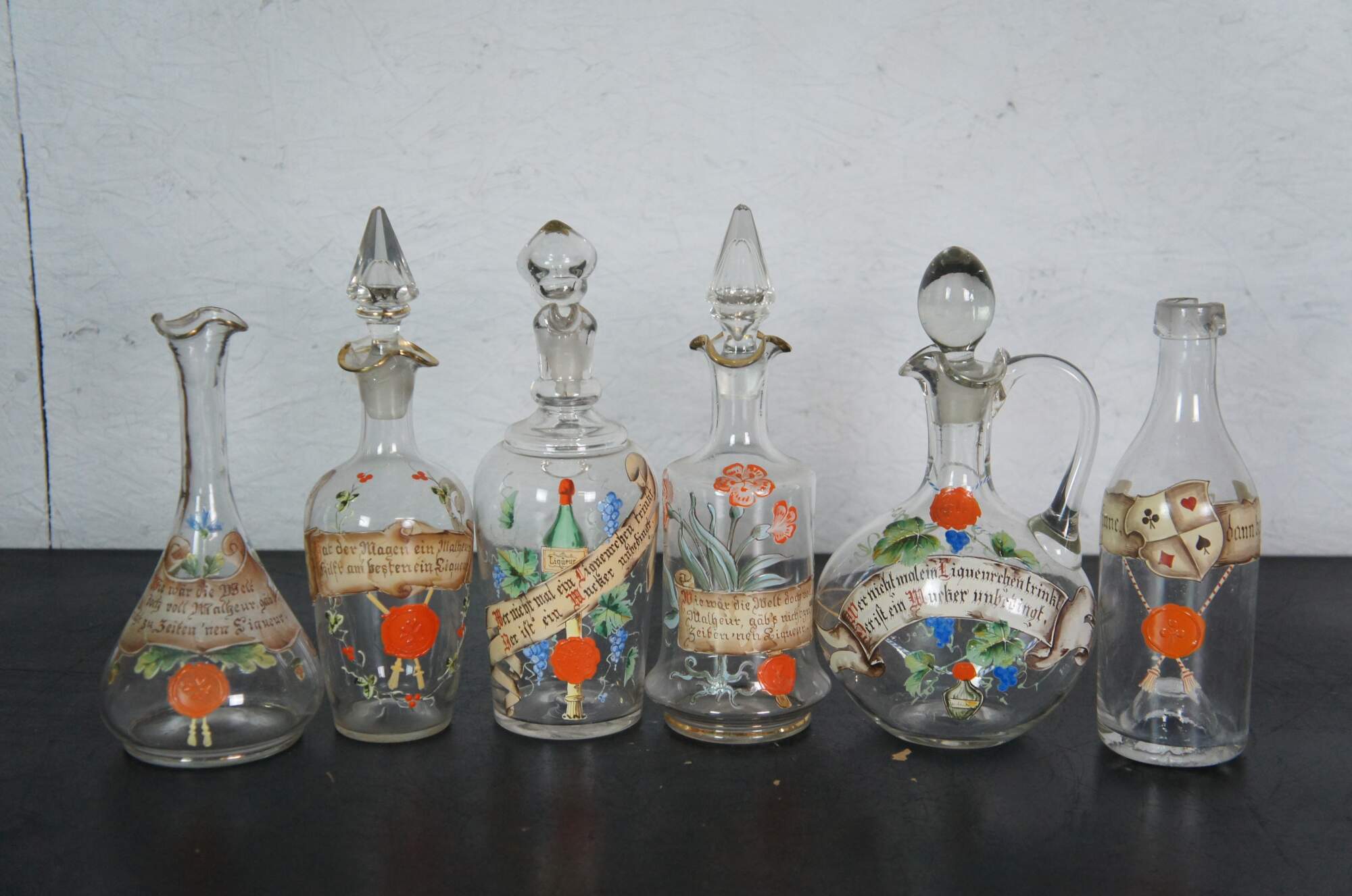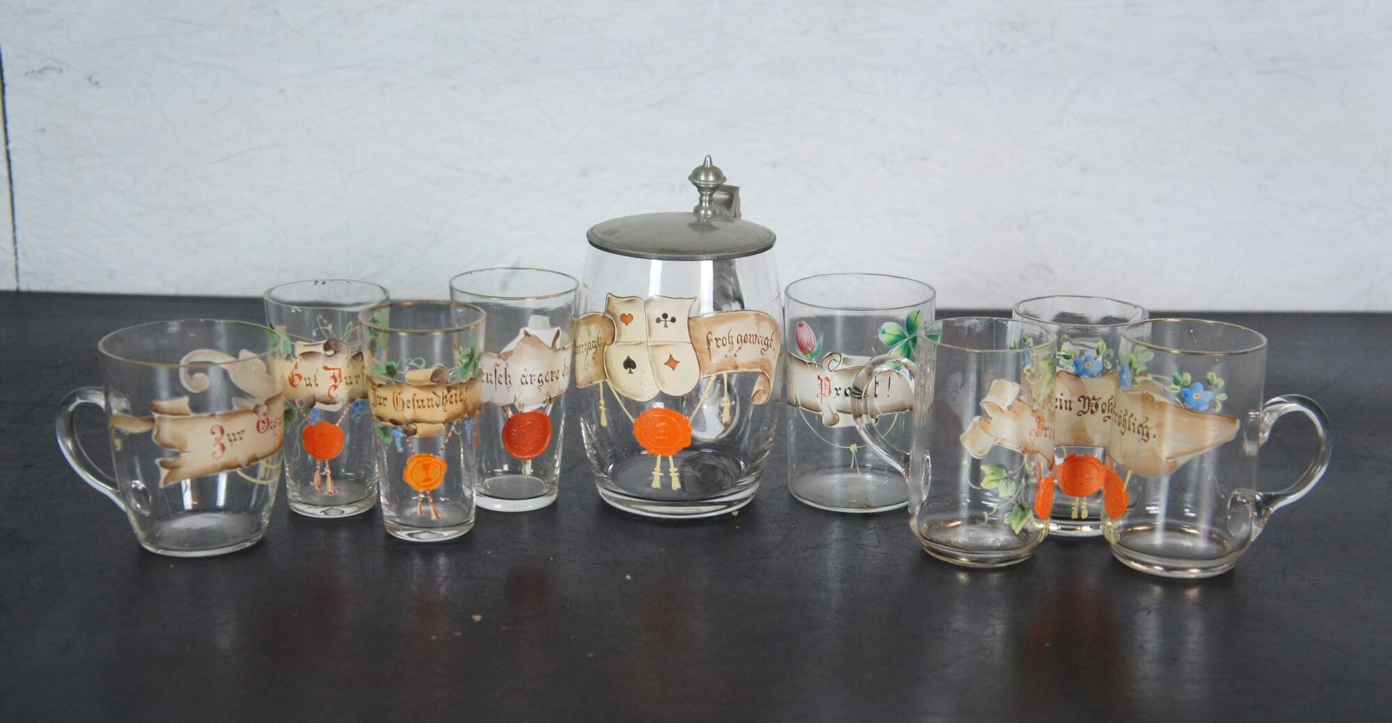 Immense and rare 83 piece lot of antique Bohemian / German glassware / bar glassware - clear hand blown glass with hand painted enamel mottos and beehive designs. Some with gilt details. Most also feature red / orange wax seal. Set includes: 2 Coasters, 6 Shot Glasses, 6 Schnapps / Cordial Glasses, 4 Mugs, 26 Tumblers / Beer Glasses, 20 Goblets, 1 Lidded Stein, 12 Decanters, 3 Pitchers, and 3 Tall Lidded Canisters / Celery Vases.