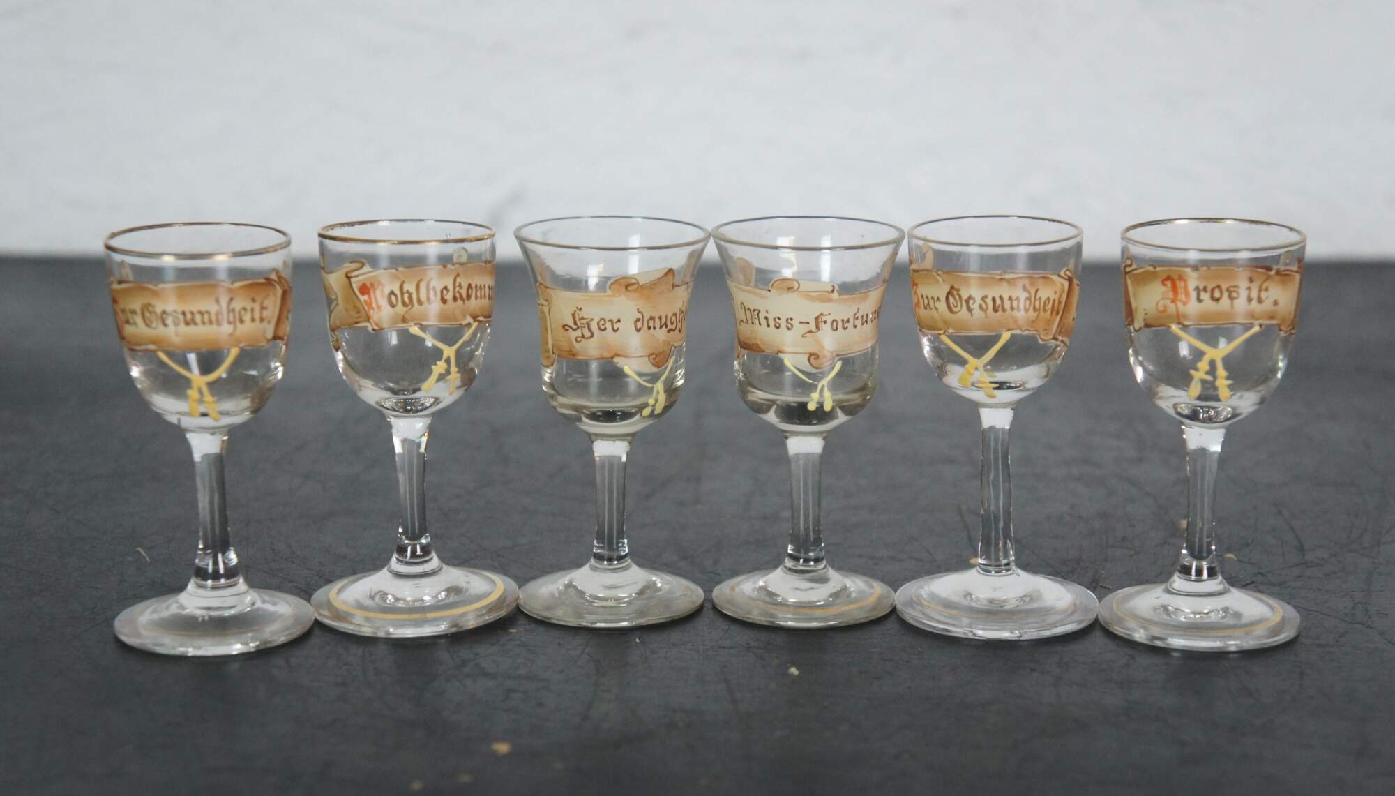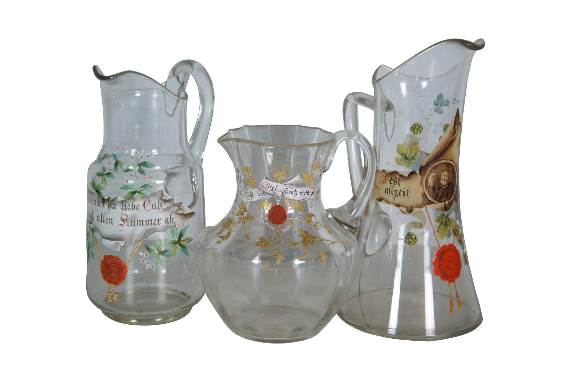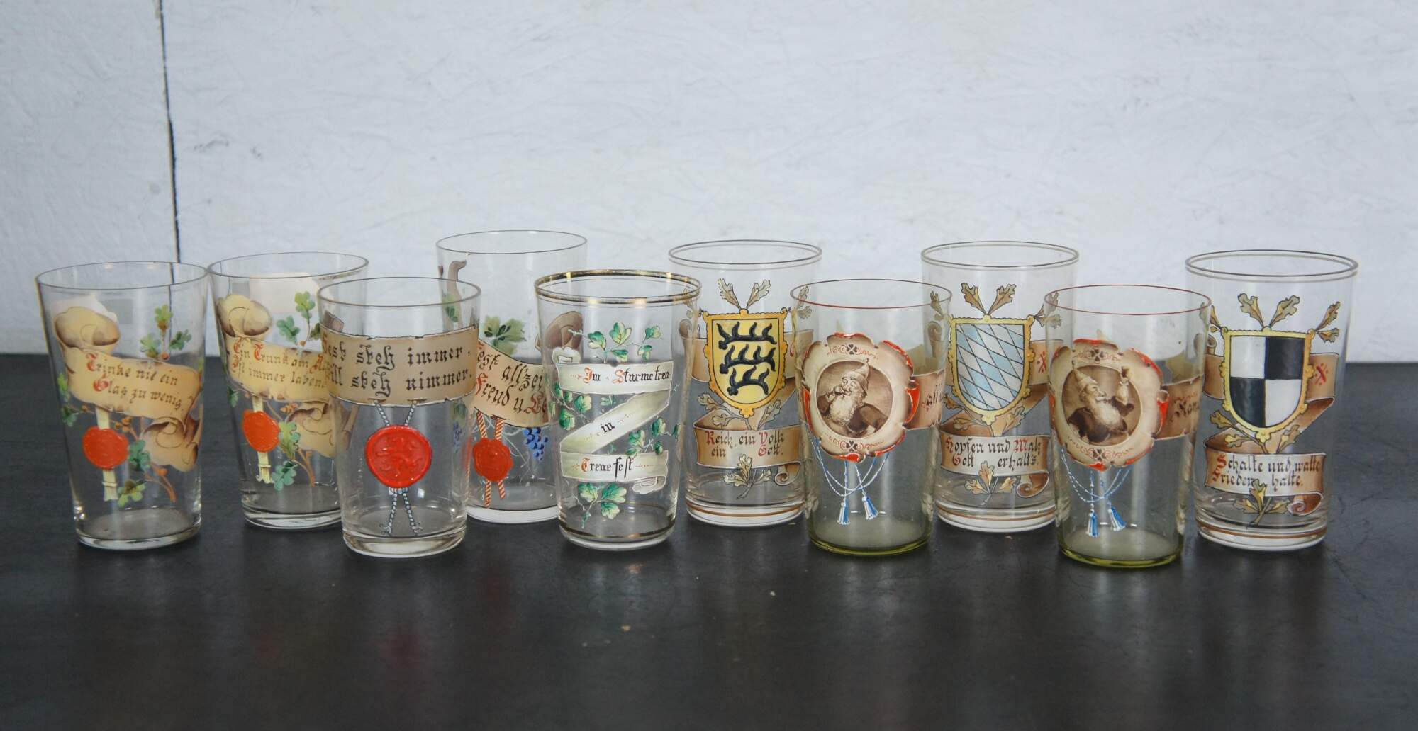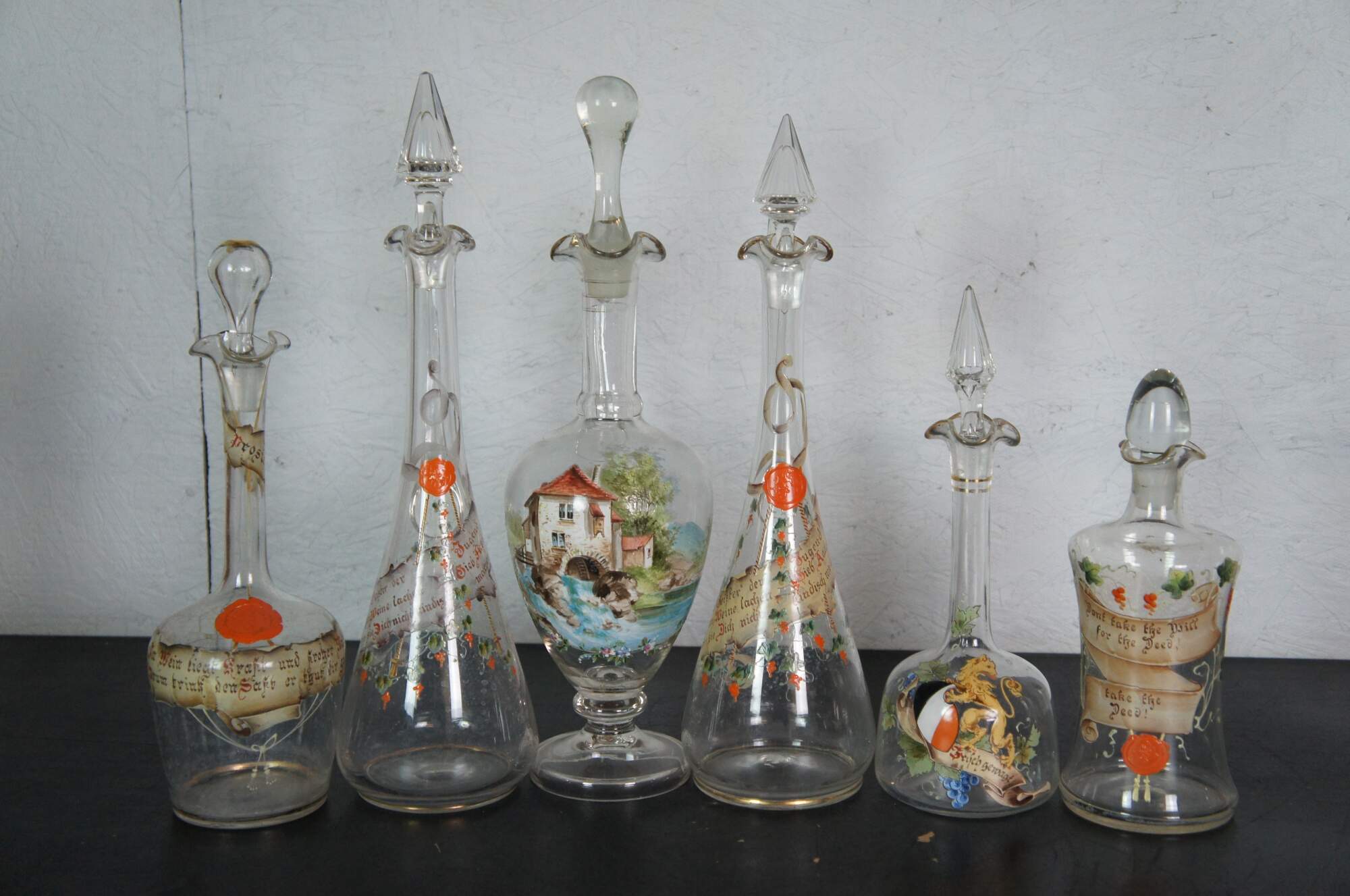 Immense and rare 83 piece lot of antique Bohemian / German glassware / bar glassware - clear hand blown glass with hand painted enamel mottos and beehive designs. Some with gilt details. Most also feature red / orange wax seal. Set includes: 2 Coasters, 6 Shot Glasses, 6 Schnapps / Cordial Glasses, 4 Mugs, 26 Tumblers / Beer Glasses, 20 Goblets, 1 Lidded Stein, 12 Decanters, 3 Pitchers, and 3 Tall Lidded Canisters / Celery Vases.