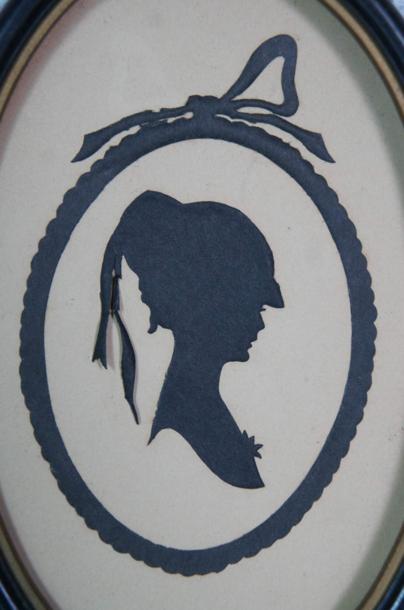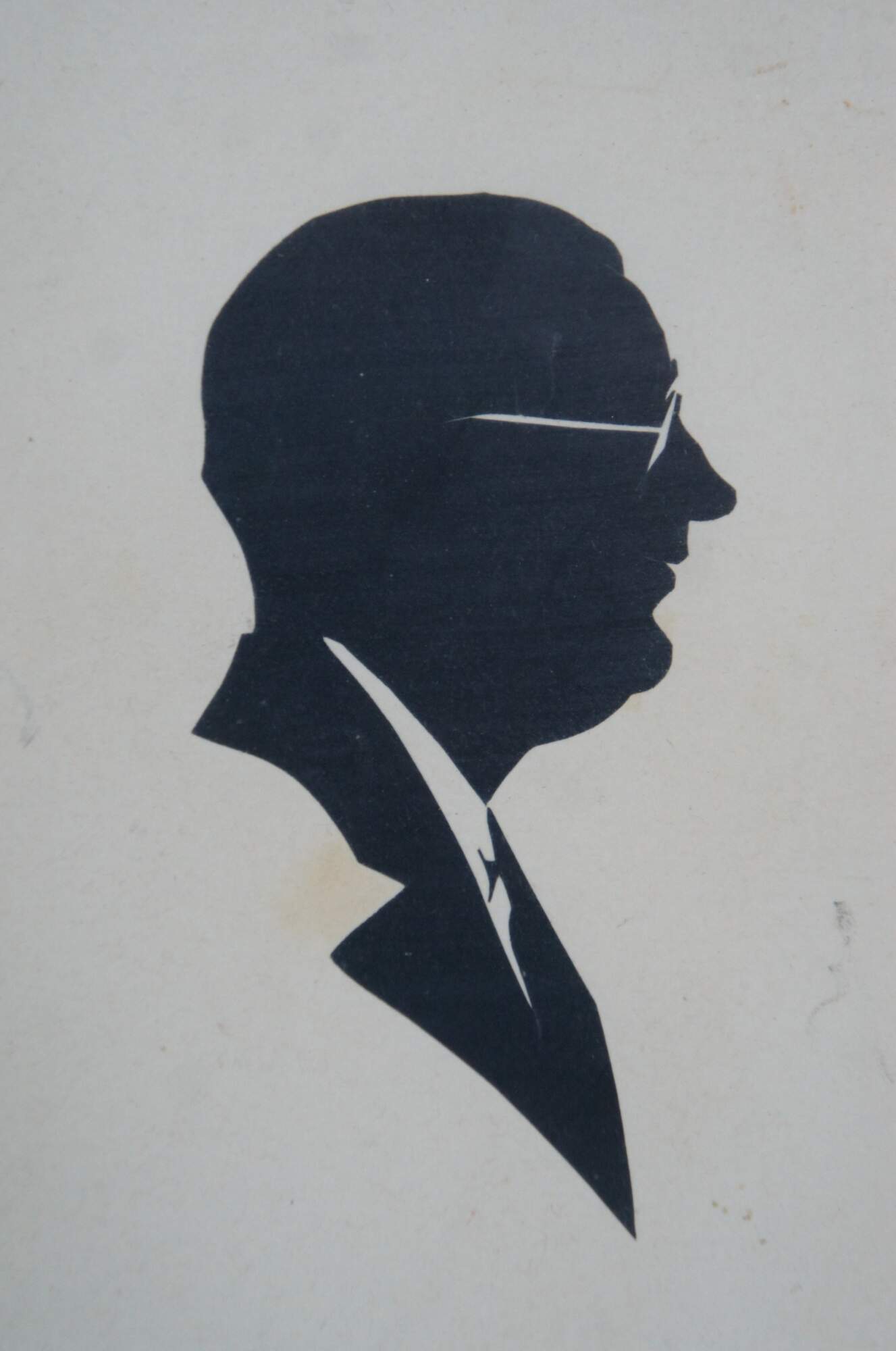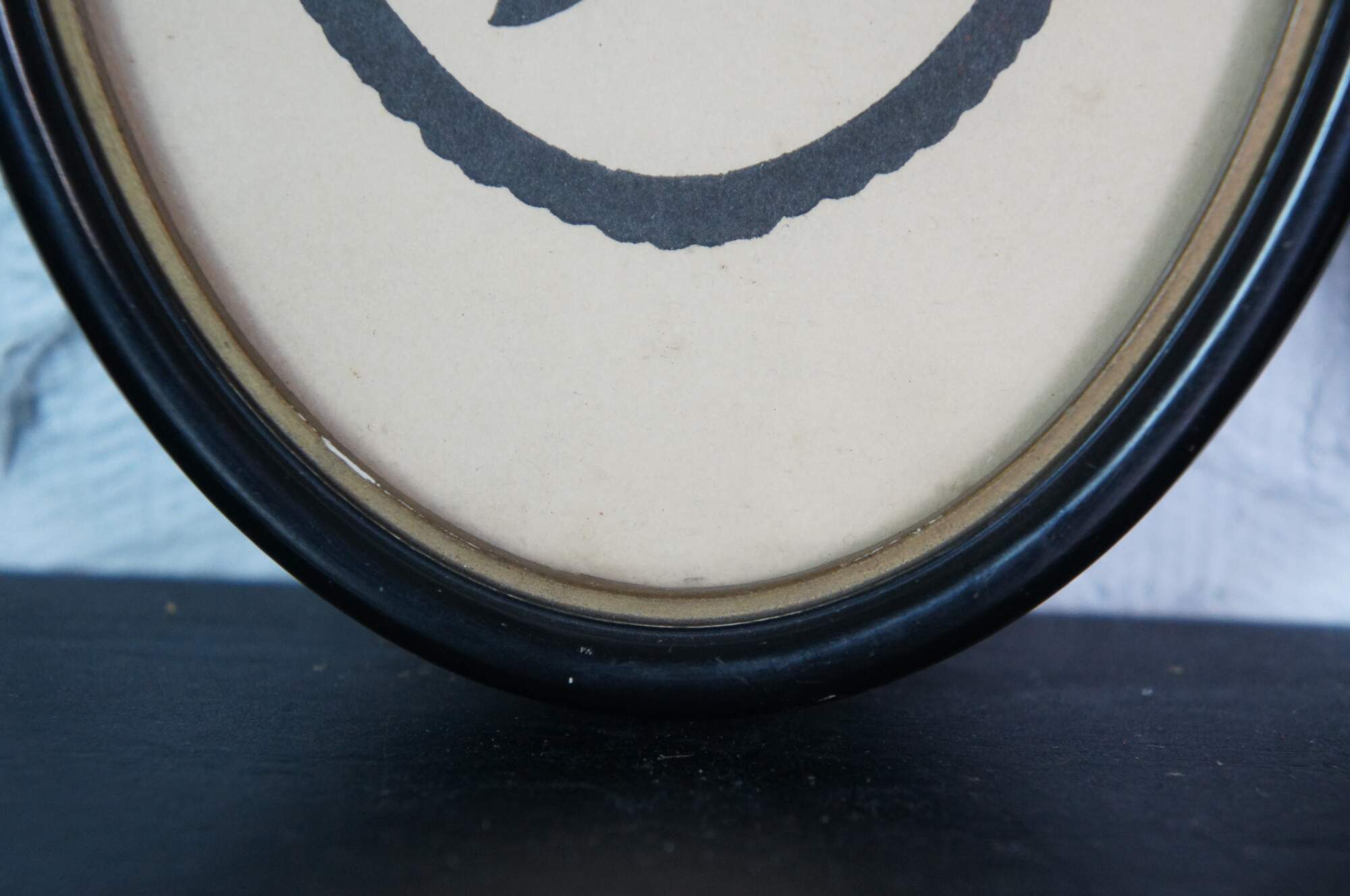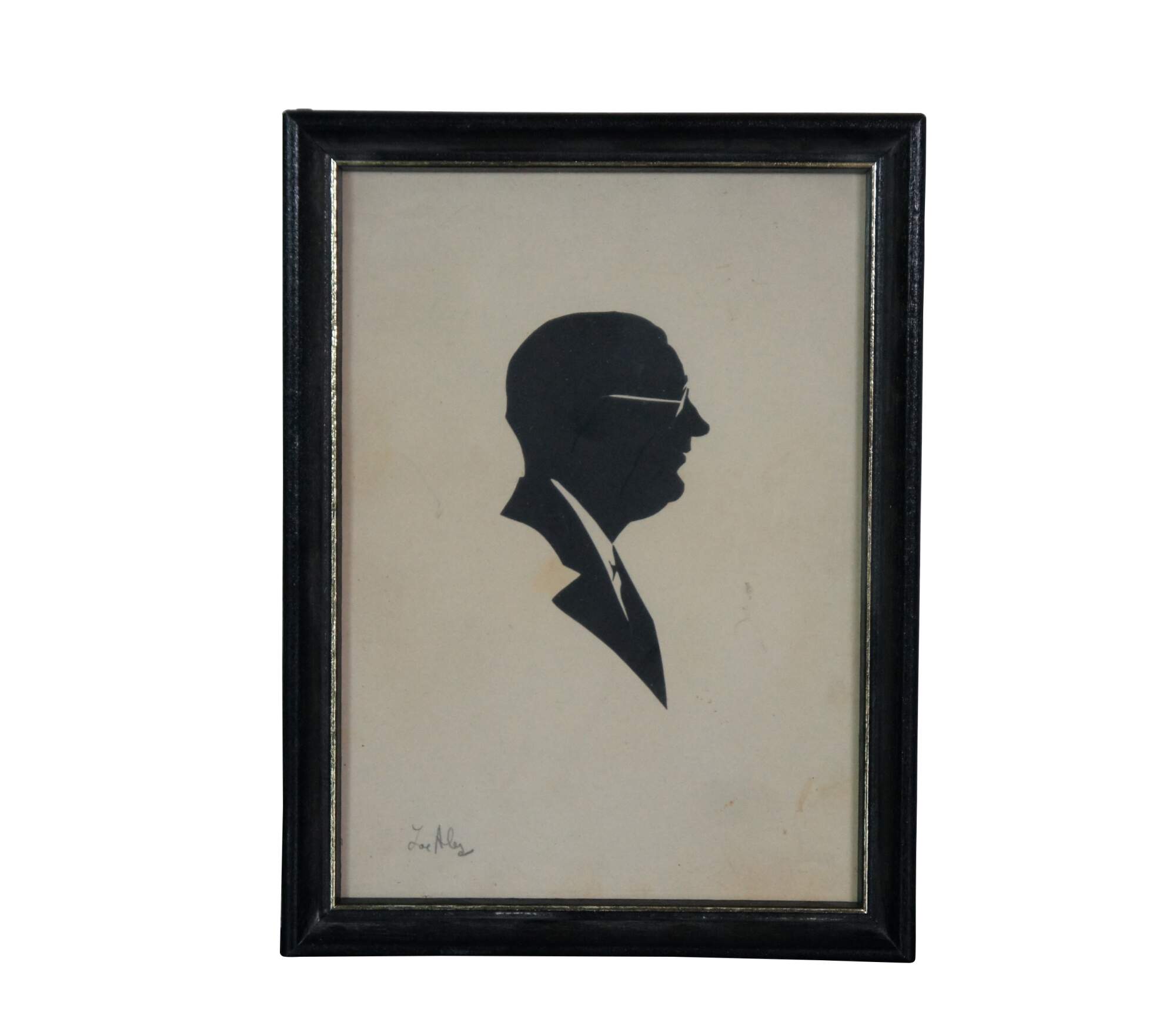 Set of three framed black cut paper silhouettes. Victorian / Edwardian pair in oval frames depicting a gentleman in top hat and a woman in a rounded hat, surrounded by wreaths. Rectangular framed gentleman in glasses and tie; pencil signed in lower left corner.