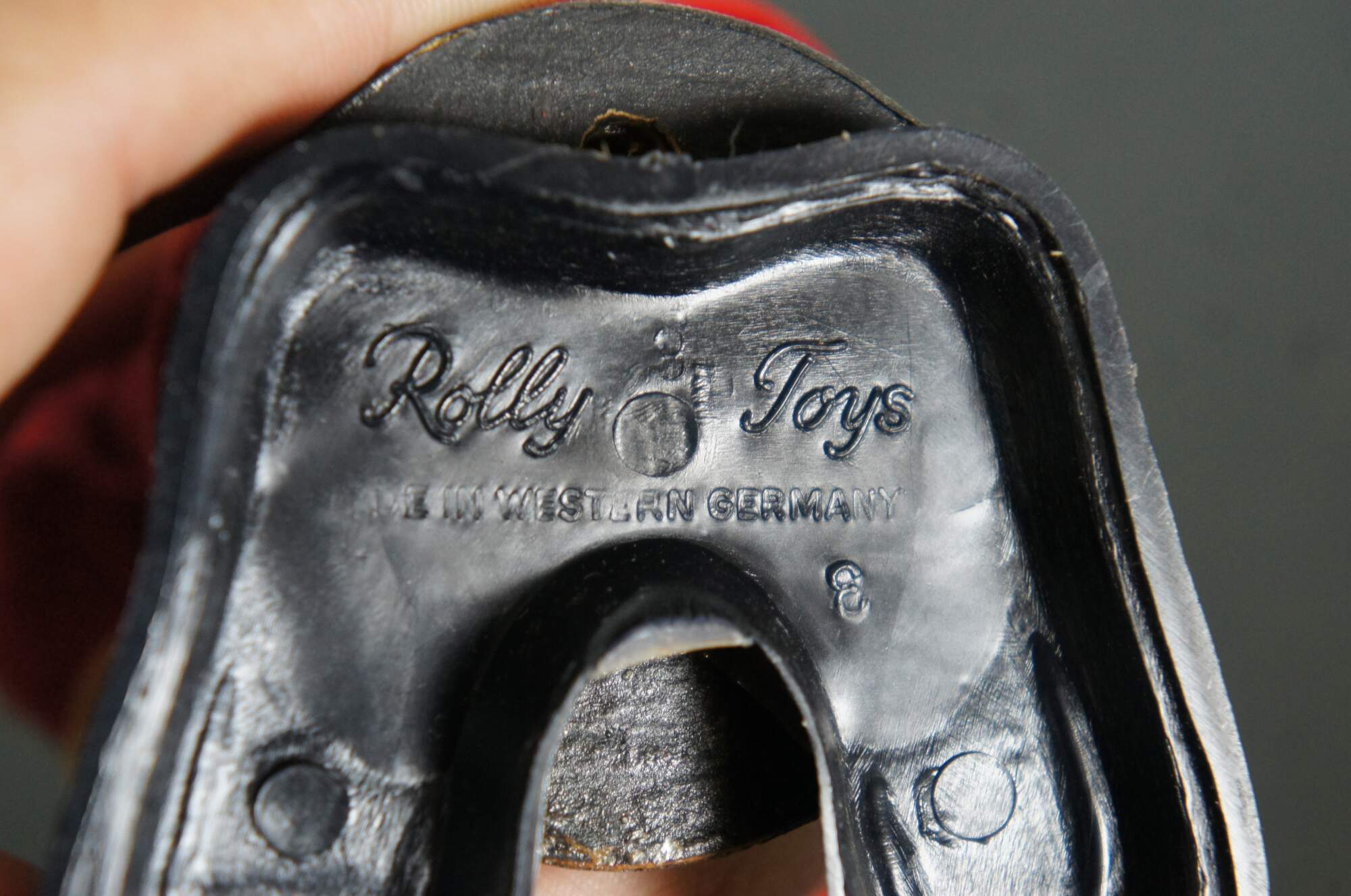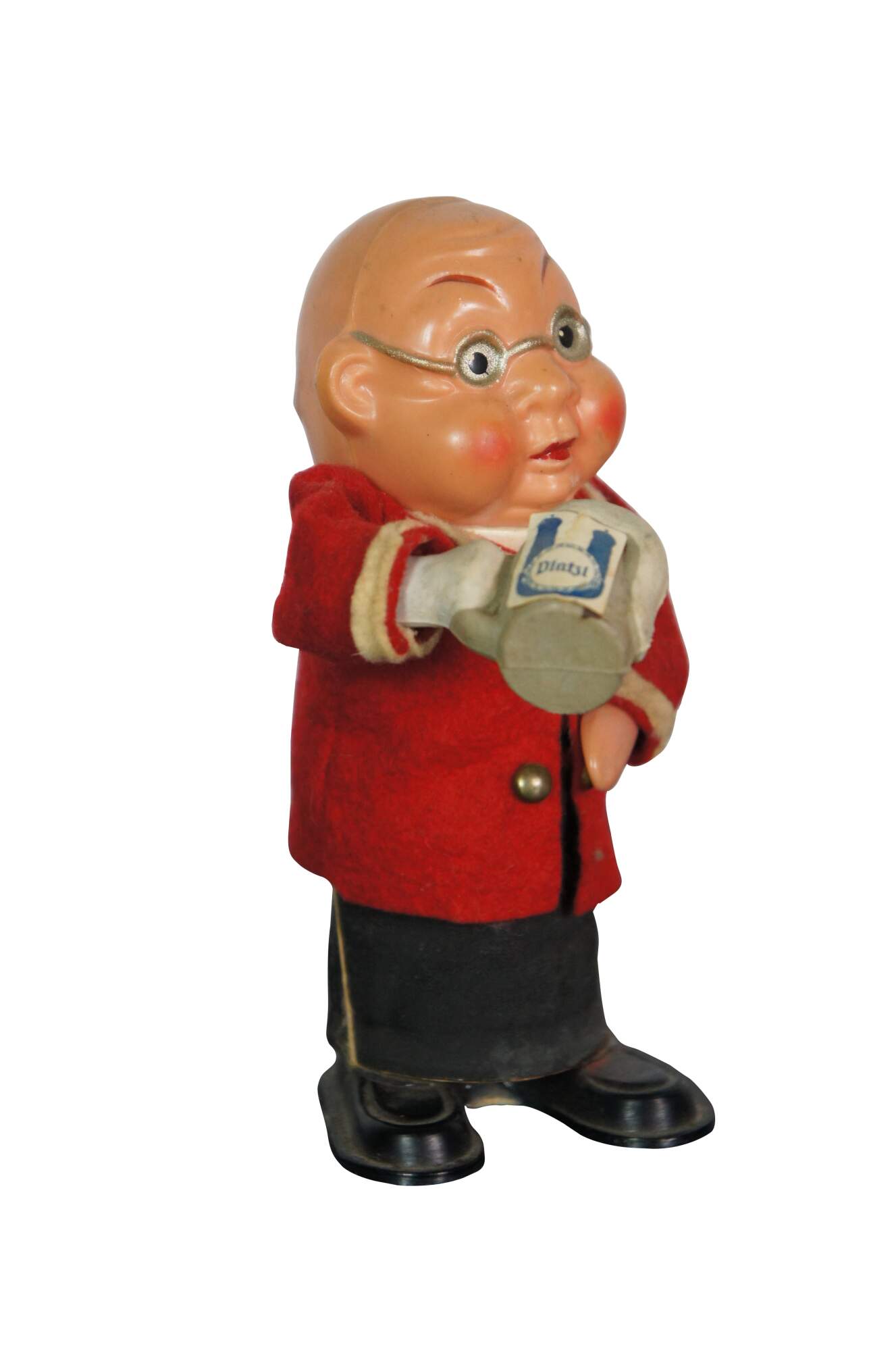 Mid 20th century bouncing drinking man toy with celluloid / plastic head, hands and feet and a felt outfit, holding in one hand a stein of Platzl beer. Made in Western Germany by Rolly Toys.