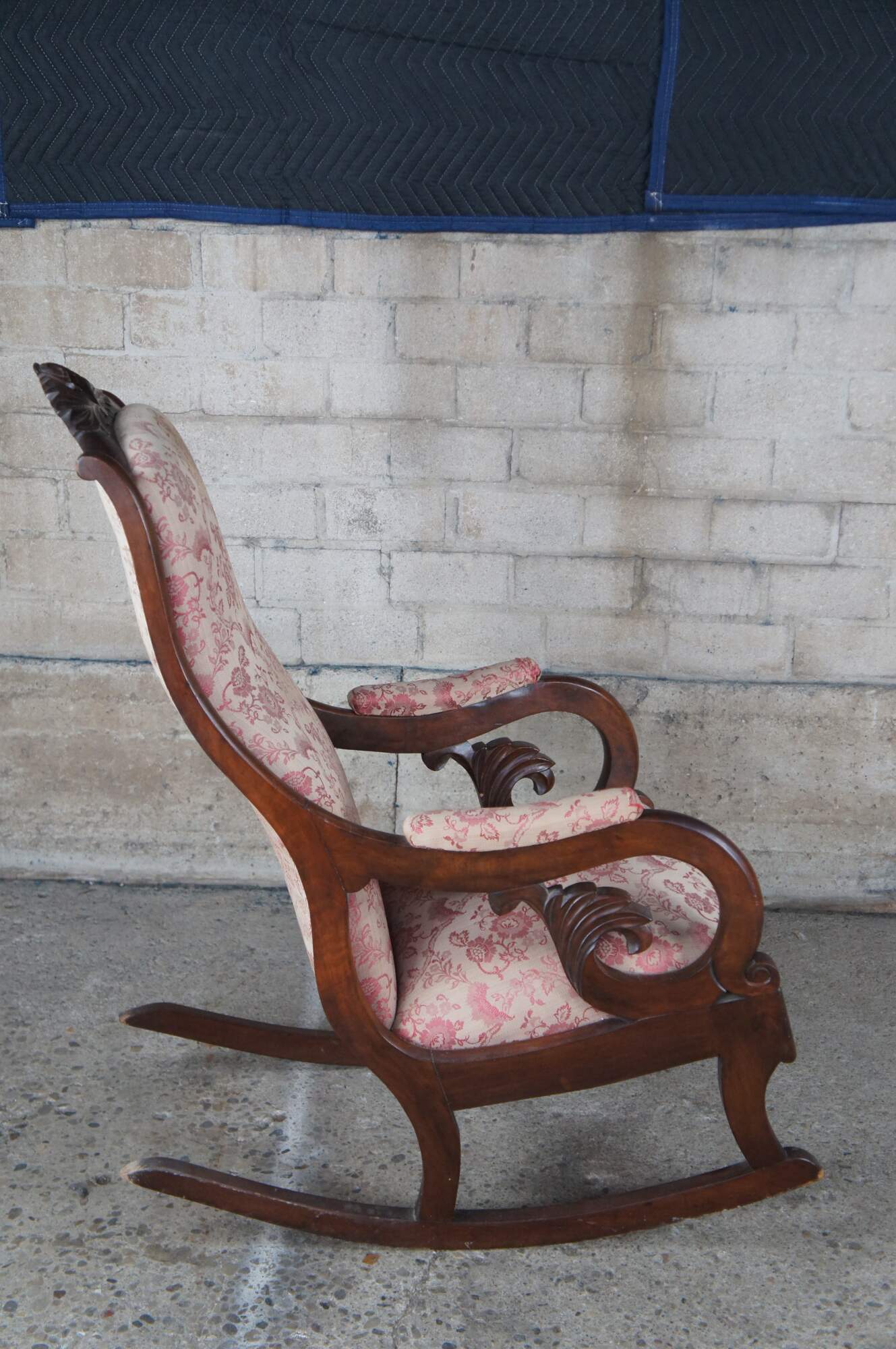 An exceptional American Late Classical Regency and Empire inspired rocking chair, circa 1850s. Attributed to Thomas Day. Made from mahogany with a high rose carved contoured back leading to downswept padded and scrolled arms. The chair features a burled front rail and pink rose vine upholstery.
