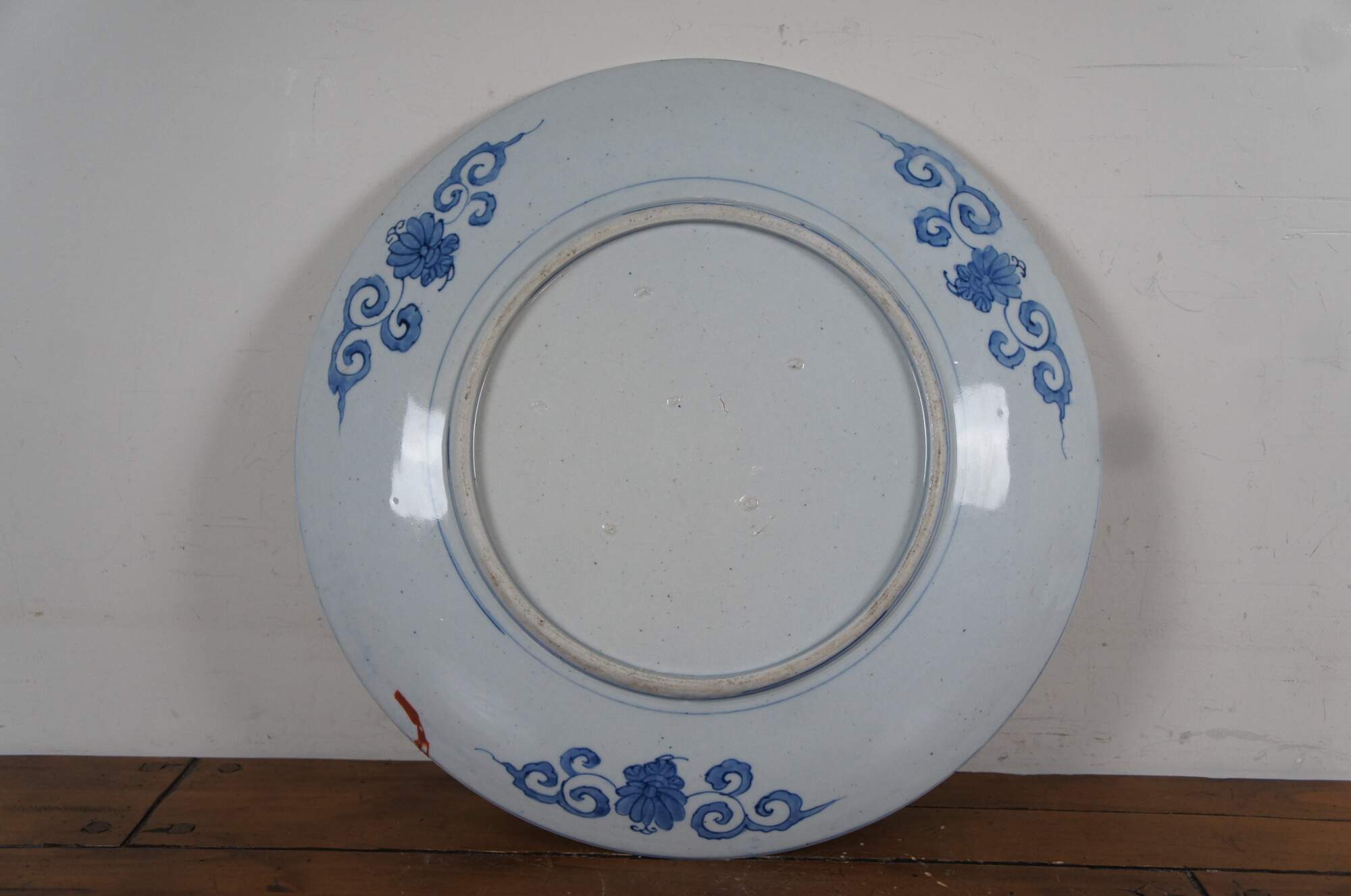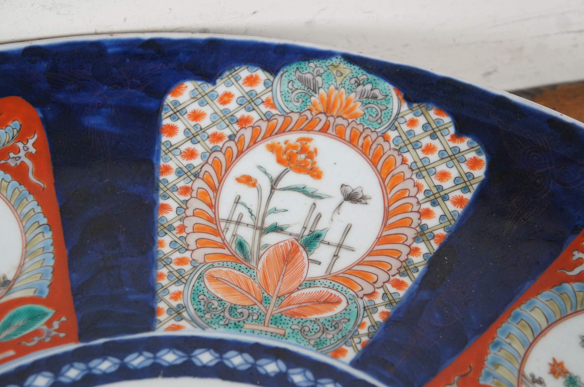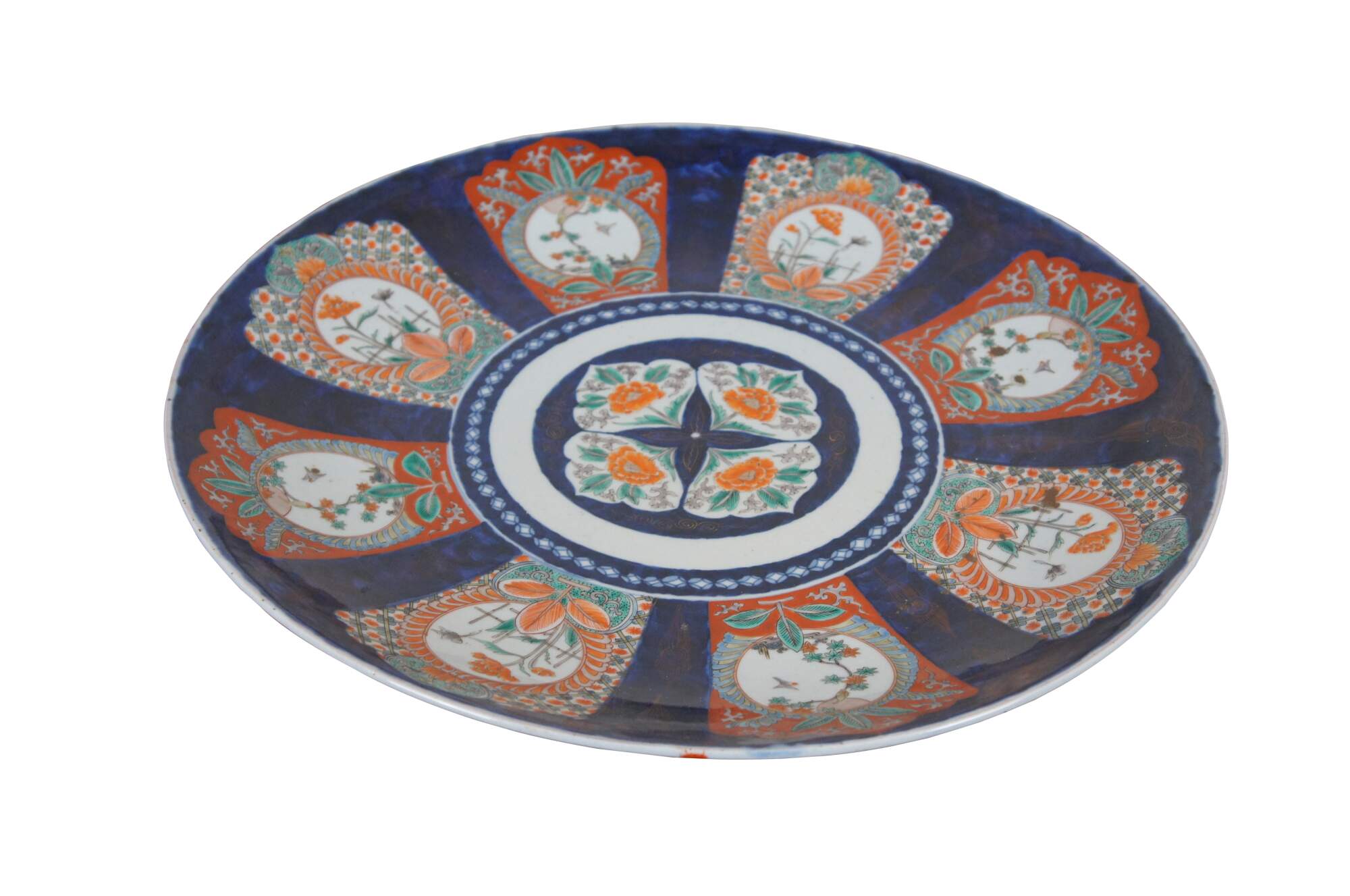 A very large and impressive Japanese Meiji period Imari porcelain plate / charger / platter hand painted with polychrome floral scenes / borders in orange / red, cobalt blue, green and gold.