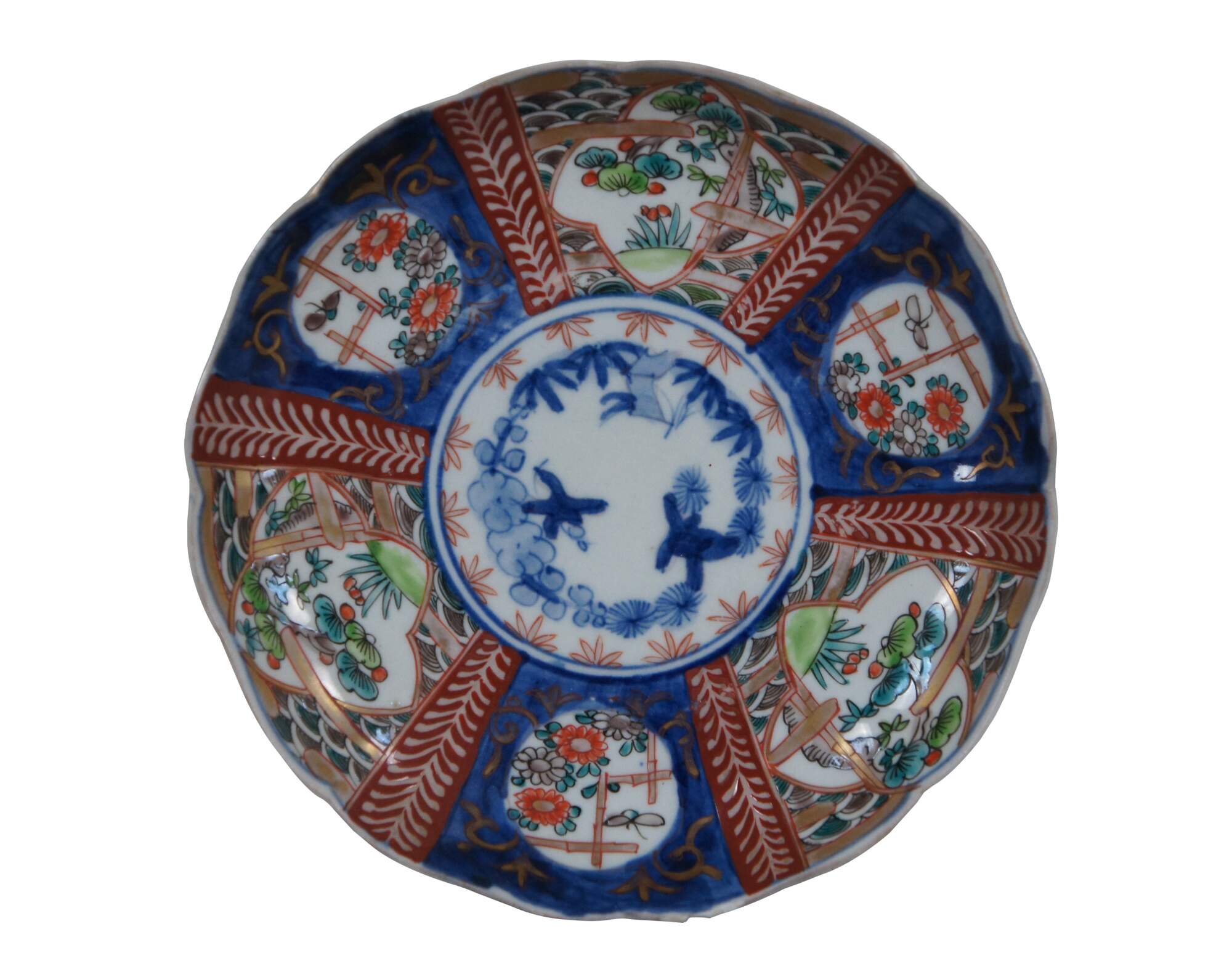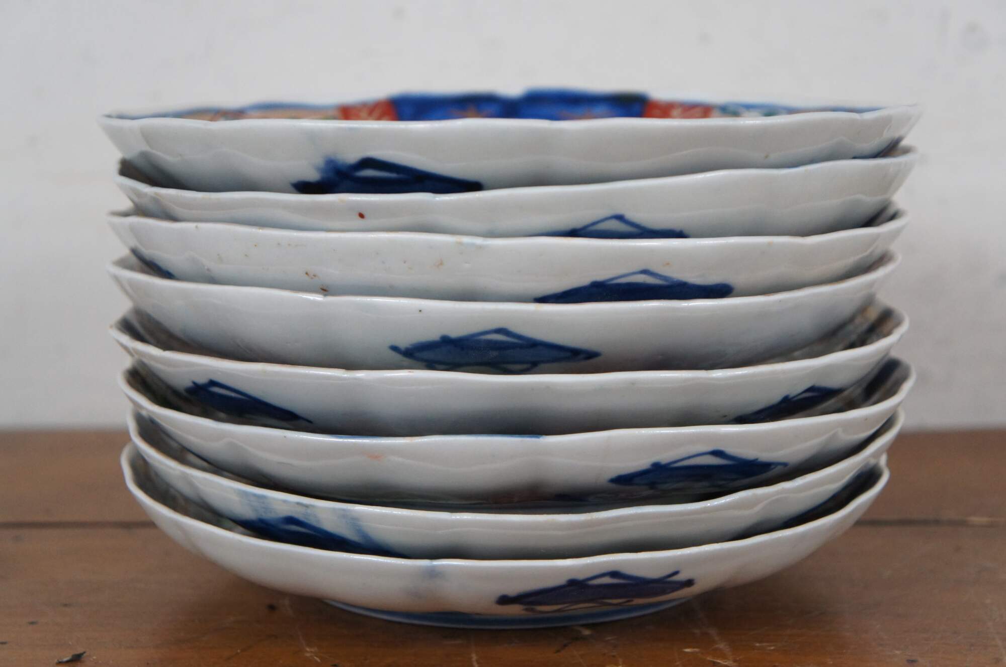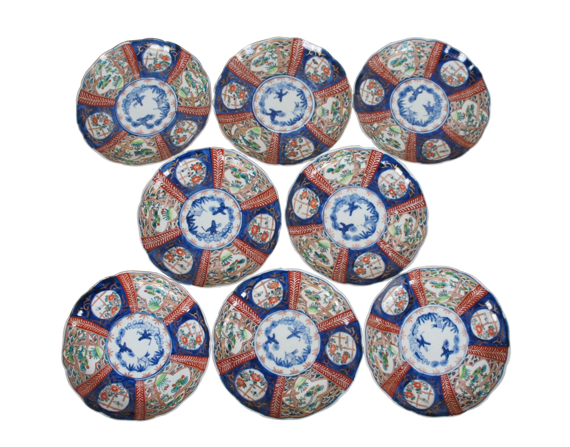 Set of 8 early 20th century Japanese imari porcelain salad / dinner plates with scalloped edges, hand painted with fan-like panels of landscapes and flowers, surrounded with designs in blue and red.
