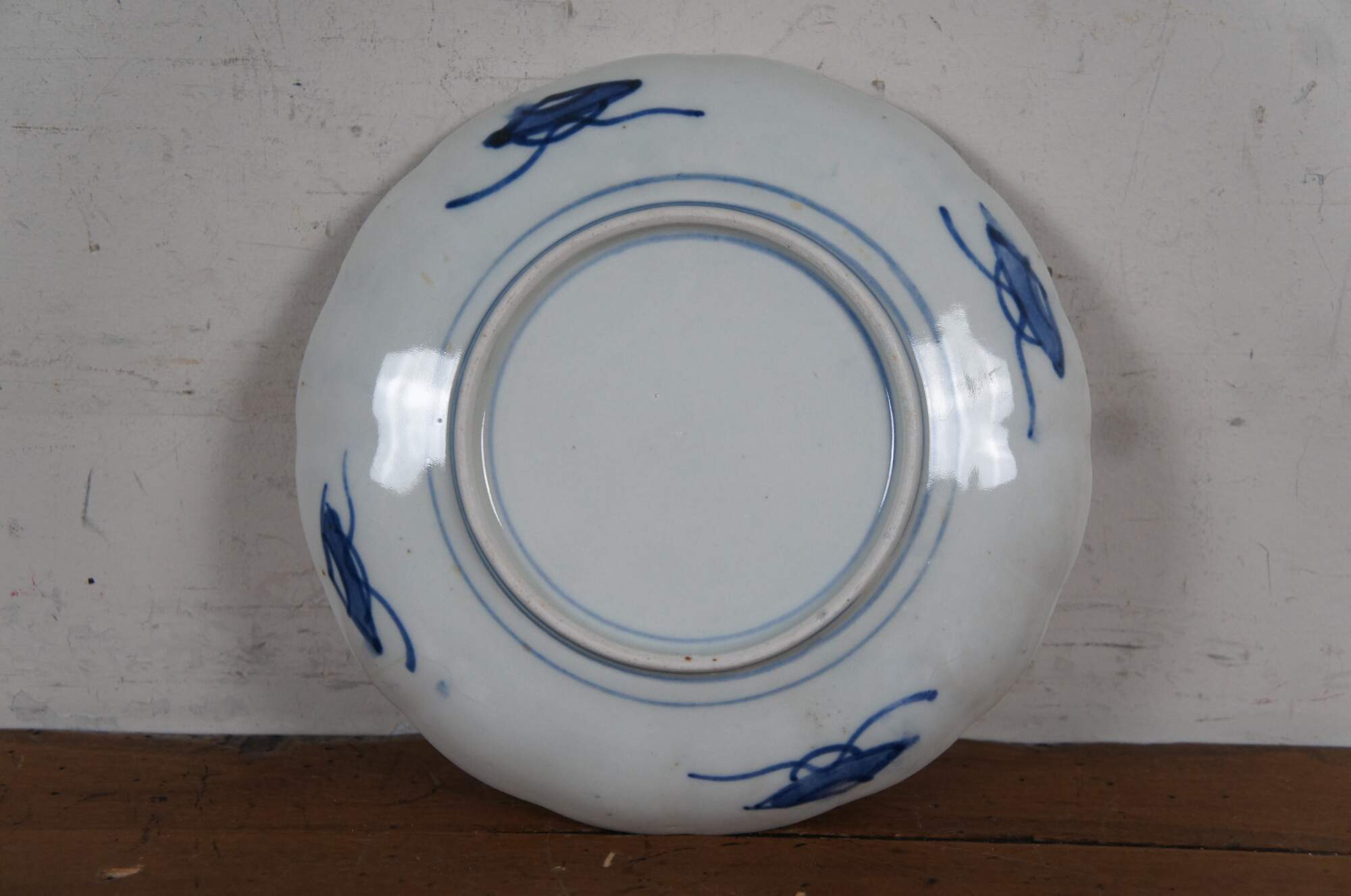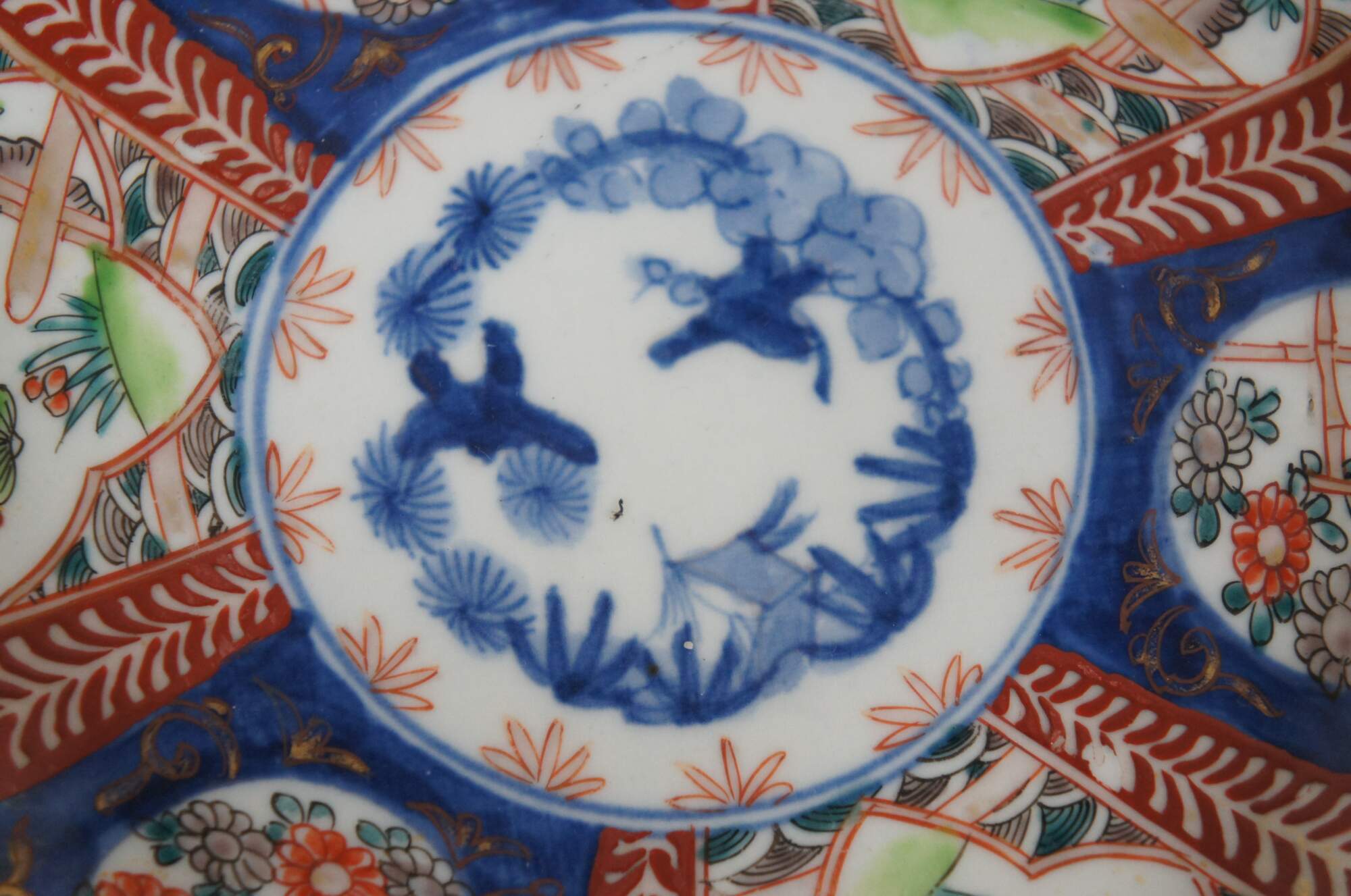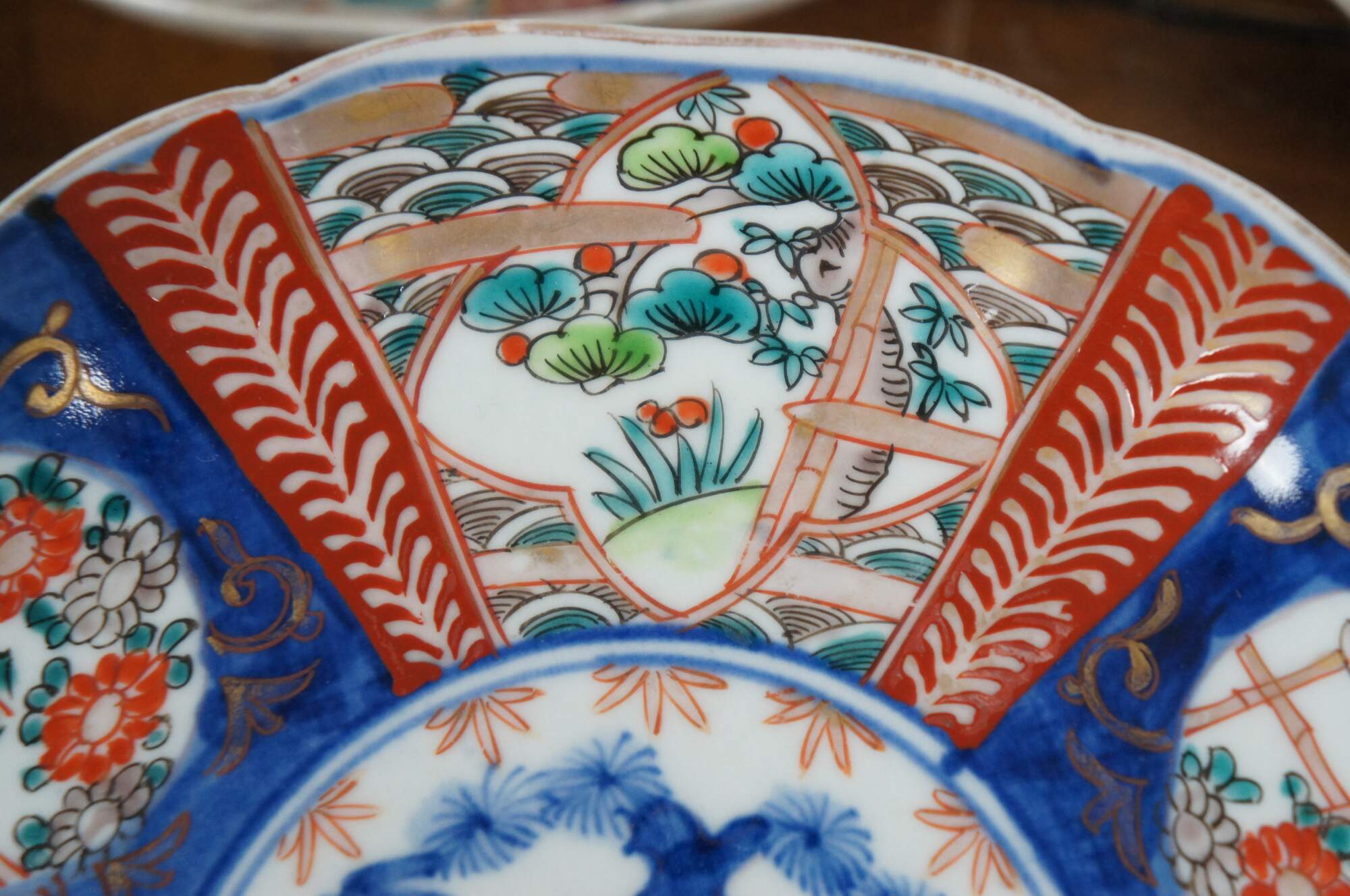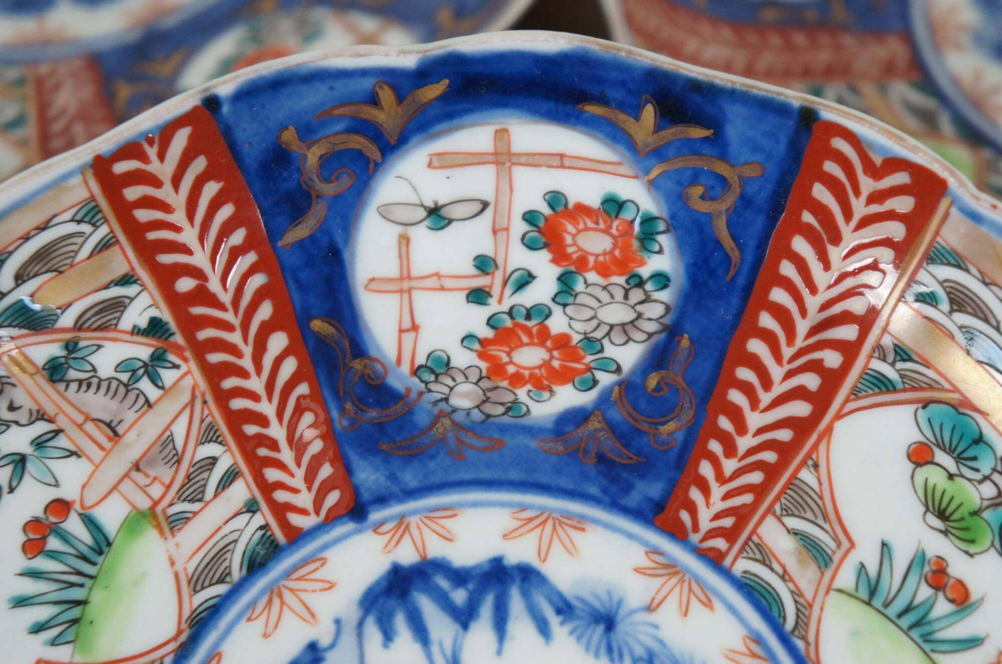 Set of 8 early 20th century Japanese imari porcelain salad / dinner plates with scalloped edges, hand painted with fan-like panels of landscapes and flowers, surrounded with designs in blue and red.
