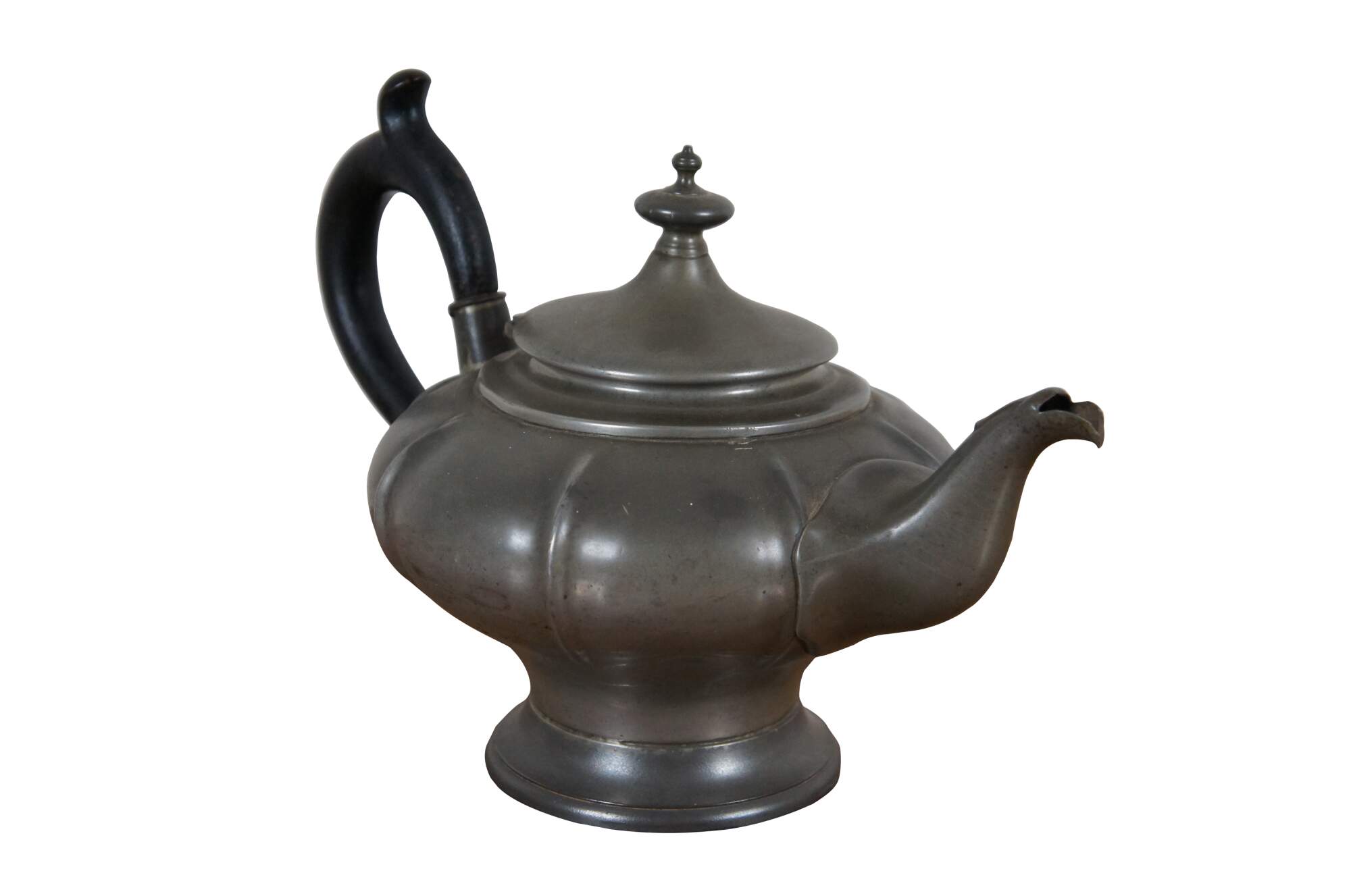 Mid 19th century English pewter teapot by Shaw and Fisher (mark used until 1872). Onion shaped body with footed base and top shaped finial. Dark wood handle.