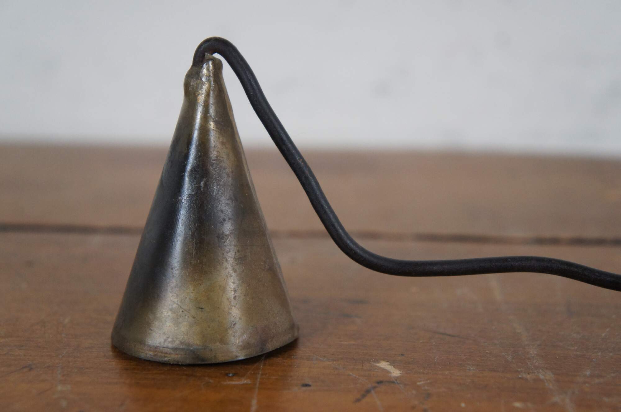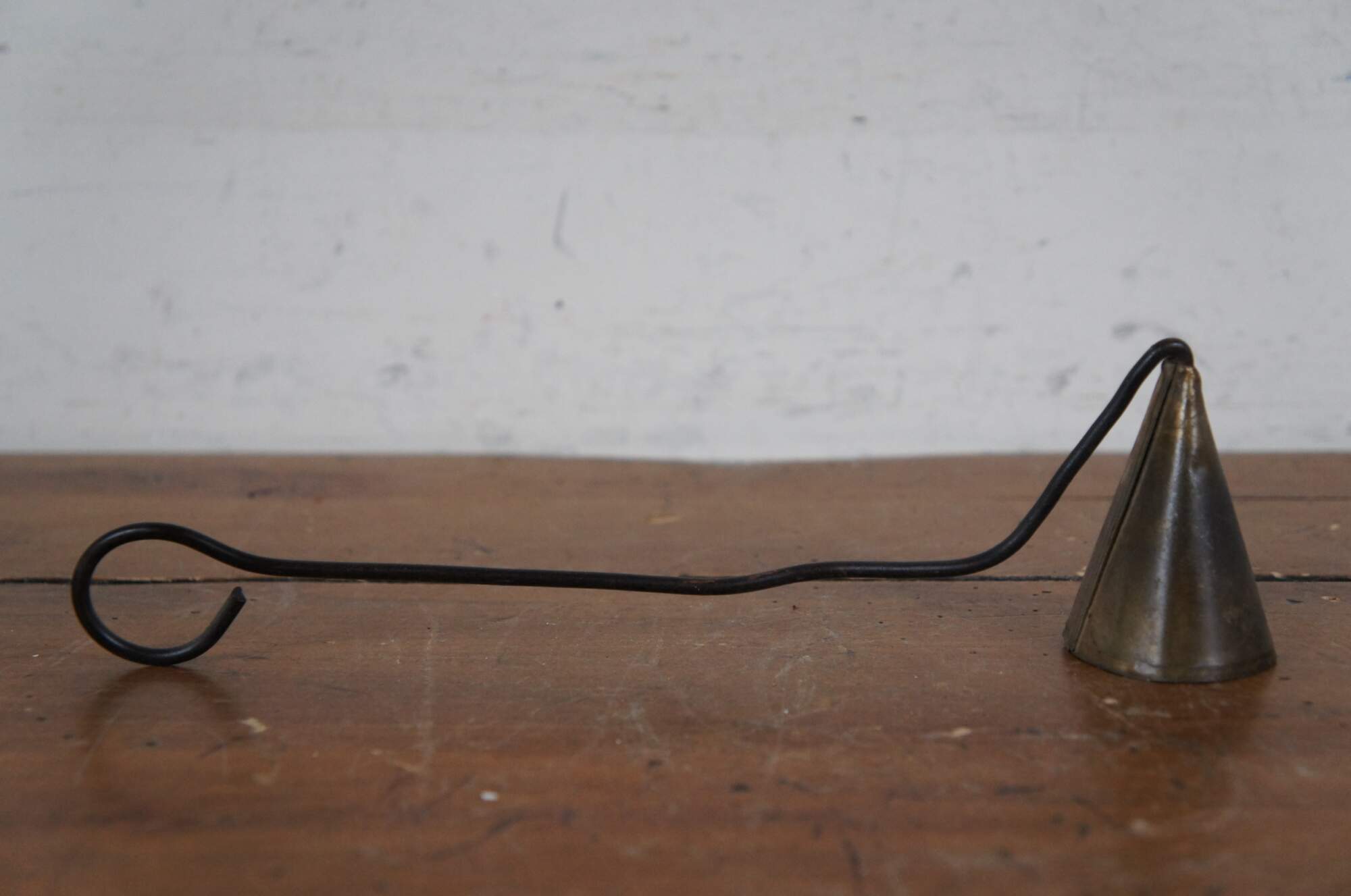 Antique 20th century Early American style tin candle snuffer featuring a triangular bell and slim wrought iron handle.