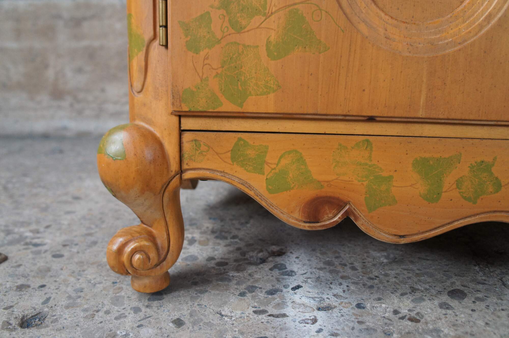 Vintage French Provincial pine console cabinet / cupboard / entry table / drybar featuring rectangular form with paneled doors, painted ivy / vine design, serpentine apron and chunky cabriole legs.