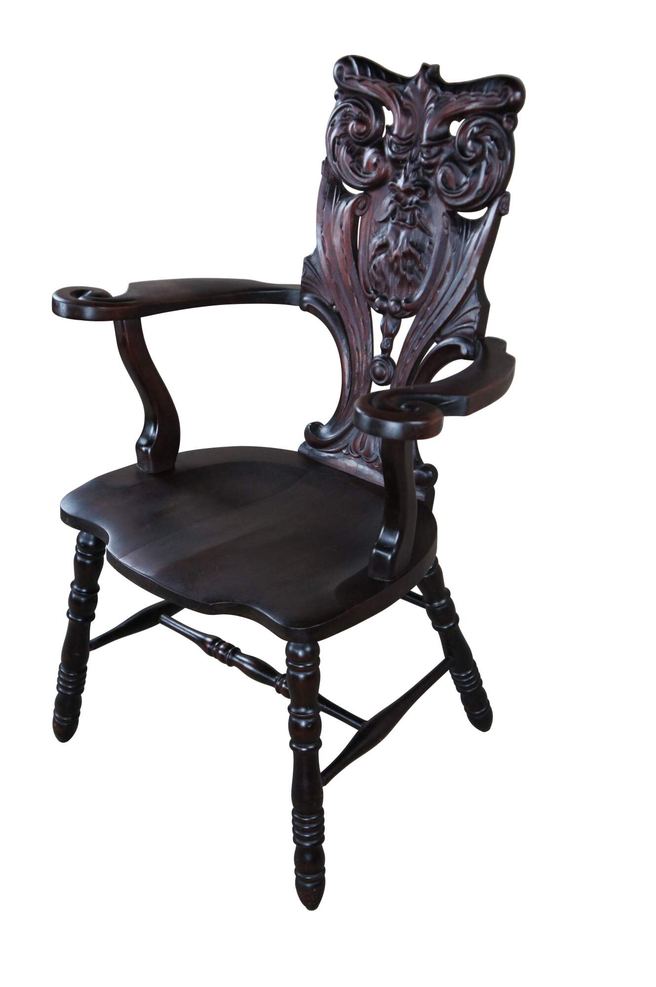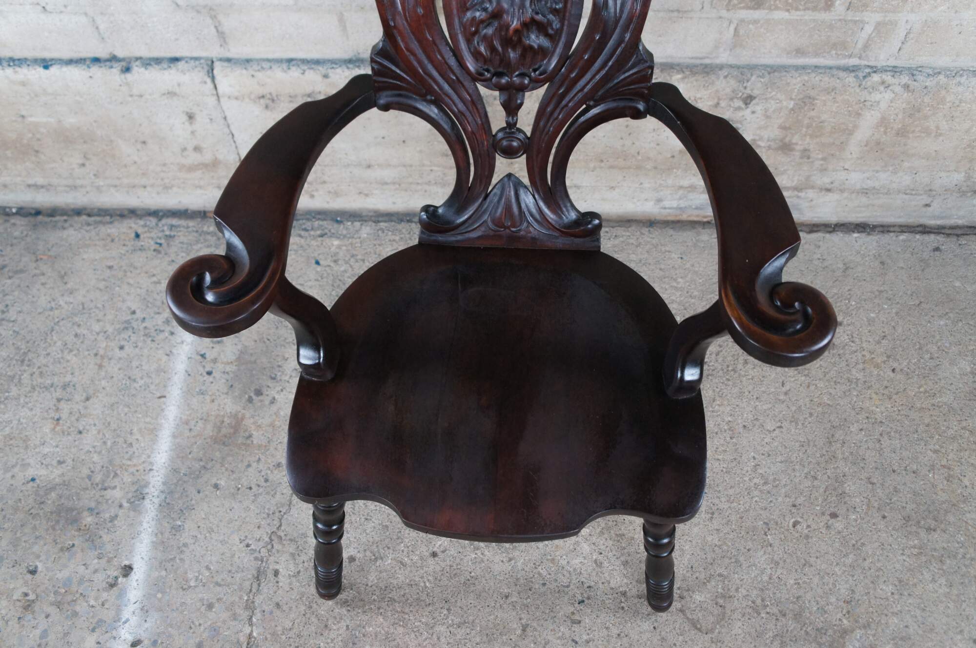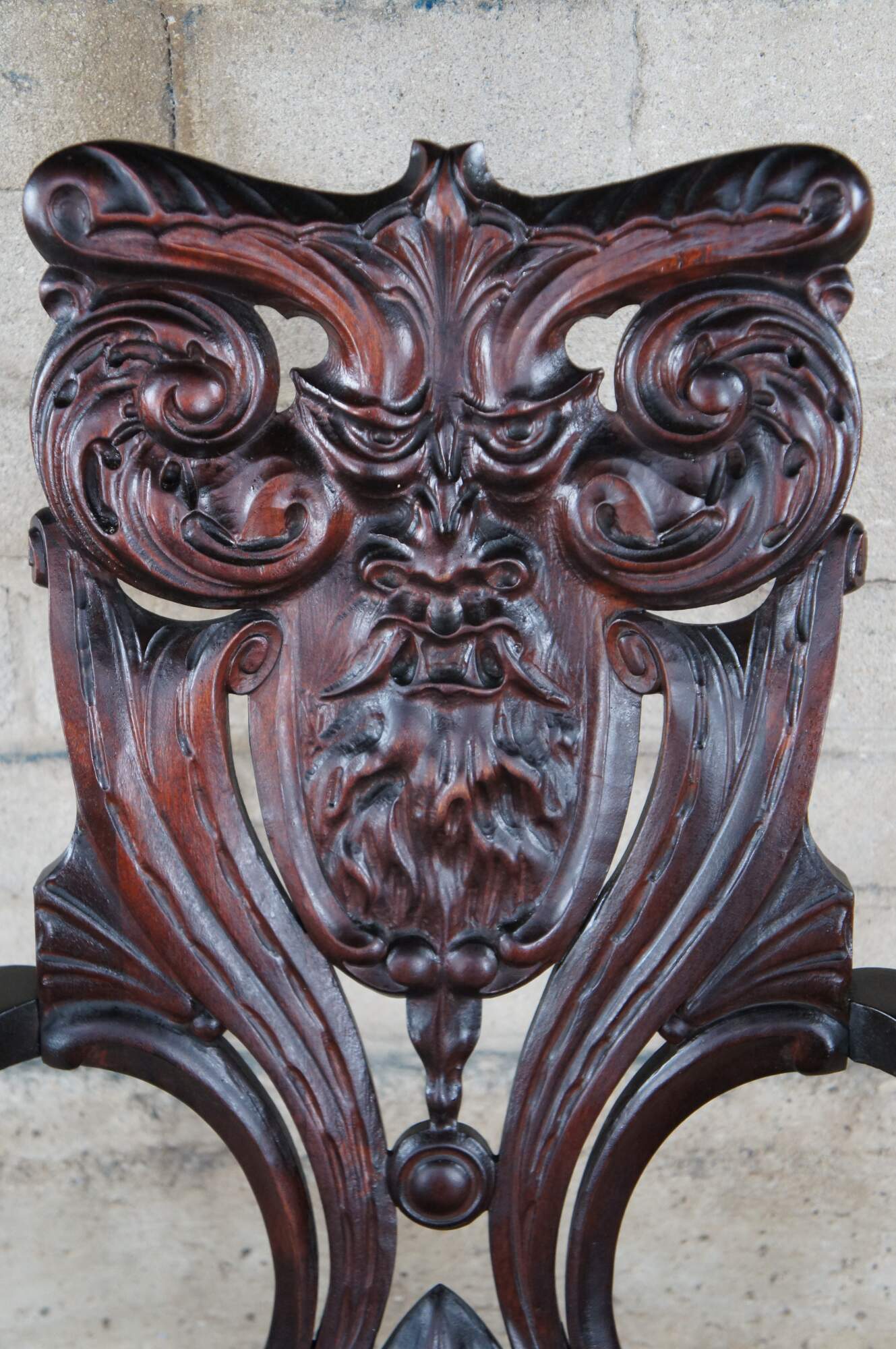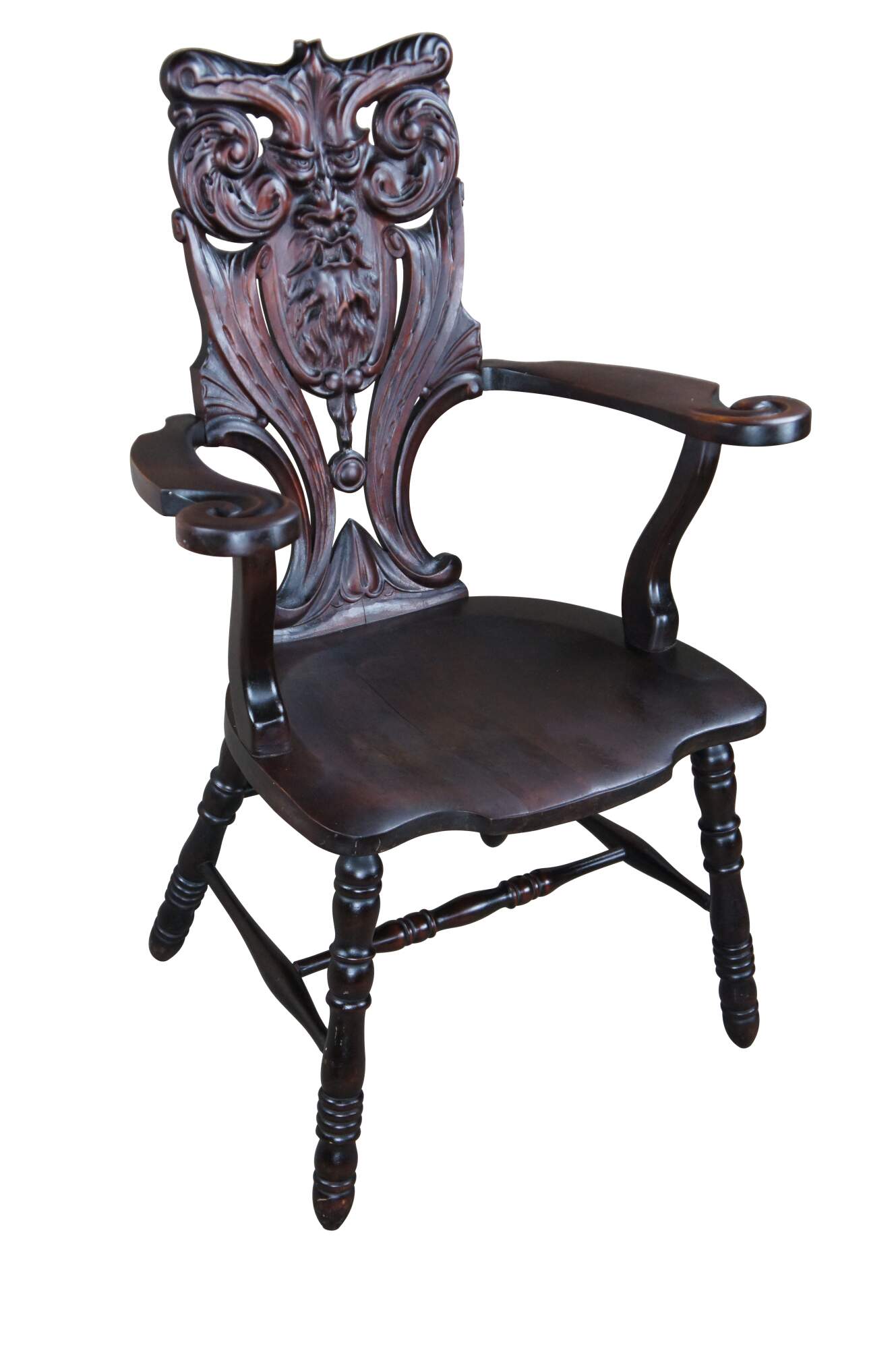 Antique Victorian Northwind Face / Gargoyle arm chair. Made of mahogany featuring ornate Gothic styling with carved reticulated back, high flared serpentine arms, contoured seat, and turned legs connected with H stretcher.