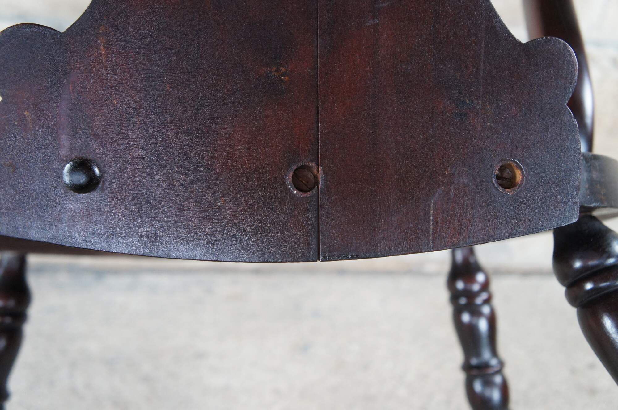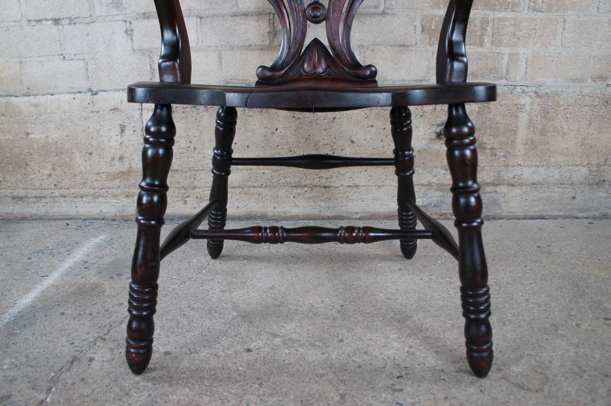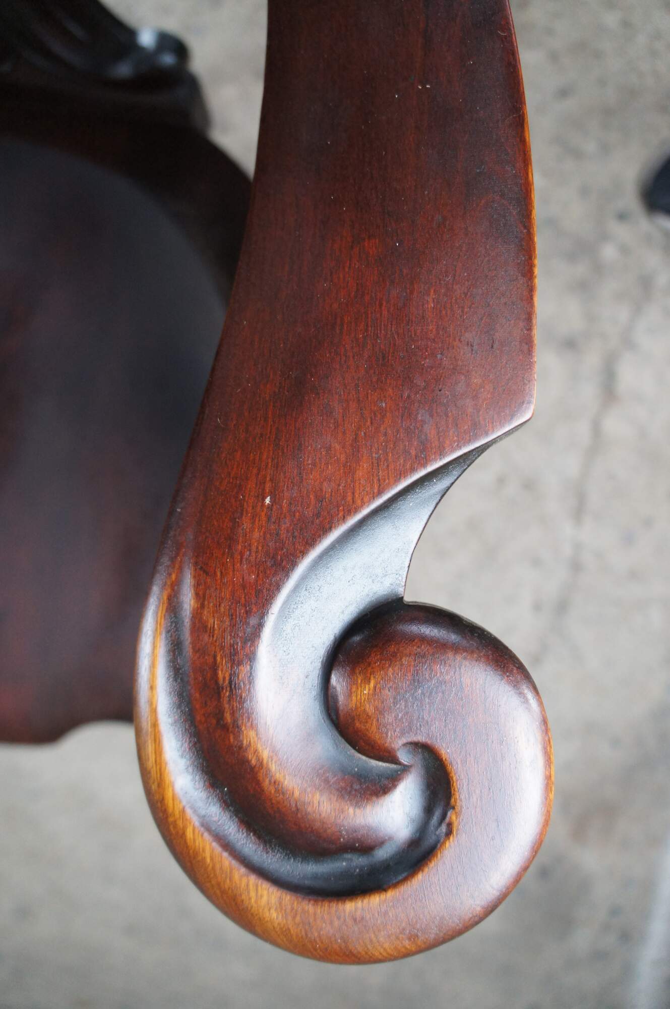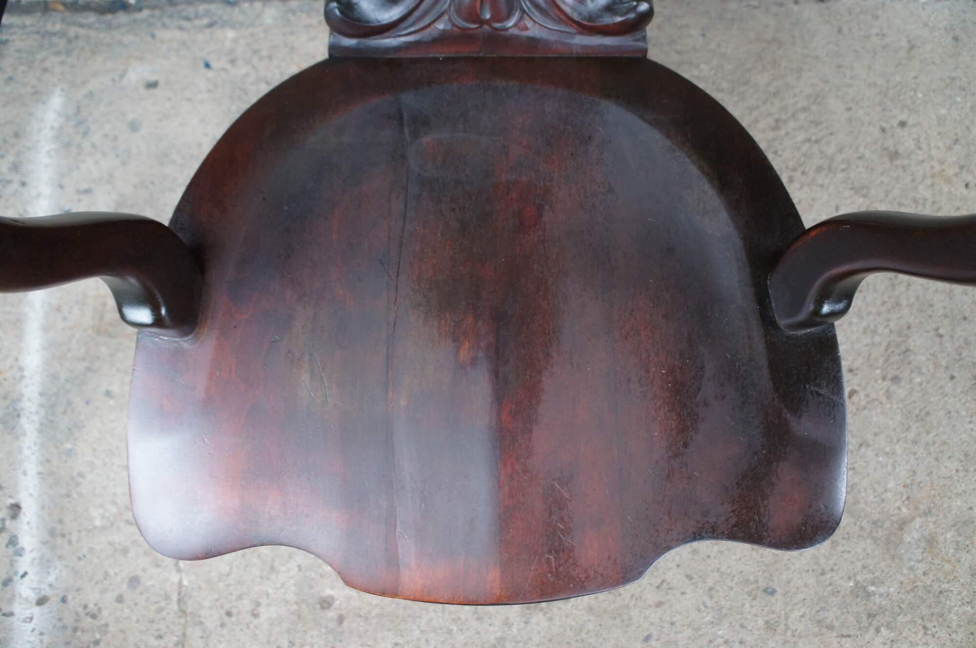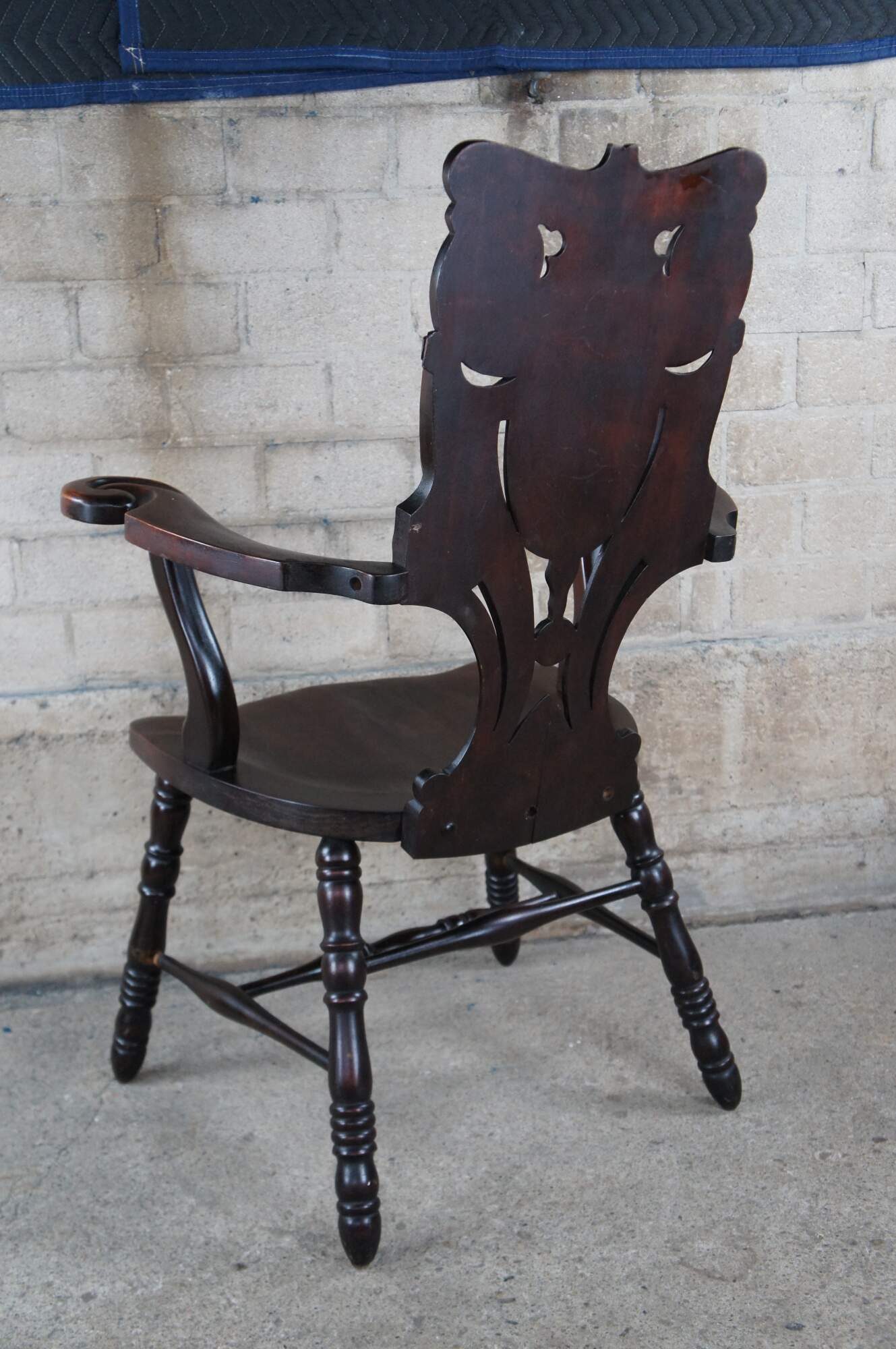 Antique Victorian Northwind Face / Gargoyle arm chair. Made of mahogany featuring ornate Gothic styling with carved reticulated back, high flared serpentine arms, contoured seat, and turned legs connected with H stretcher.