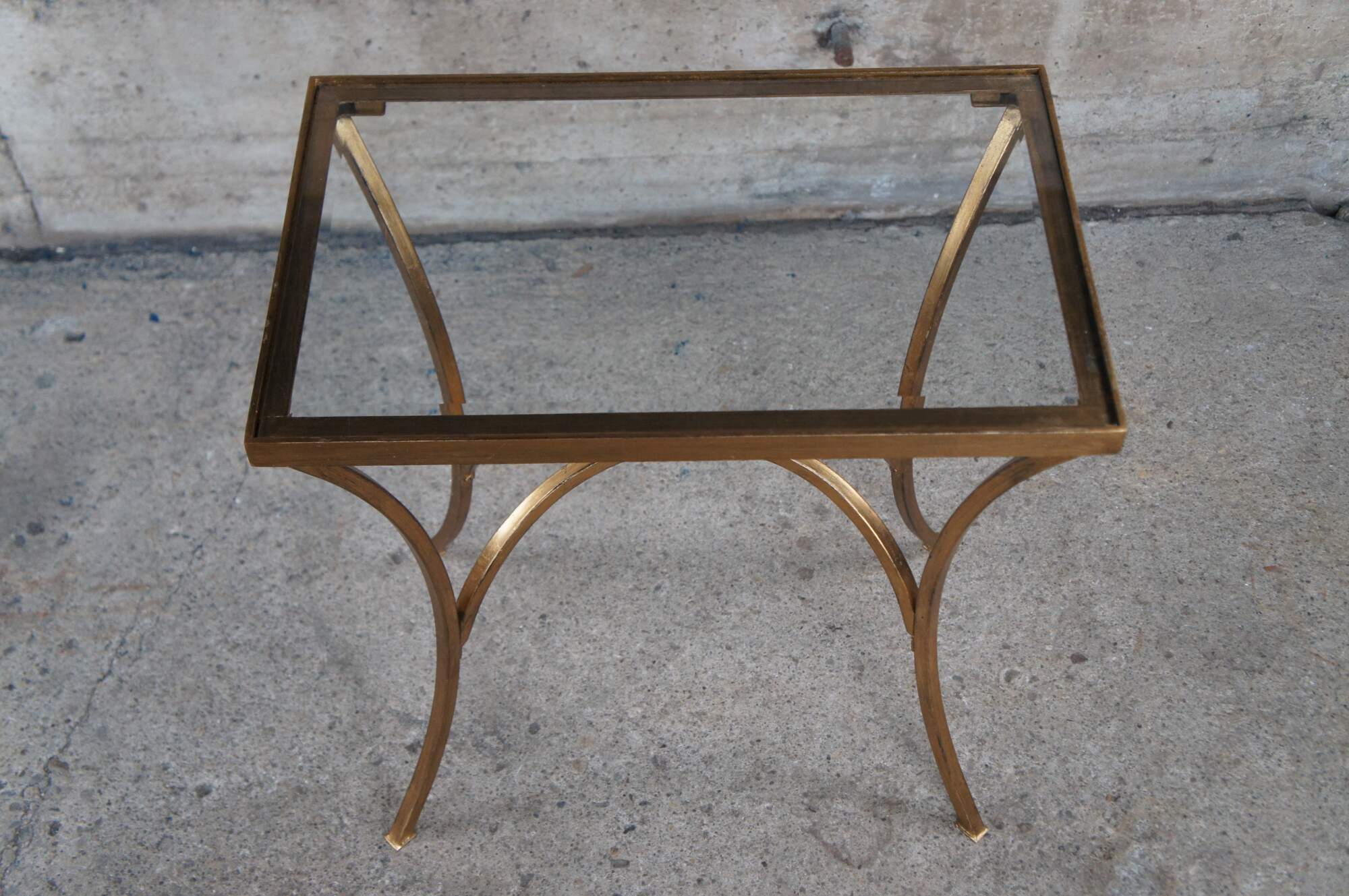 Two vintage Uttermost Alayna modern side accent tea tables designed by Matthew Williams. Gracefully arched hand forged iron finished in heavily antiqued gold leaf. Top is clear beveled tempered glass.
