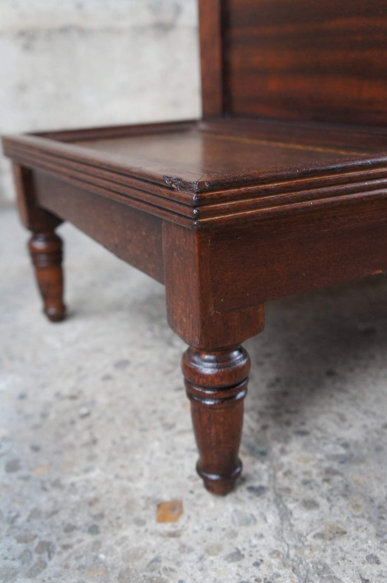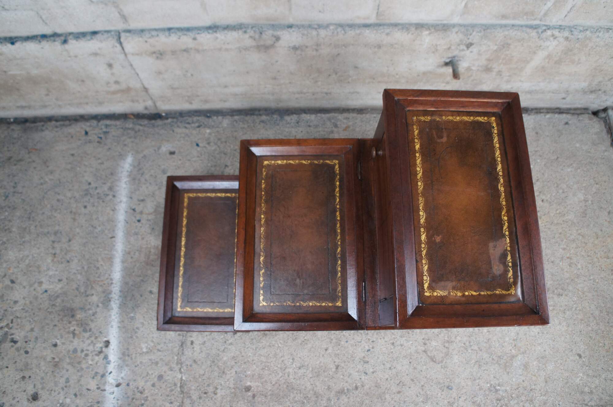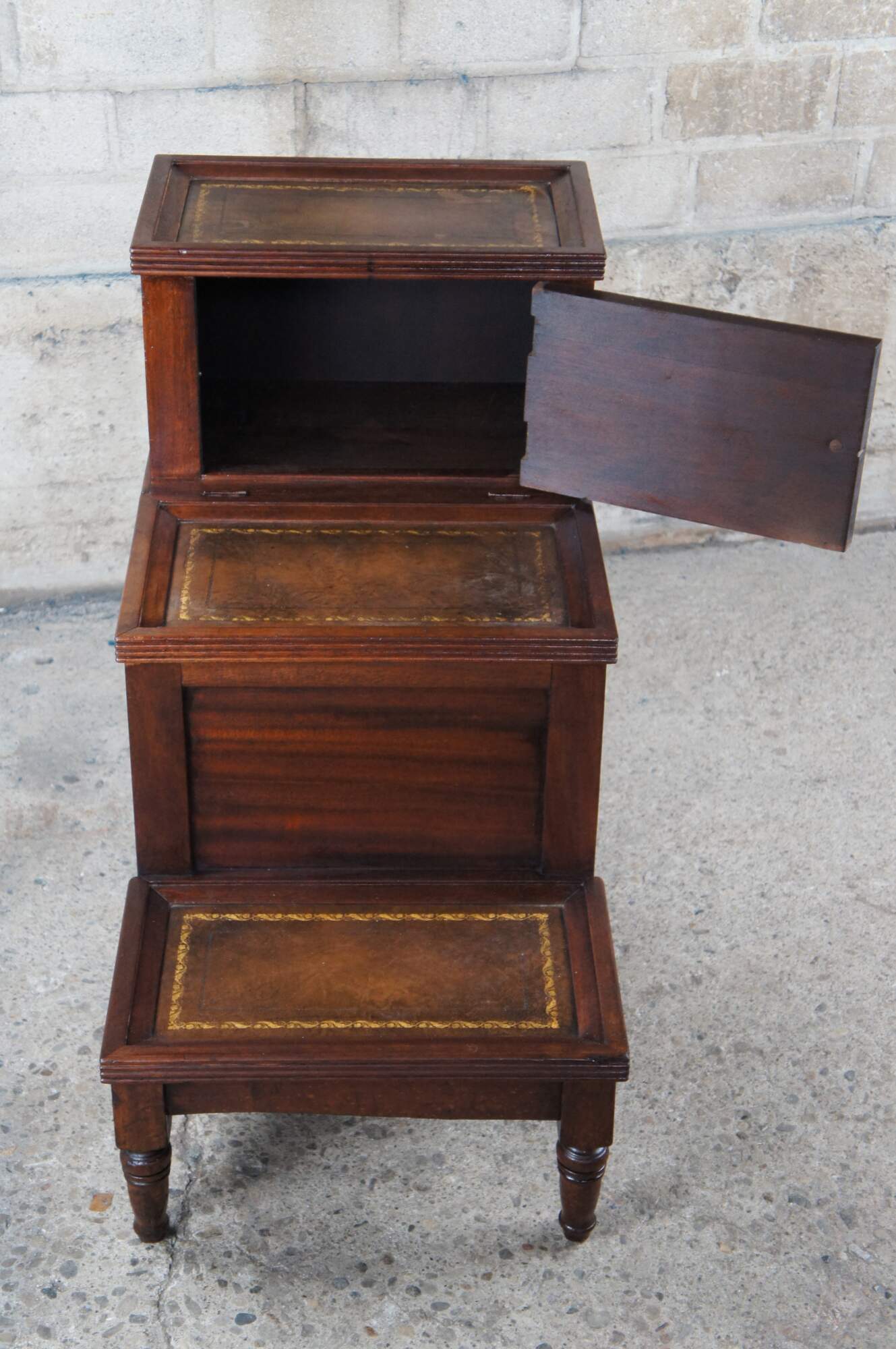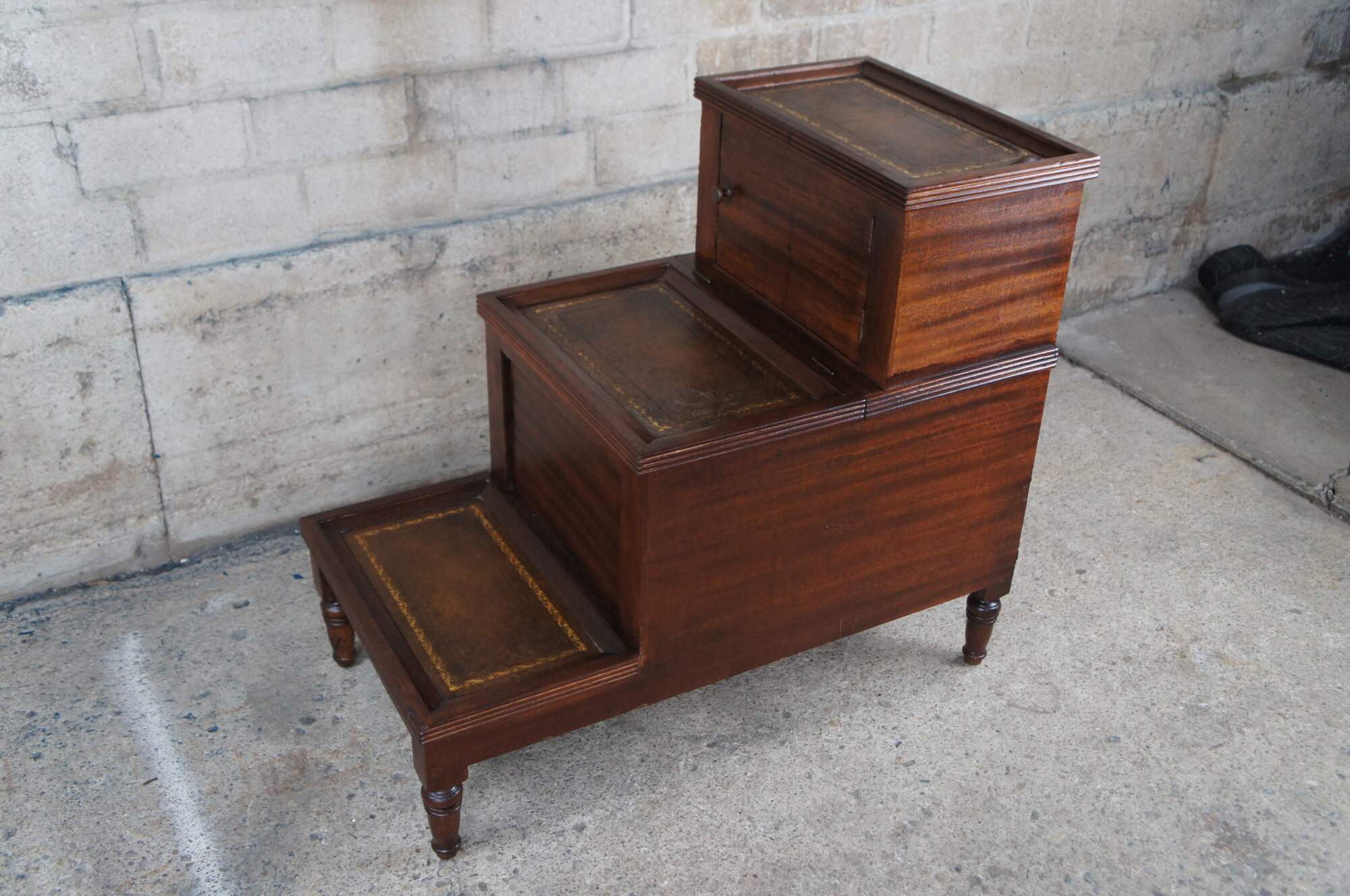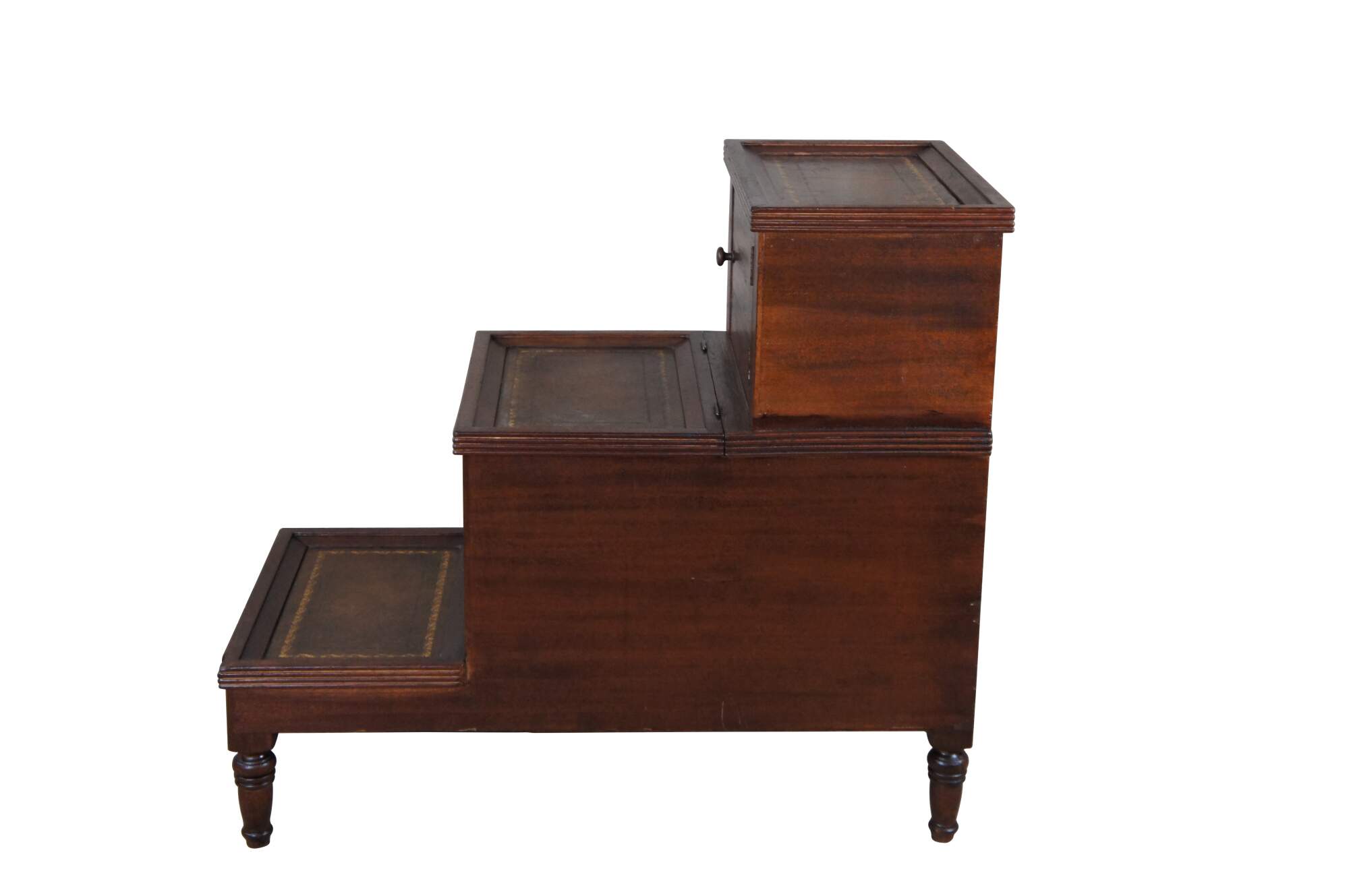 Antique English Regency / George III / Sheraton style library or bed steps / staircase / stepstool / side table or nightstand. Made of mahogany featuring a three tiered design with fluted gallery, tooled leather tops, one cabinet, one trunk storage compartment and turned ribbed legs.