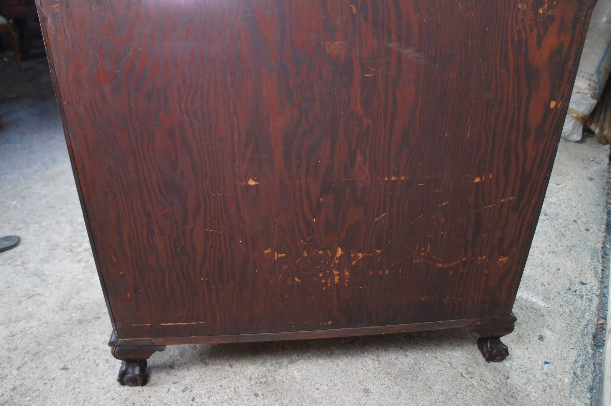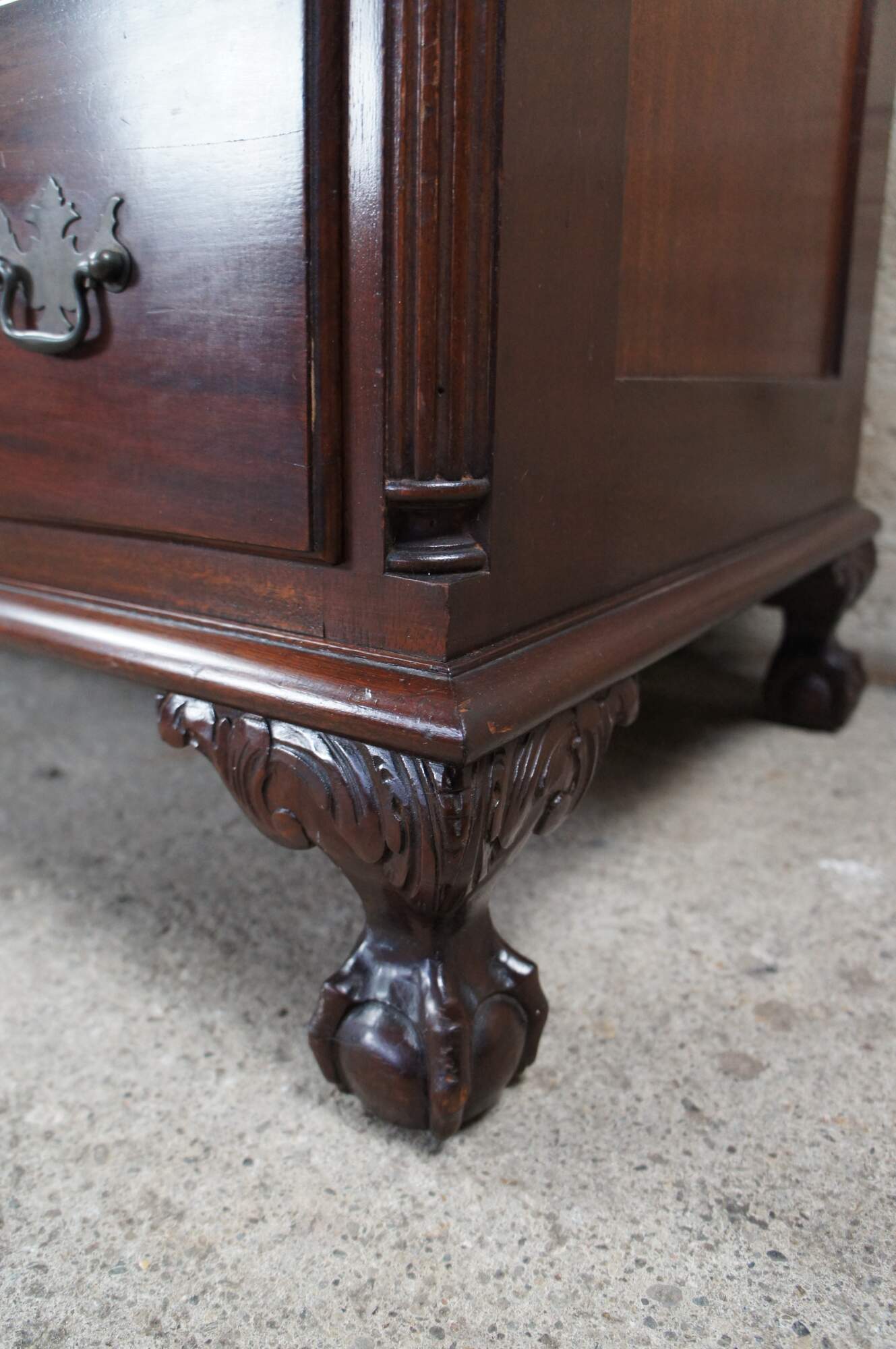 Vintage Feldenkreis Reproductions bachelors mule chest or trunk console. Made of mahogany and cedar featuring Chippendale styling with fluted columns, paneled sides, hinged lid that opens to large storage area, large bottom drawer, Federal style brass hardware, and ball and claw feet.