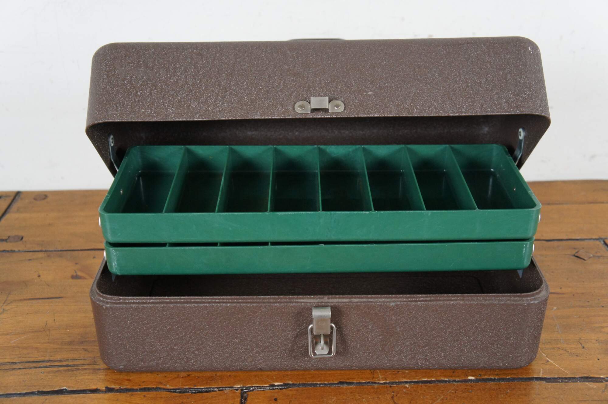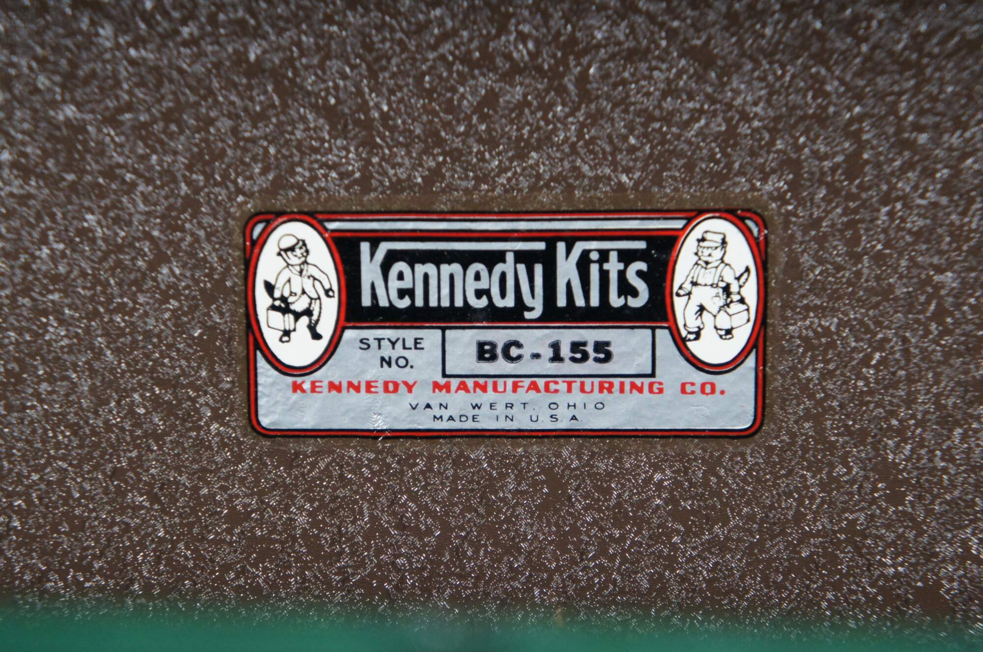 Mid 20th century Kennedy Kits fishing tackle box, style number BC-155. Brown textured metal construction with fixed plastic handle and lockable hasp / latch. Opens to two cantilevered green plastic divided trays. Made in USA by Kennedy Manufacturing Company of Van Wert, Ohio.