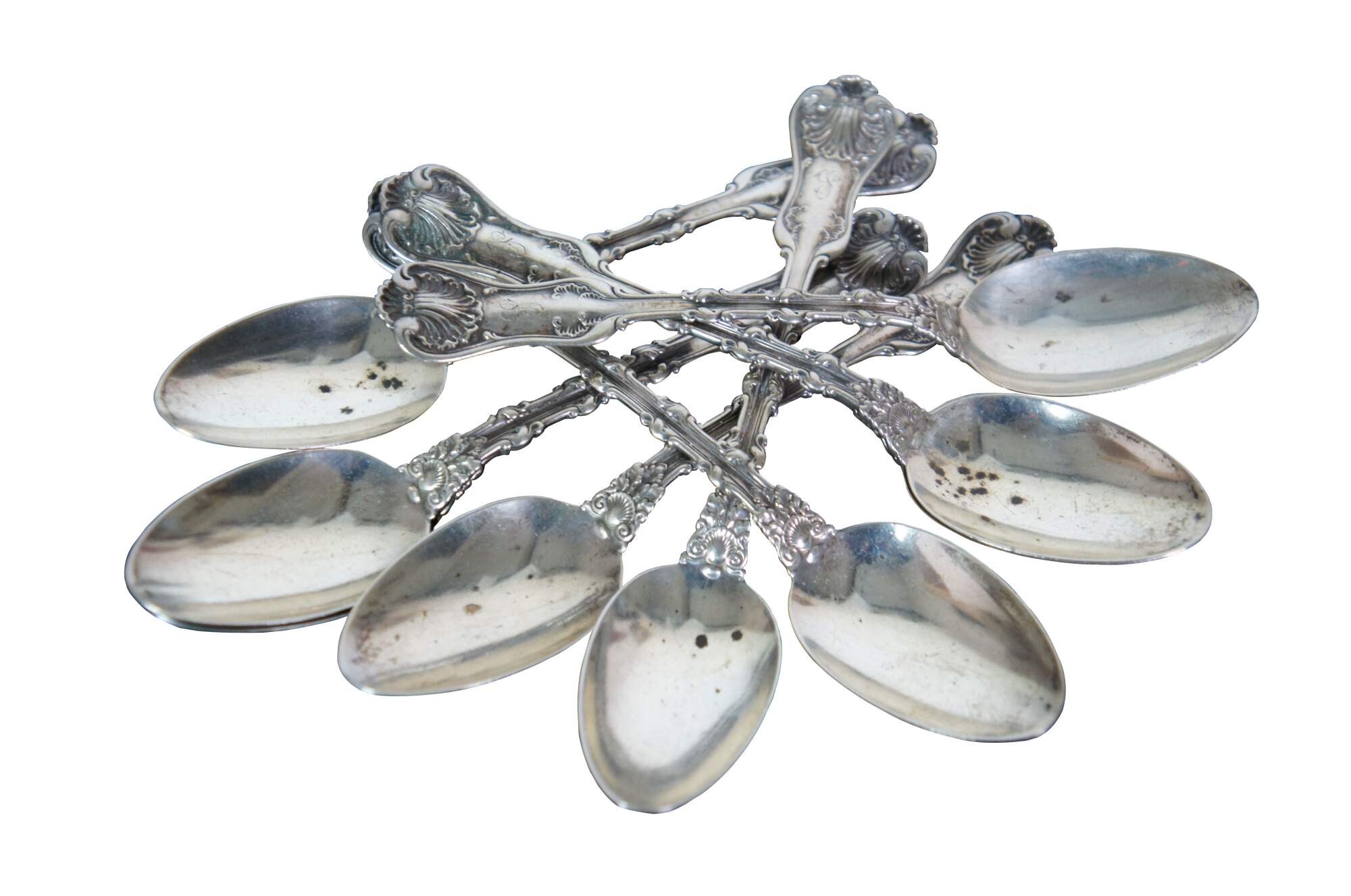 Set of 9 sterling silver tea spoons by the Whiting Manufacturing company in the Imperial Queen patten, introduced in 1893, featuring a scallop shell and foliate handle motif. Monogram S.