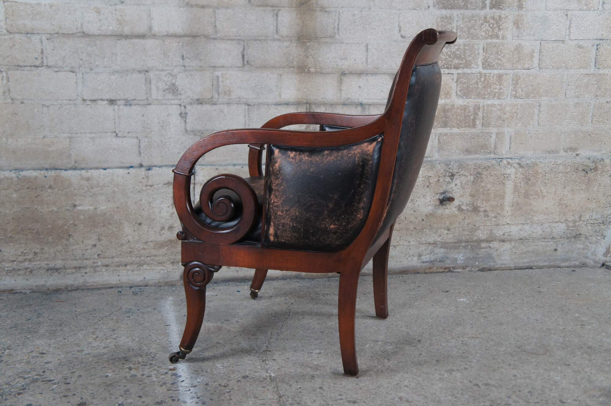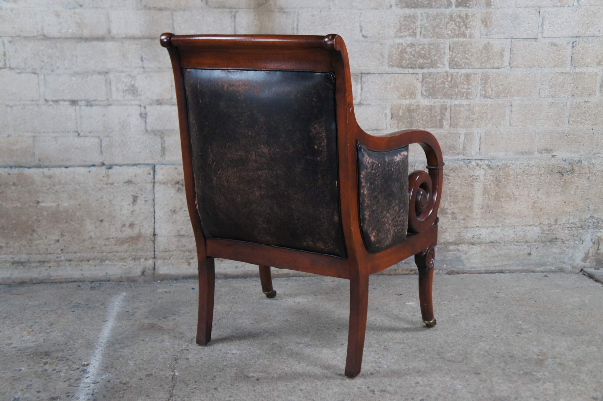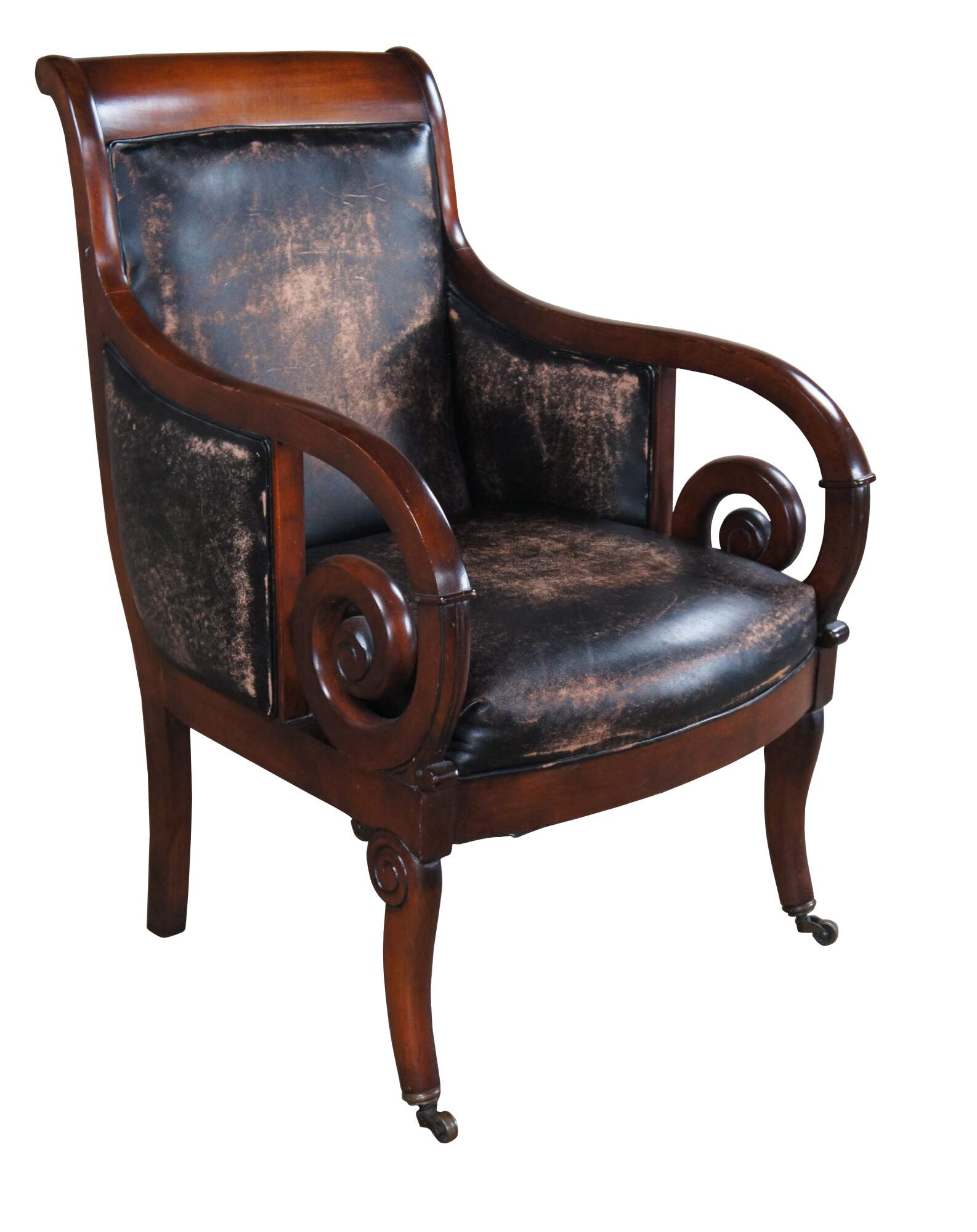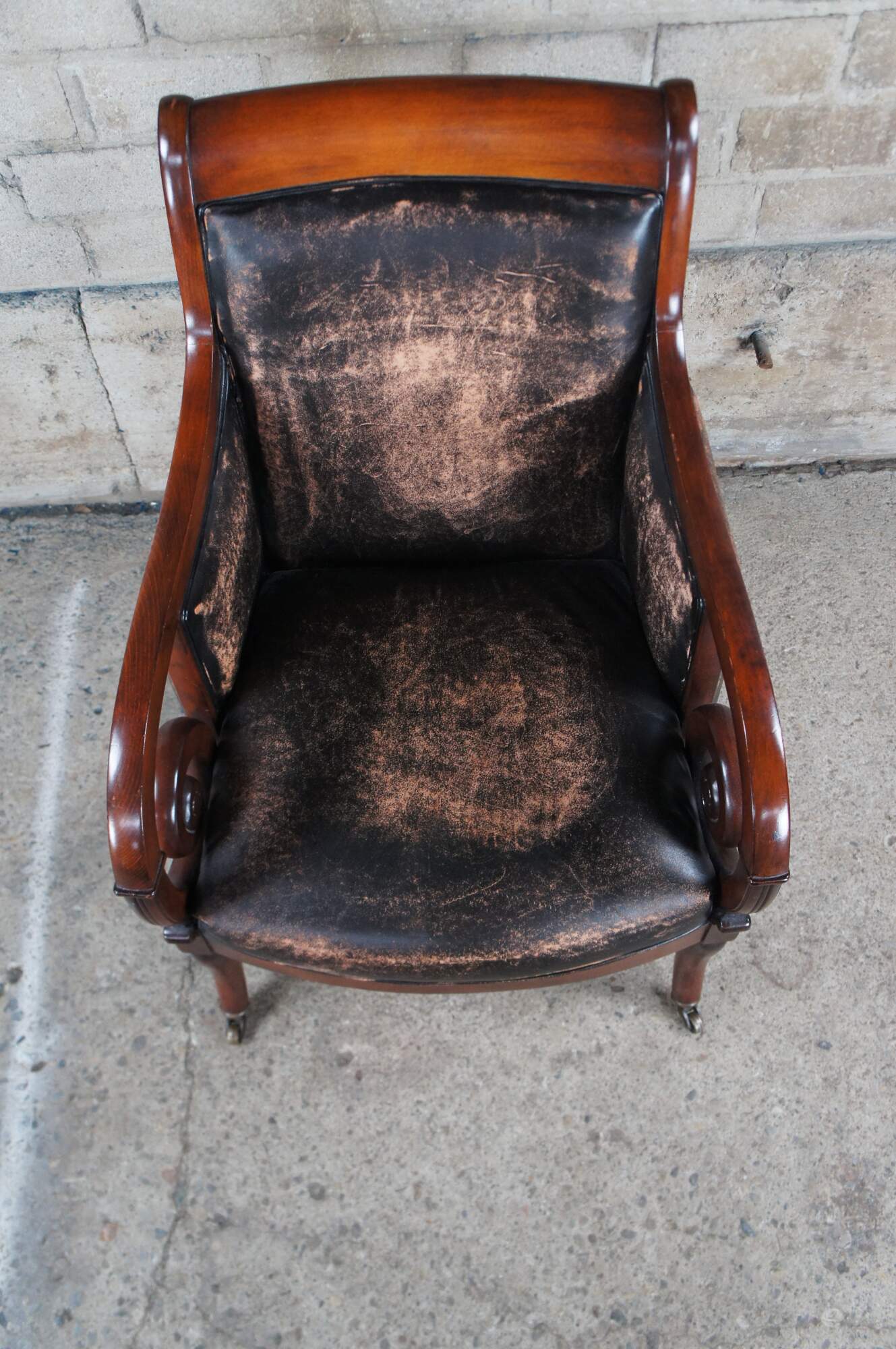 Rare vintage Henredon Furniture Jockey club / lounge / library / office elbow arm chair. Made of mahogany featuring Empire / Regency styling with scrolled arms and distressed leather upholstery.